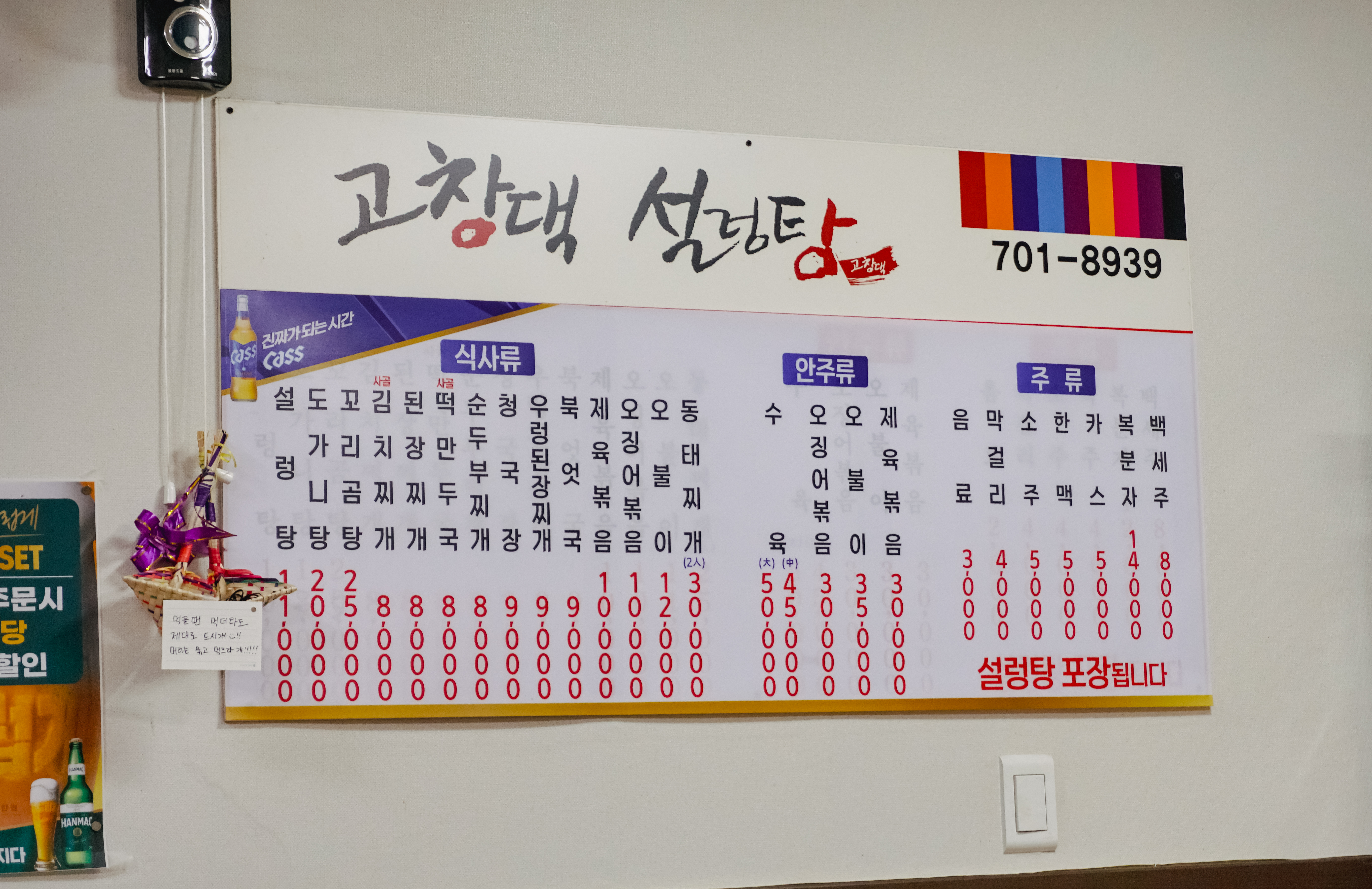 분당 서현동의 고창댁설렁탕 메뉴는 설렁탕, 도가니탕, 꼬리곰탕, 김치찌개, 된장찌개, 떡만두국, 순두부찌개, 청국장, 우렁된장찌개, 북엇국, 제육볶음, 오징어볶음, 오불이, 동태찌개, 수육 등이 있었습니다. 저는 오징어와 제육볶음이 섞인 '오불이'를 주문했습니다. 주문은 테이블에 있는 종이에 적어서 사장님께 전달하면 메뉴를 만들어주는 방식이었습니다.