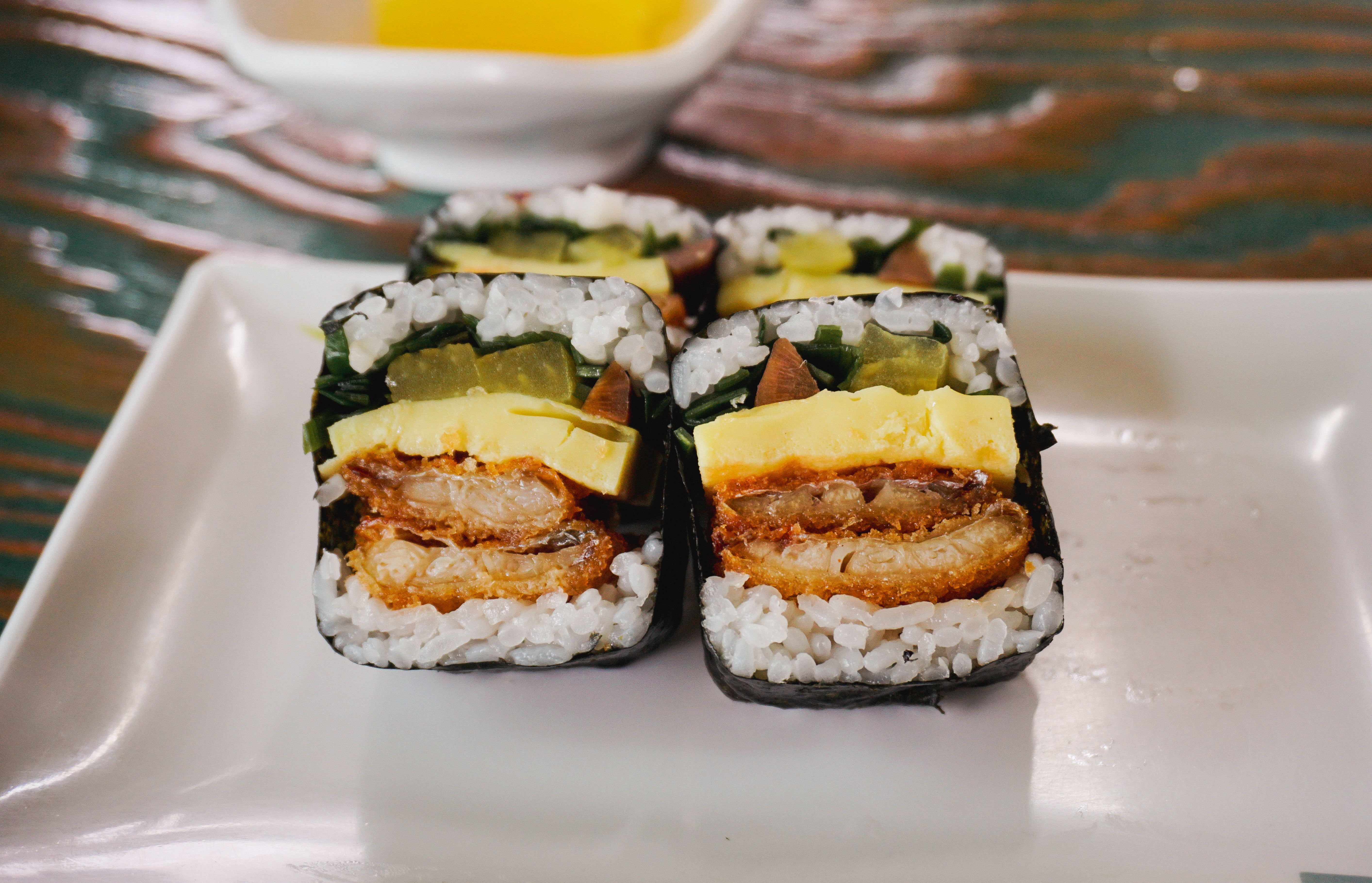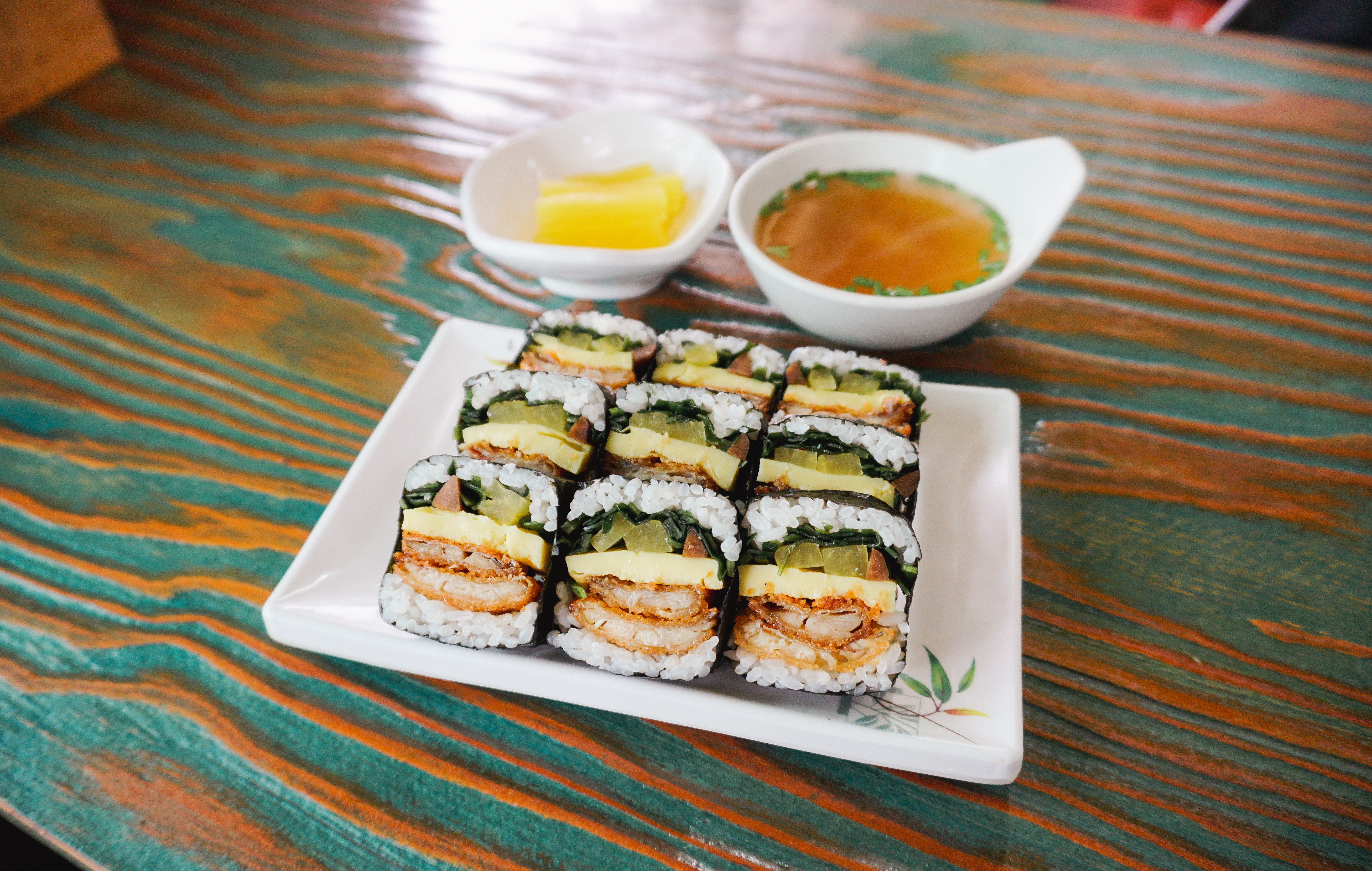 제주도 은갈치김밥의 모습은 이렇습니다. 메뉴는 단무지와 장국과 함께 나오고 있었고, 무스비 같은 네모난 김밥의 형태를 띠고 있었는데, 다시마와 갈치, 단무지, 계란, 당근이 들어간 김밥이었습니다.