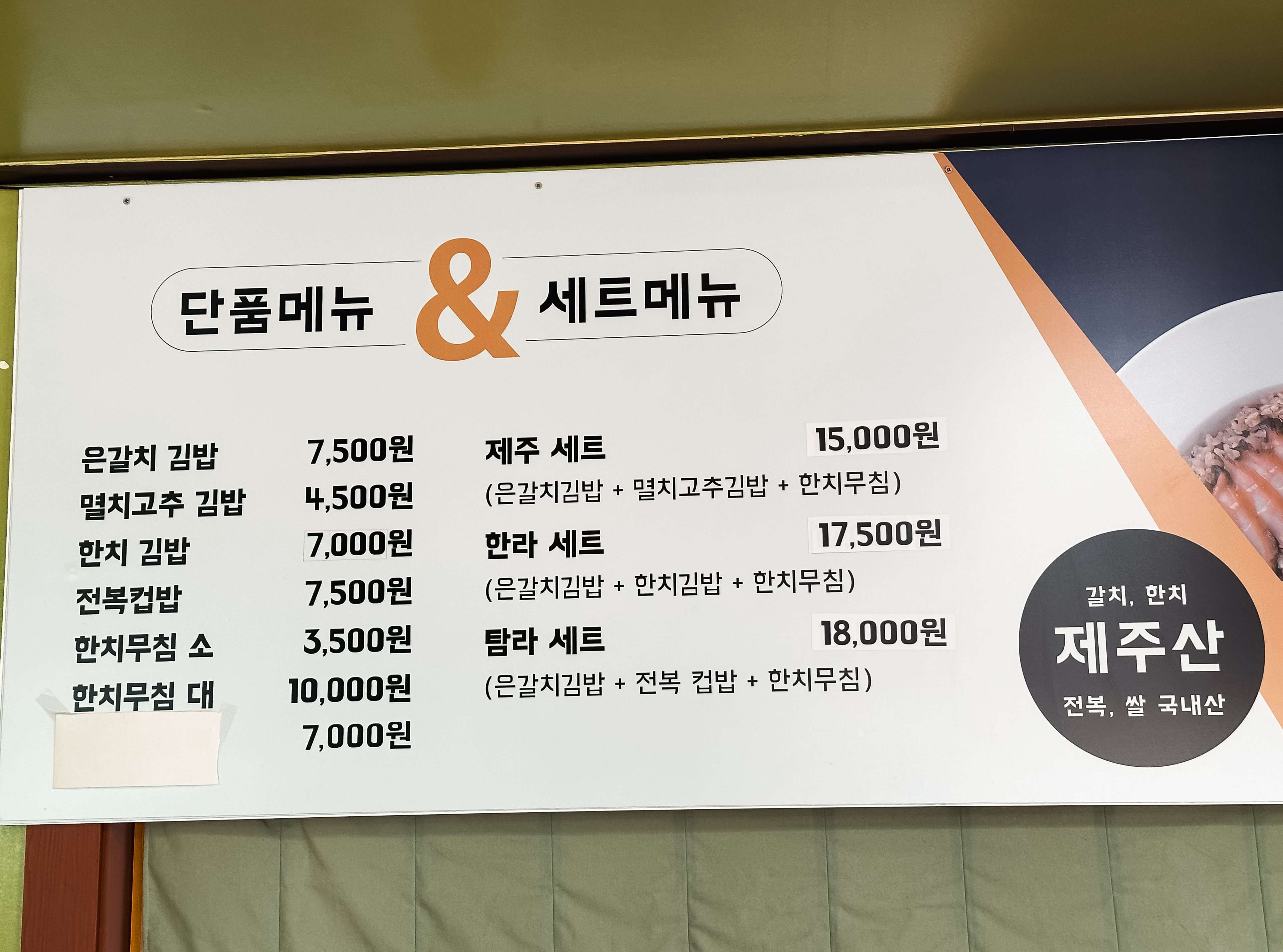 제주 은갈치김밥의 메뉴는 은갈치김밥, 멸치고추김밥, 한치김밥, 전복컵밥, 한치무침, 제주세트, 한라세트, 탐라세트 등이 있었습니다. 저는 이 가게의 메인 메뉴인 은갈치김밥을 주문했습니다.