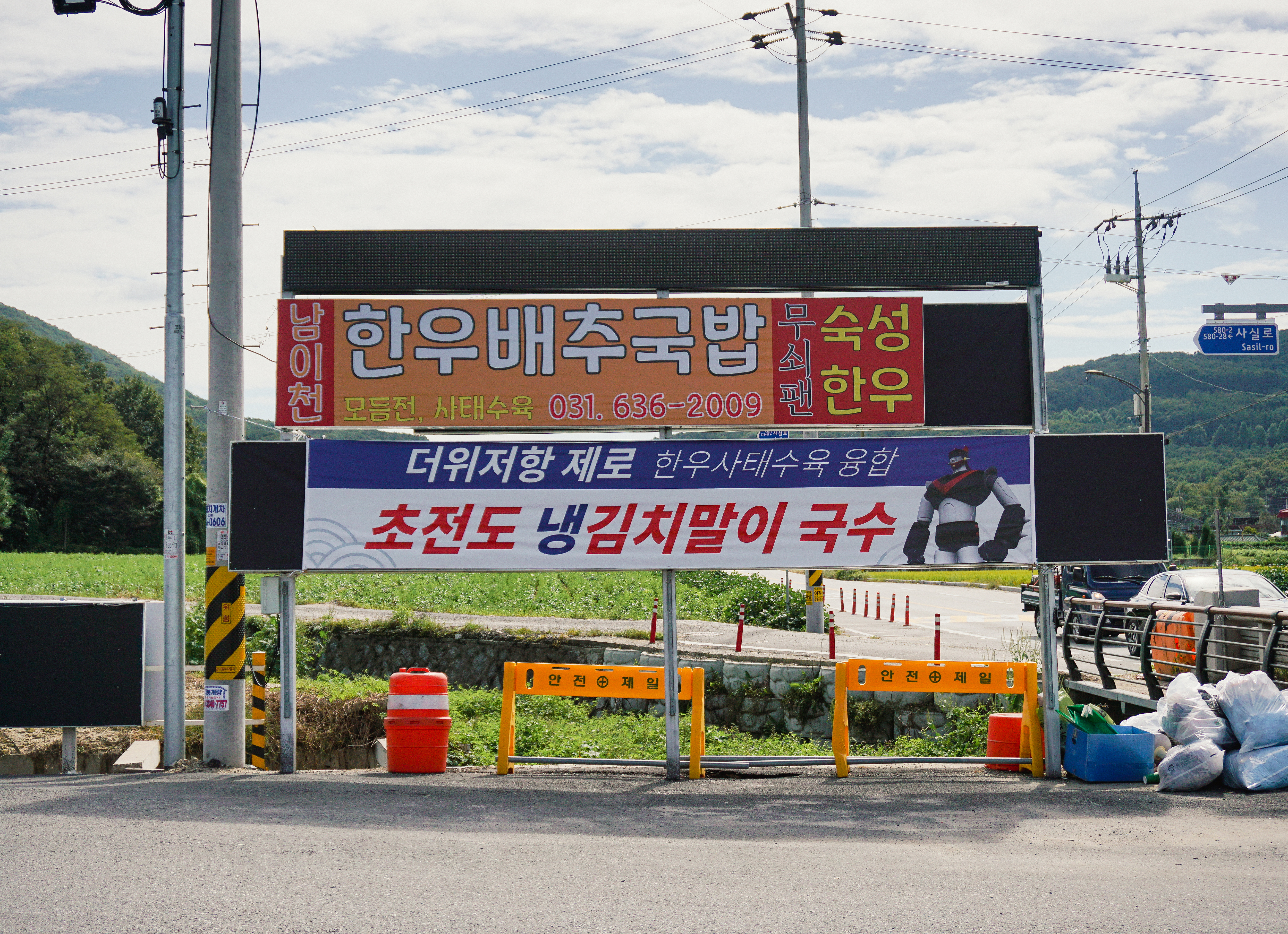 최근에 이천에서도 초전도를 이용한(?) 재미난 가게를 발견해서 여러분에게 소개해드리기 위해 포스팅을 하게 되었습니다. 이곳은 초전도 냉김치말이 국수(?)를 파는 가게로, '더위저항 제로 한우사태수육 융합' 이라는 문구가 적힌 현수막을 내걸고 장사를 하고 있었습니다.