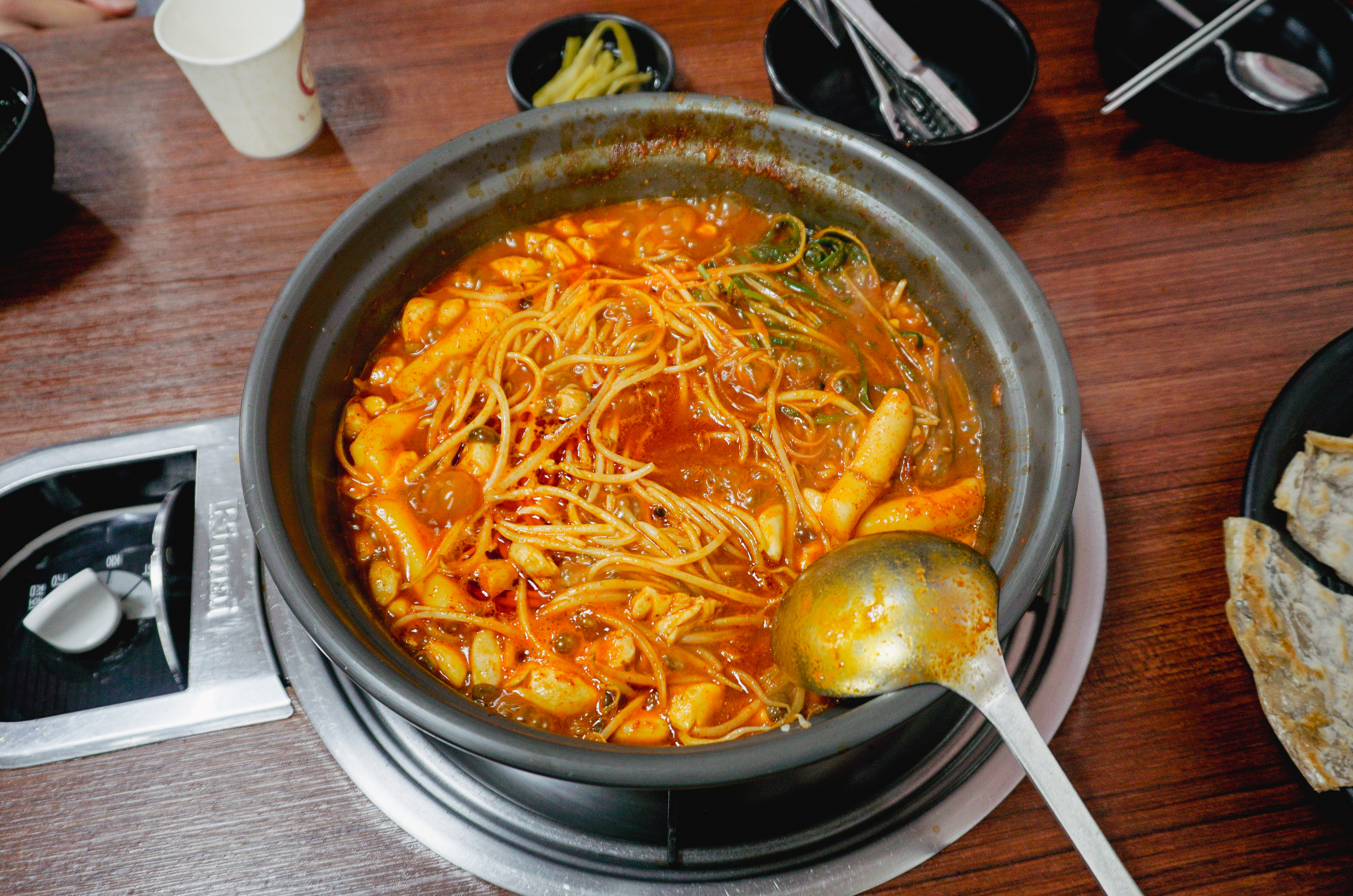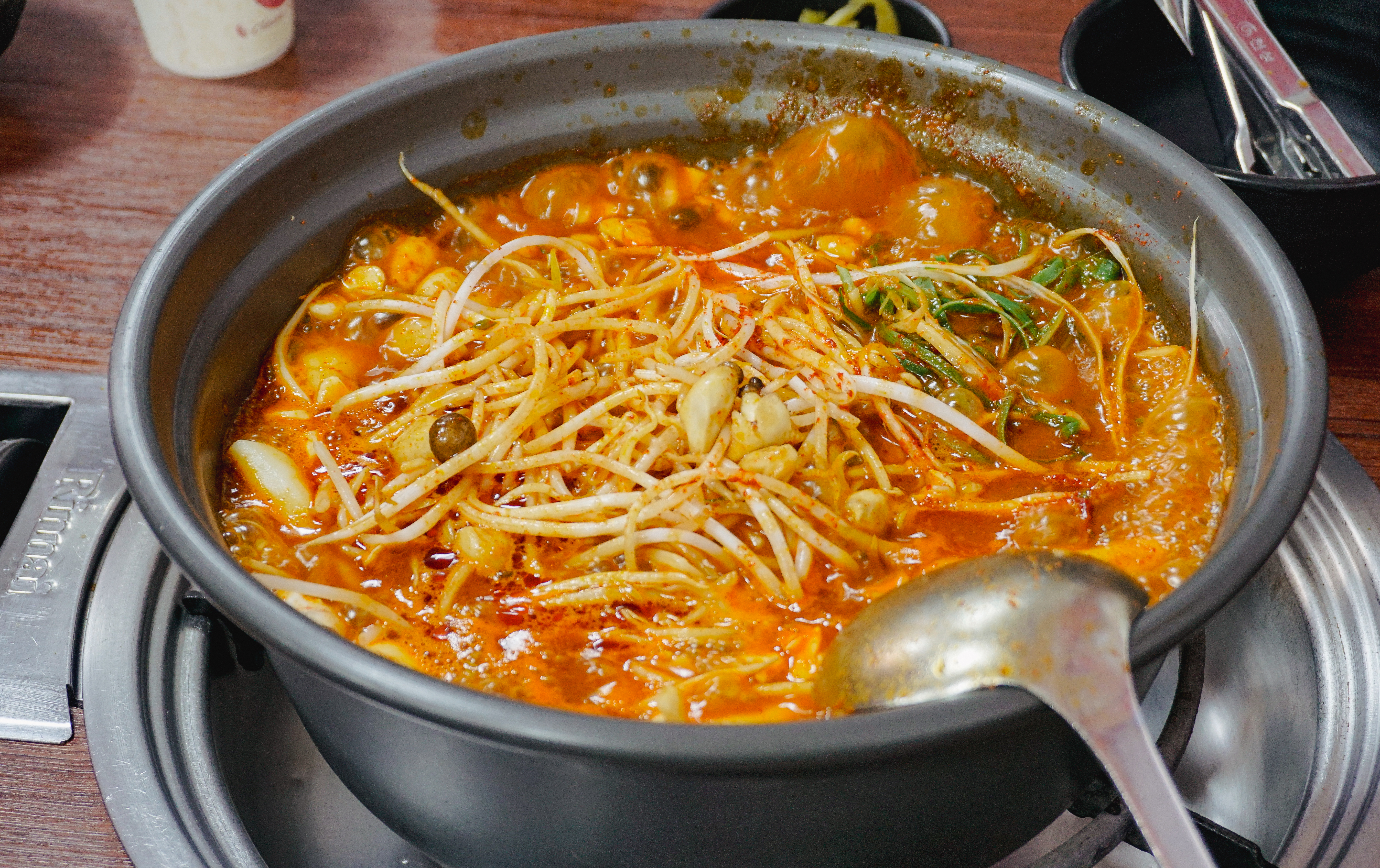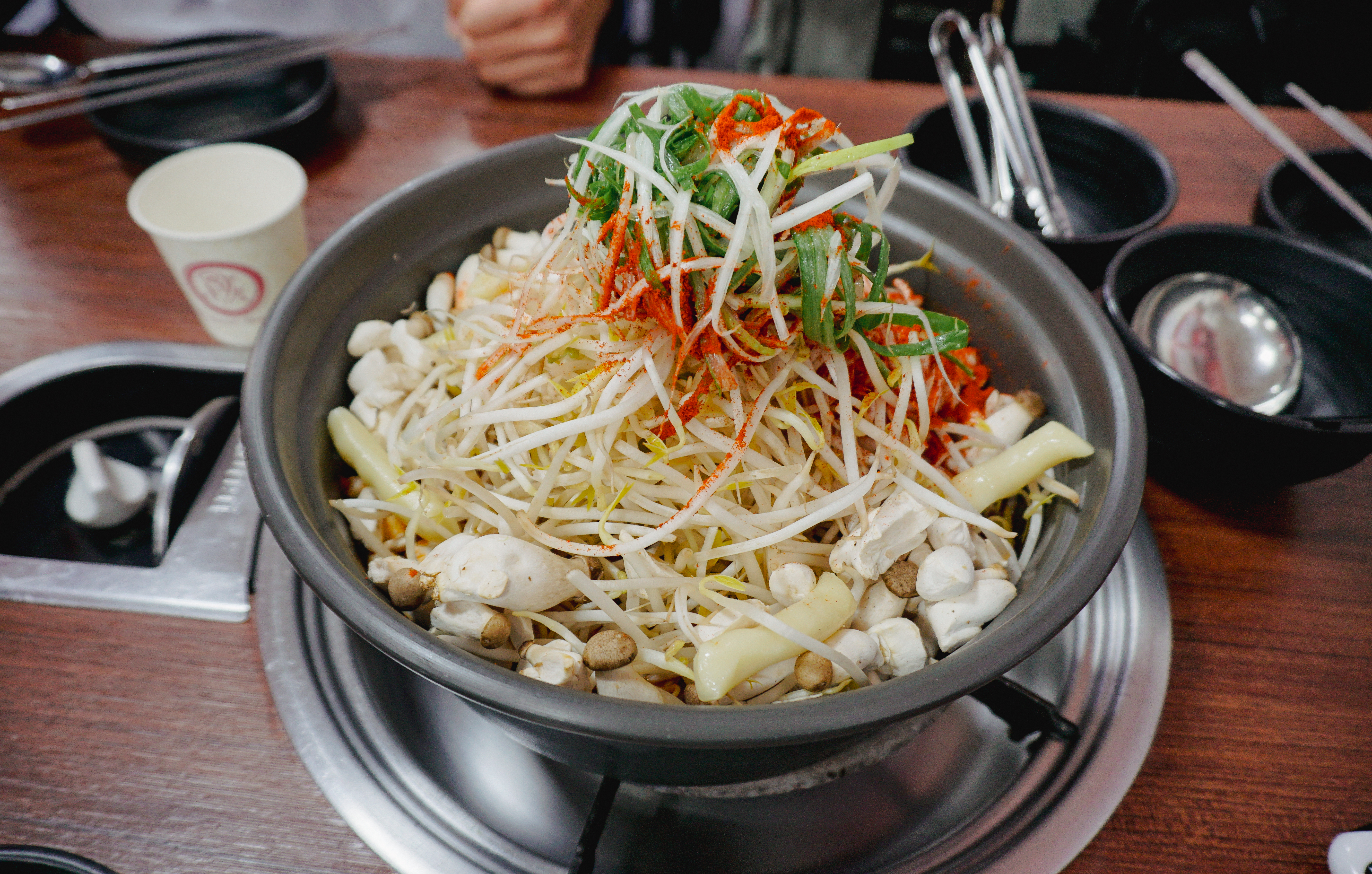 메뉴가 보글보글 끓기 시작했고, 타이머가 울리면 약불로 줄여서 떡과 버섯, 숙주나물을 먼저 건져먹은 다음 등갈비를 꺼내서 먹으면 되었습니다. 등갈비는 적당히 매콤해서 먹기 좋았고, 숙주나물이랑 버섯과 함께 먹으니 맛이 좋더라고요. 참고로, 숙주나물은 중간중간 계속 리필을 해주고 있었습니다.