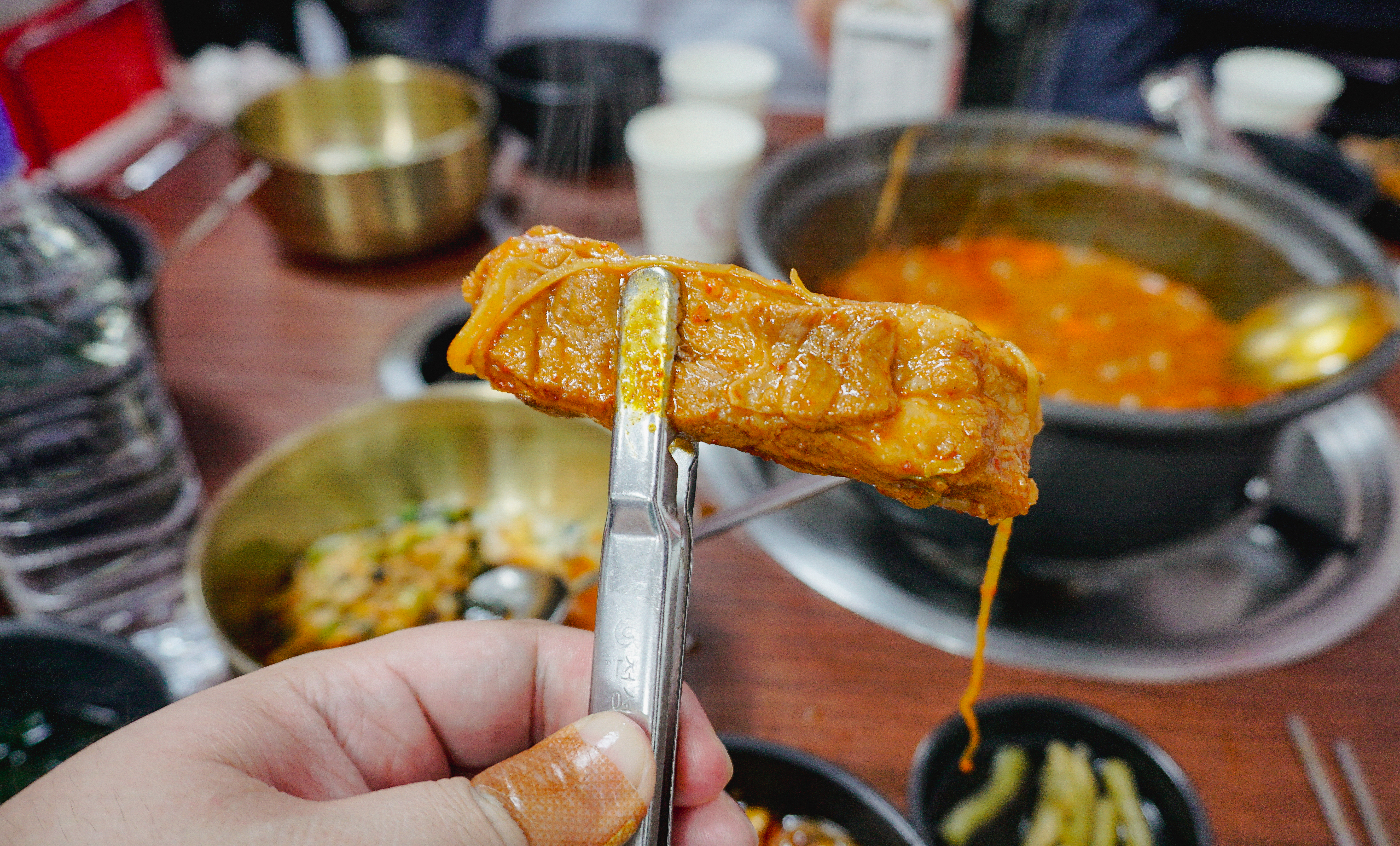 라면사리를 추가해서 양념에 넣어 같이 먹기도 했는데, 사장님이 갈비뼈 바르는 방법을 시연하러 오셨더라고요. 갈빗대 사이에 젓가락을 넣고 쓱~ 밀어주니 금세 살과 뼈가 분리되었고, 안내된 방법대로 메밀전에 싸서 주셨는데 국물에 담갔다가 빼서 먹으니 더 맛있더라고요.