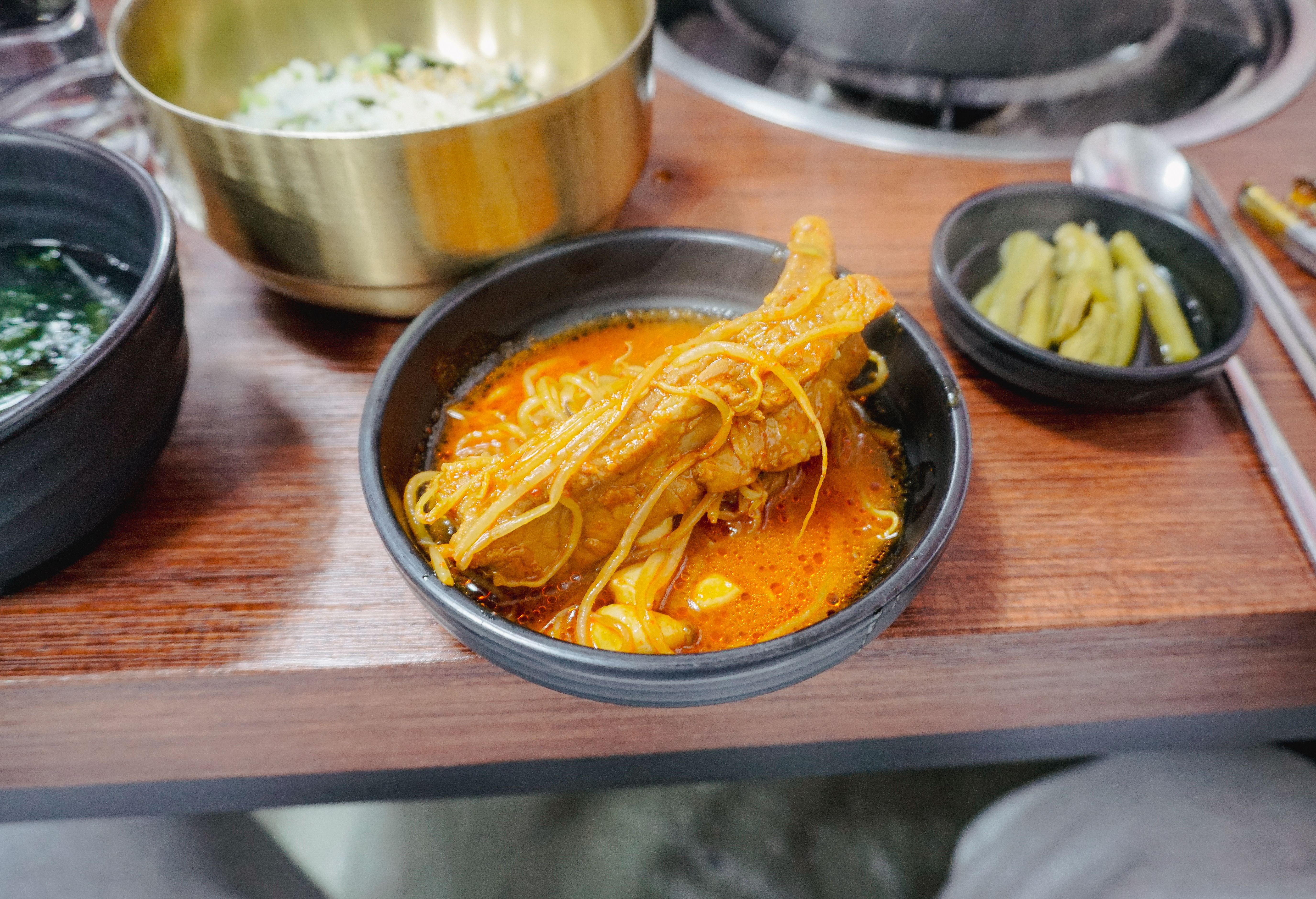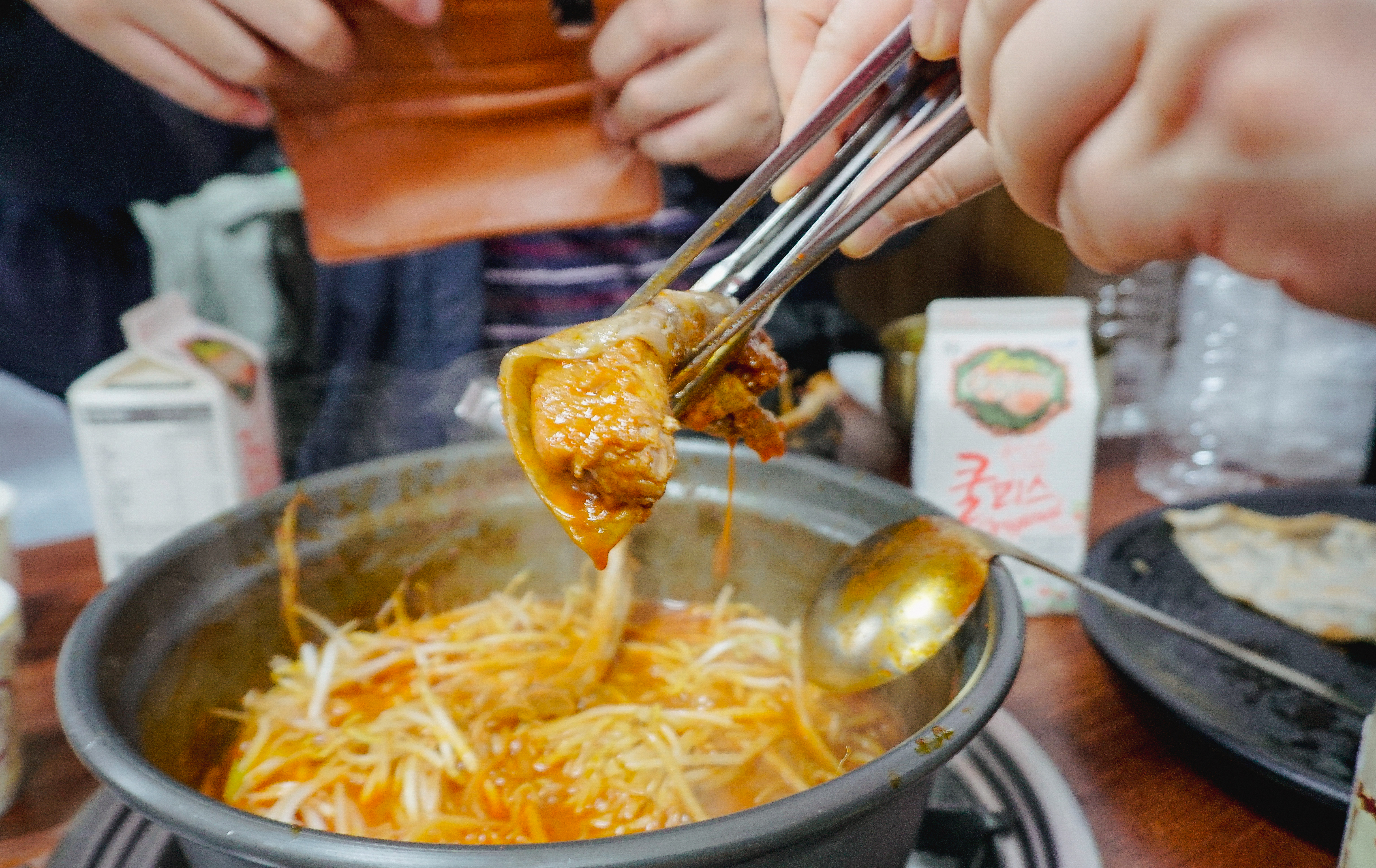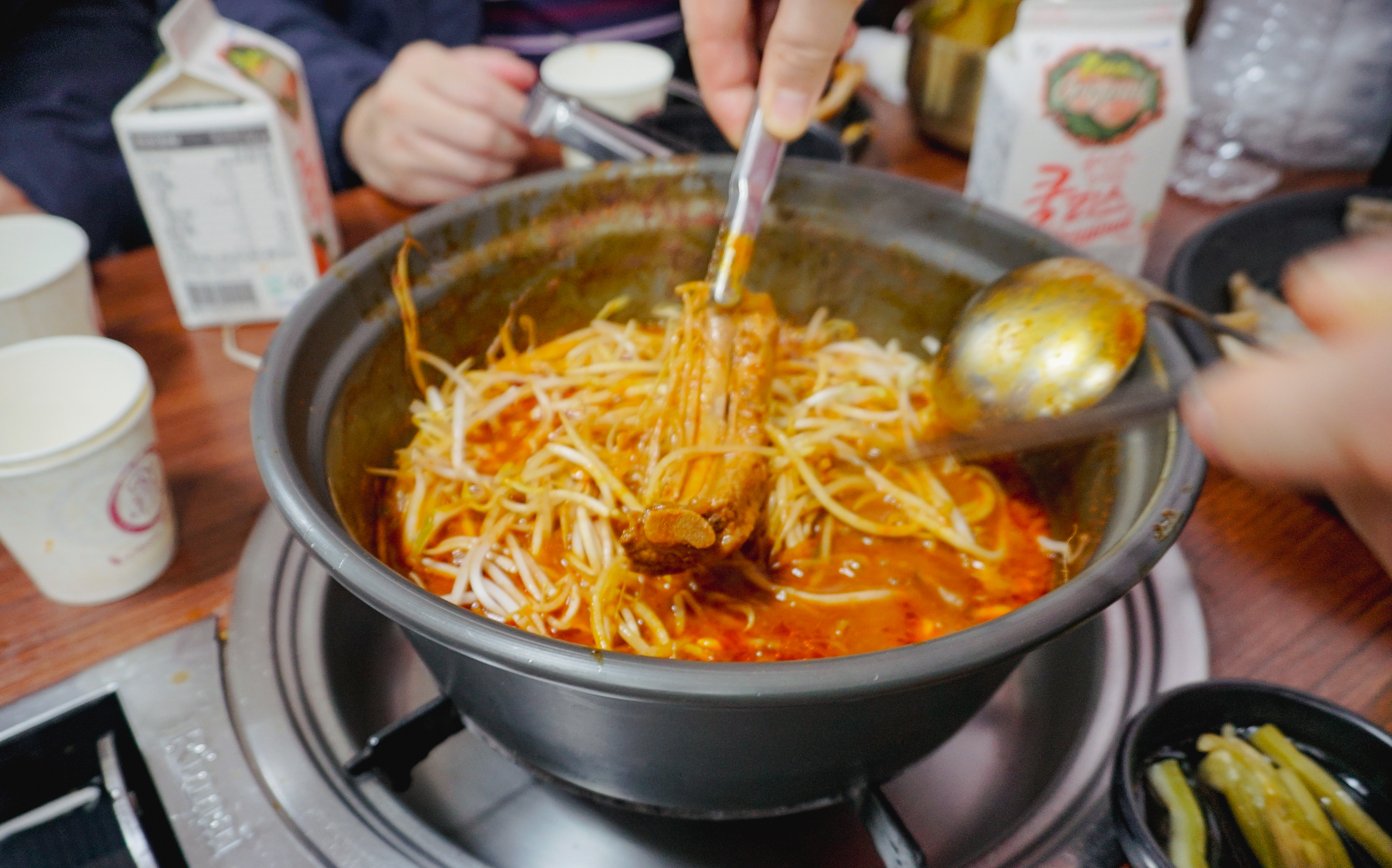 메뉴가 보글보글 끓기 시작했고, 타이머가 울리면 약불로 줄여서 떡과 버섯, 숙주나물을 먼저 건져먹은 다음 등갈비를 꺼내서 먹으면 되었습니다. 등갈비는 적당히 매콤해서 먹기 좋았고, 숙주나물이랑 버섯과 함께 먹으니 맛이 좋더라고요. 참고로, 숙주나물은 중간중간 계속 리필을 해주고 있었습니다.