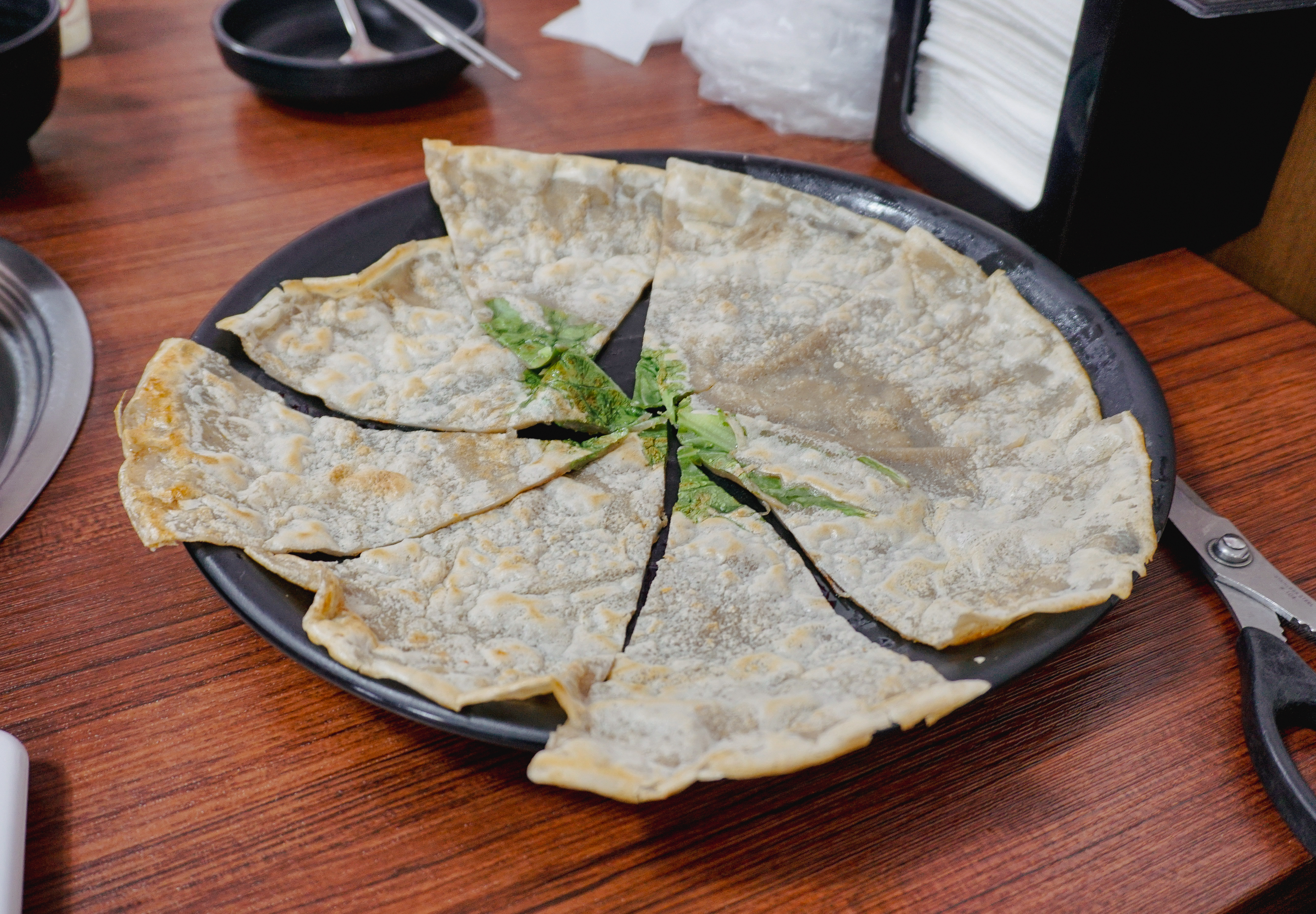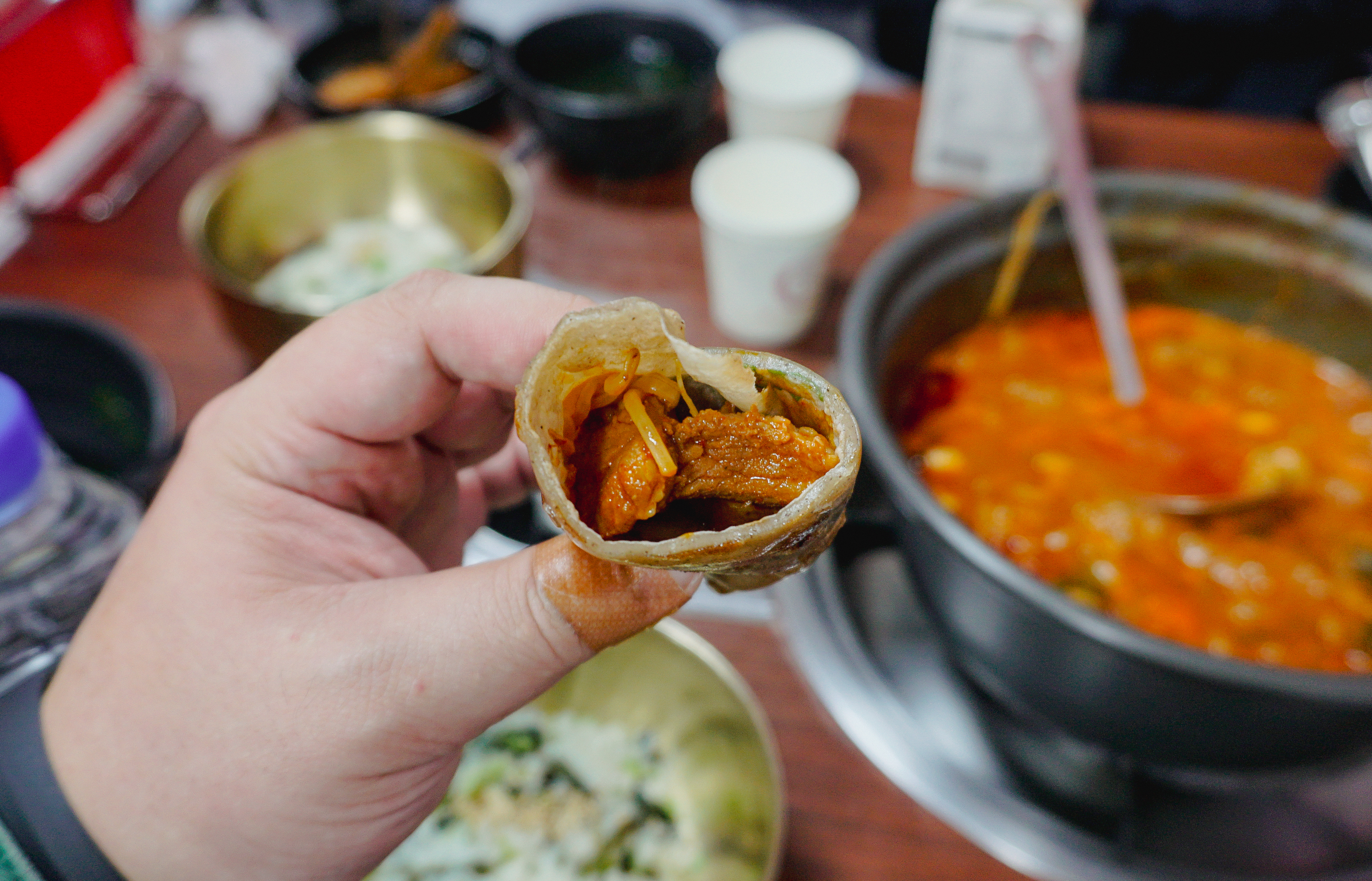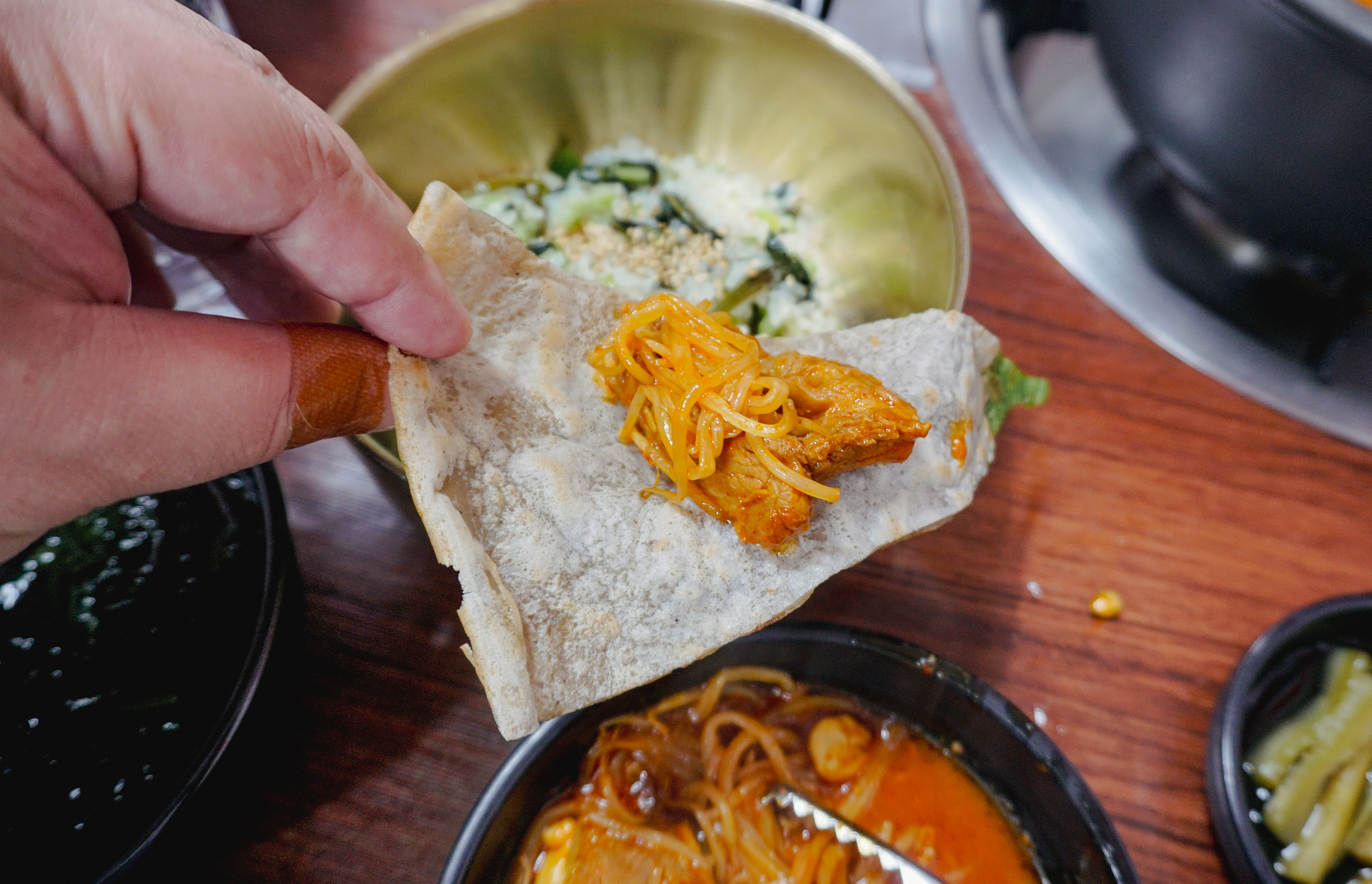 가게에서 안내하는 대로 등갈비를 메밀전에 싸서 먹어보았습니다. 사실 최근에 일을 하다가 손가락이 찢어지는 바람에 제대로 힘을 줄 수가 없었는데, 어찌어찌 사진을 찍었습니다. 메밀전이랑 등갈비찜이랑 같이 싸서 먹는 것도 좋았지만, 저는 개인적으로 그냥 먹는 게 더 편하더라고요. 괜히 손에 묻고 그래서 번거롭고요.