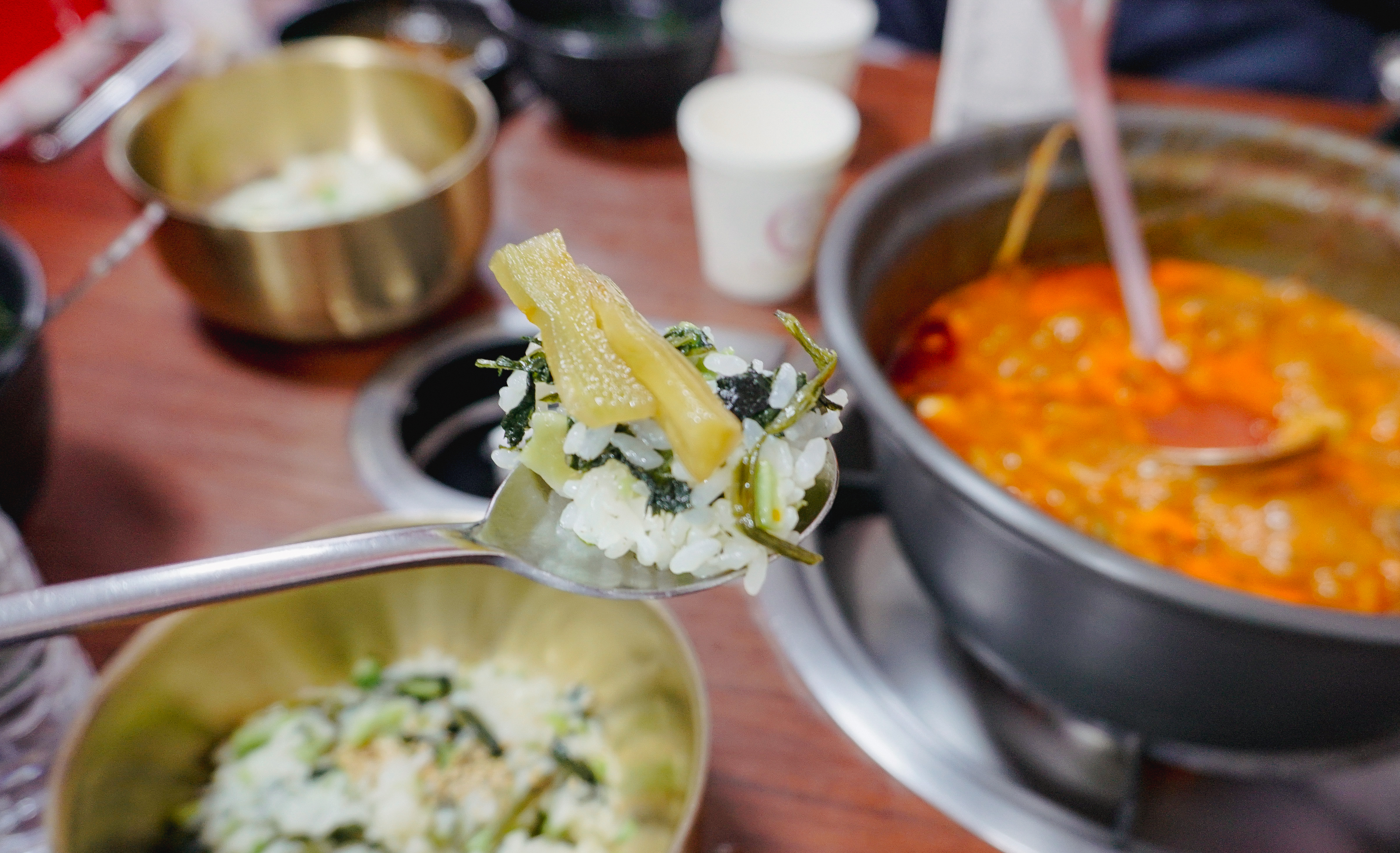먹다가 황제꼬소밥이라고 곤드레밥이 나왔는데, 장아찌와 함께 먹으니 아삭한 식감과 고소한 맛이 먹기에 좋았고, 갈비찜의 매운맛을 중화시켜 줘서 괜찮더라고요. 그래도 갈비찜 양념에 같이 비벼먹으니깐 더 맛있었습니다.