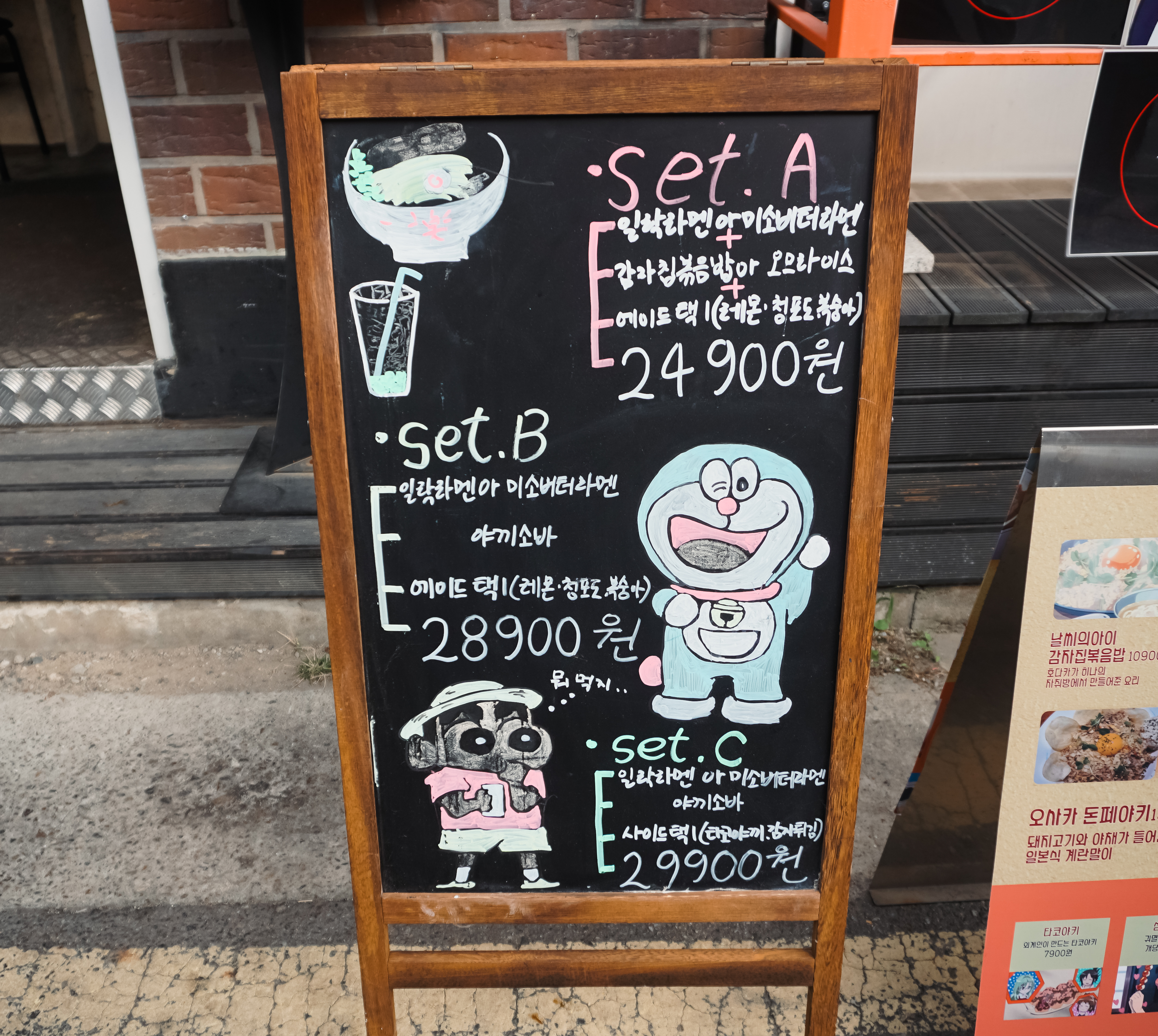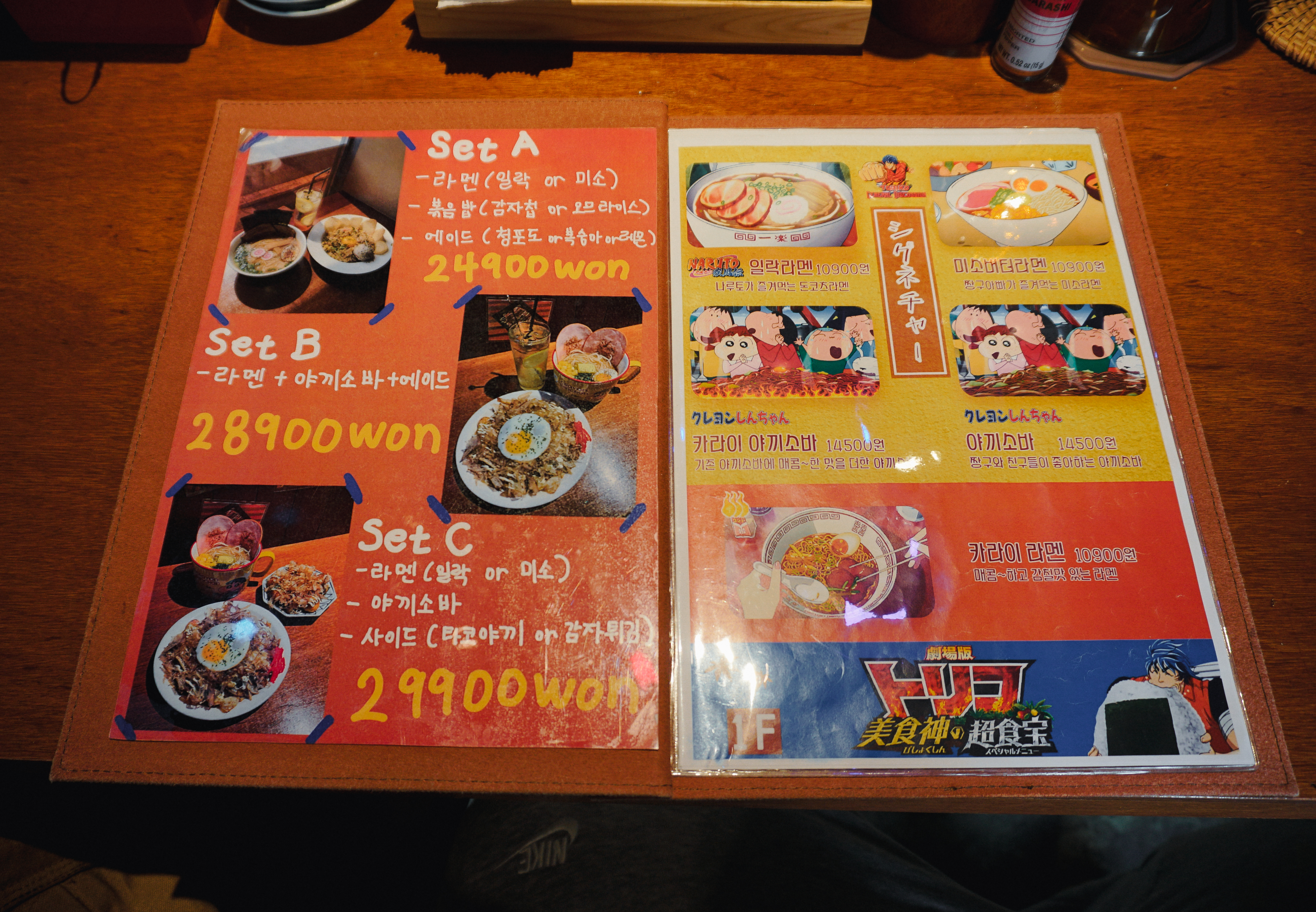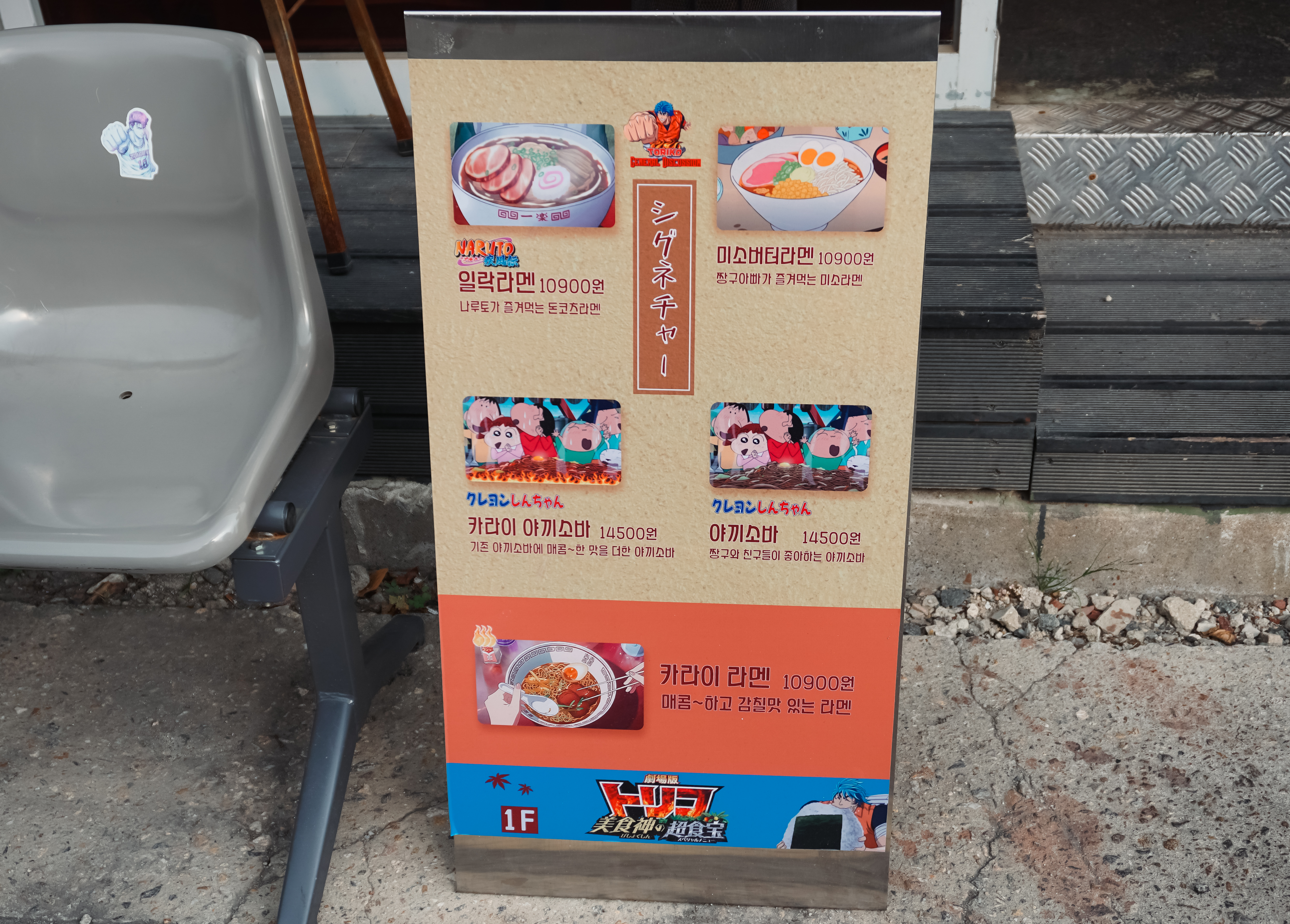 가게 밖에도 메뉴판이 있었는데, 메뉴들이 어떤 애니메이션(만화)에 나왔는지 알려주는 안내가 있었고, 세트메뉴들에 대한 소개가 있었습니다. 영업시간은 월~목요일 11:30~21:00 까지이며, 금~일요일 12:00~22:30 까지였습니다. 브레이크타임은 15:00~17:00 까지입니다.