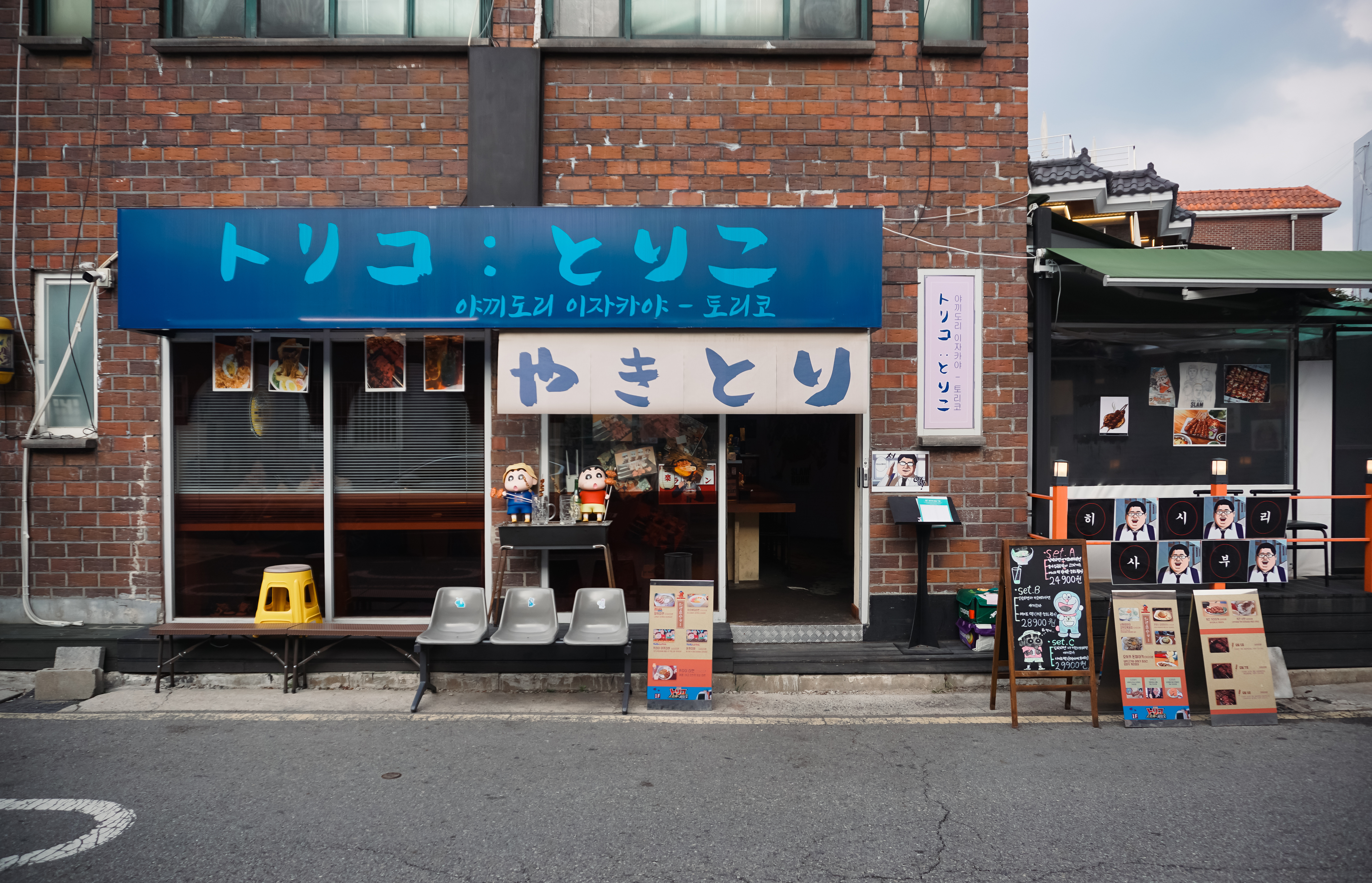 토리코(야끼도리 이자카야 토리코)는 경기 수원시 팔달구 장안동 316-3, 1층에 위치해 있었습니다. 가게 앞에는 귀여운 캐릭터 인형과 함께, '오랜만' 이라는 뜻을 갖고 있는 '히사시부리(久しぶり)' 라는 일본어 문구가 적혀있었습니다. 저는 특히 야키토리를 들고 있는 짱구가 너무 귀엽더라고요.
