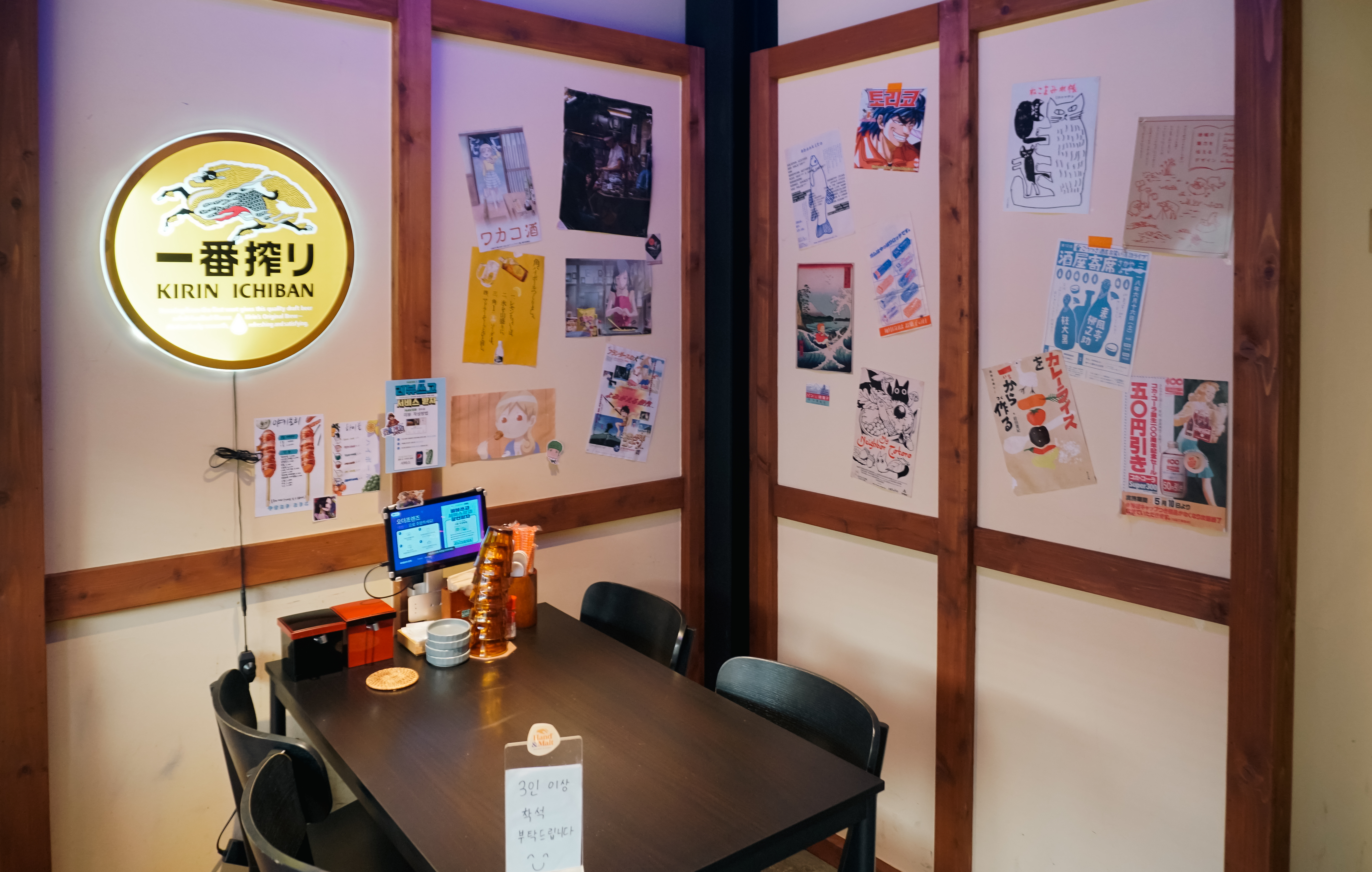 토리코 가게는 이자카야(선술집) 답게 테이블이 바(Bar) 형태로 되어 있었고, 조용한 식사를 하시고 싶은 분은 조그만 방이 따로 있었습니다. 매장 곳곳에 컨셉에 맞게 애니메이션 캐릭터의 장식과 데칼(스티커)이 붙어있었습니다.