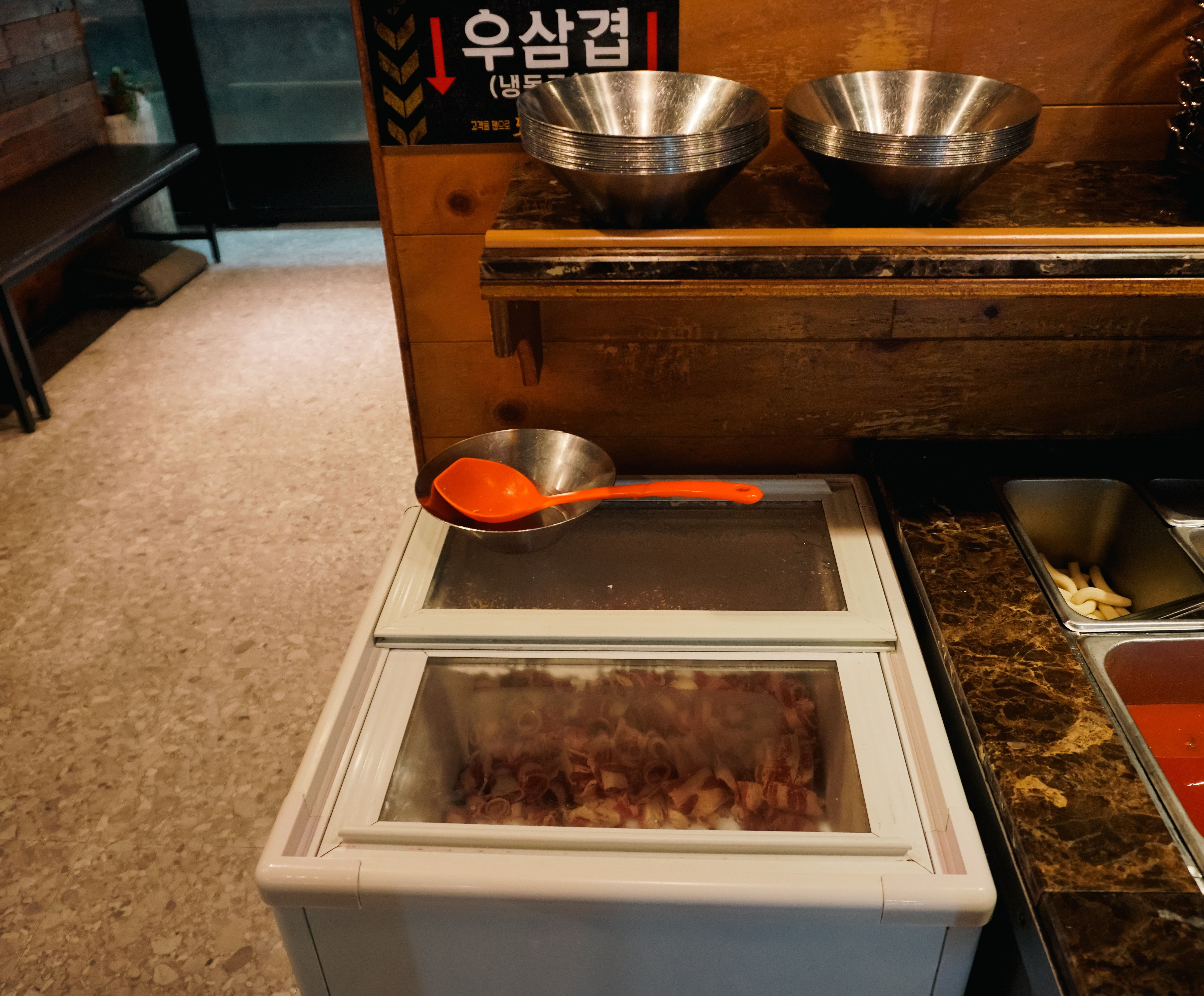 포크팬 고기뷔페는 생삼겹, 우삼겹, 목살, 훈제오리, 생막창, 소시지, 만두, 어묵 등을 고를 수 있었습니다. 쌈채소와 버섯, 마늘, 샐러드, 양파, 콩나물 등을 고를 수 있는 샐러드바도 있었습니다. 그밖에 어묵탕과 된장찌개, 떡볶이를 만들 수 있는 코너도 있었고 신라면과 너구리를 끓여 먹을 수 있도록 구비해 두었더라고요.