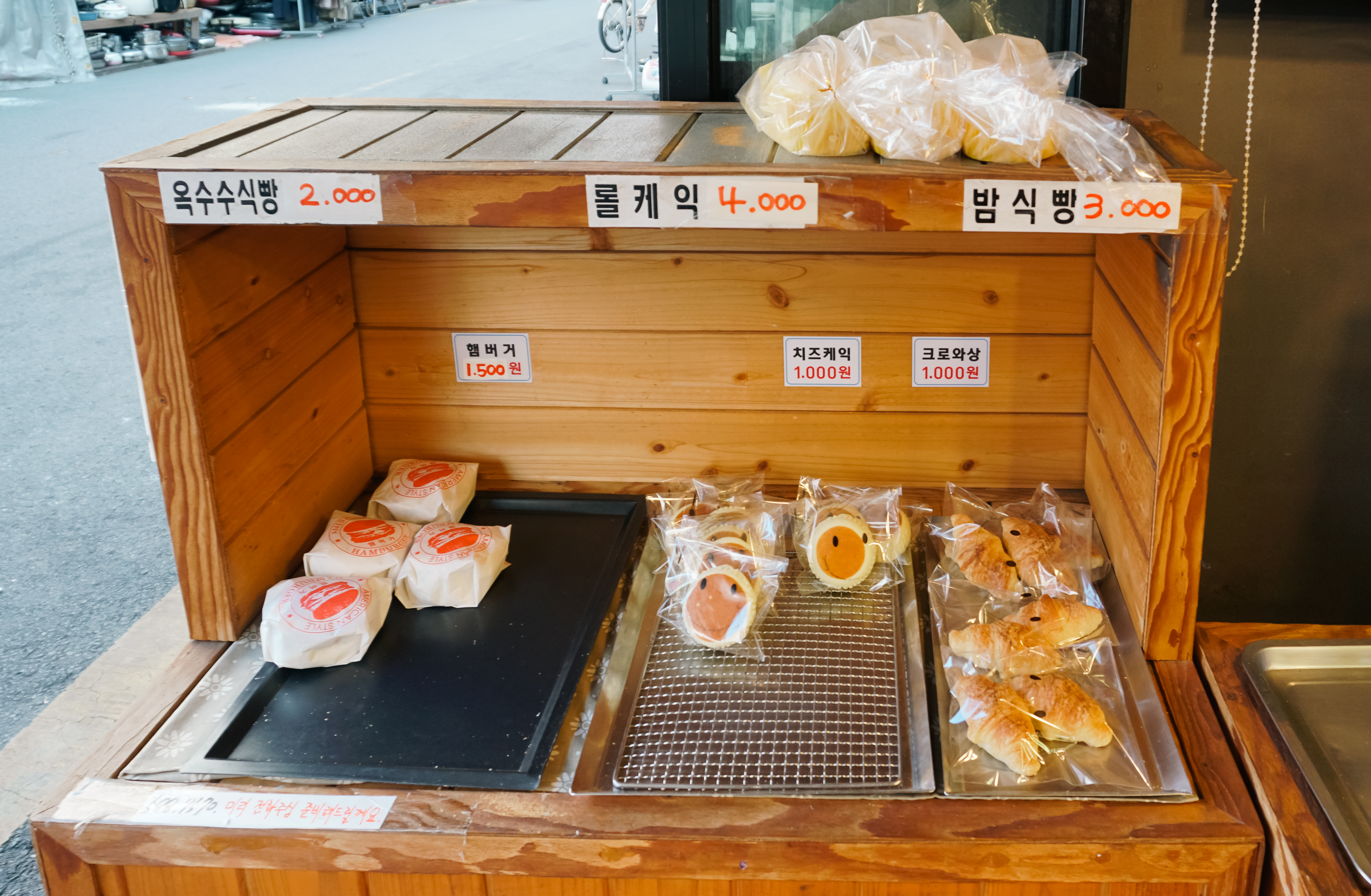 봉하빵은 500원 빵이 있다고 해서 1~ 2가지로 생색내는 것이 아닌, 12종 정도의 빵을 500원에 팔고 계셨습니다. 500원 품목에는 단팥빵, 소보로빵, 설록앙금(밤앙금), 마늘빵, 완두앙금, 카스테라, 슈크림, 크림빵, 모카빵, 소시지빵, 단팥도너츠, 옥수수꽈배기가 있었고, 그 밖에도 800원부터 최대 4,000원까지 부담스럽지 않은 가격에 판매하고 있었습니다.