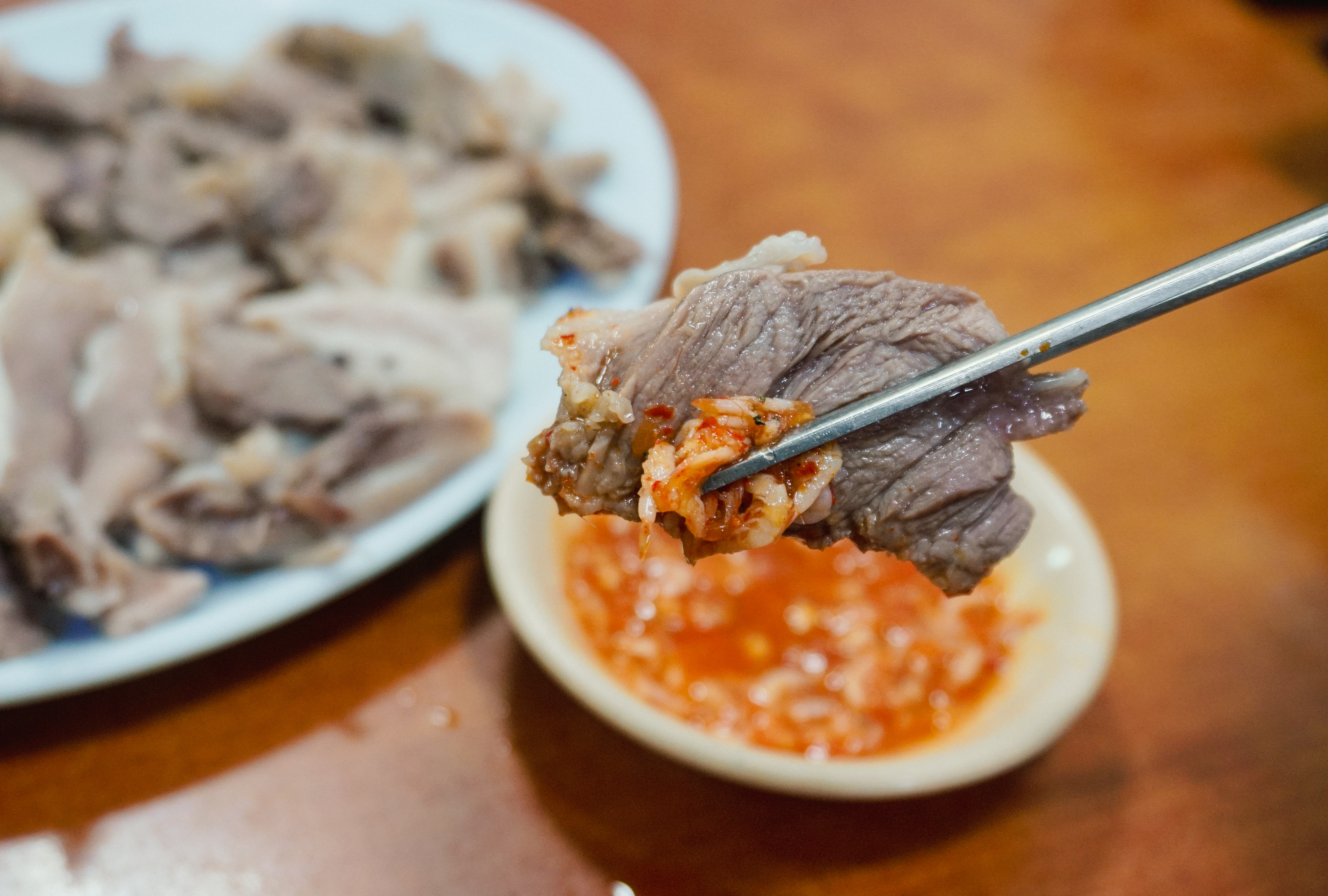 순대국밥의 모습은 이렇습니다. 돼지 머리 고기가 들어간 순대국밥으로 고기가 수육에 나오는 고기만큼 적당히 도톰하게 썰어져 들어갔고, 양은 많지도 적지도 않은 적당한 수준이었습니다. 국물은 담백하고 심심한 편이었는데, 같이 내어주신 새우젓과 다진 양념 양념장으로 간을 맞춰서 먹었습니다.
