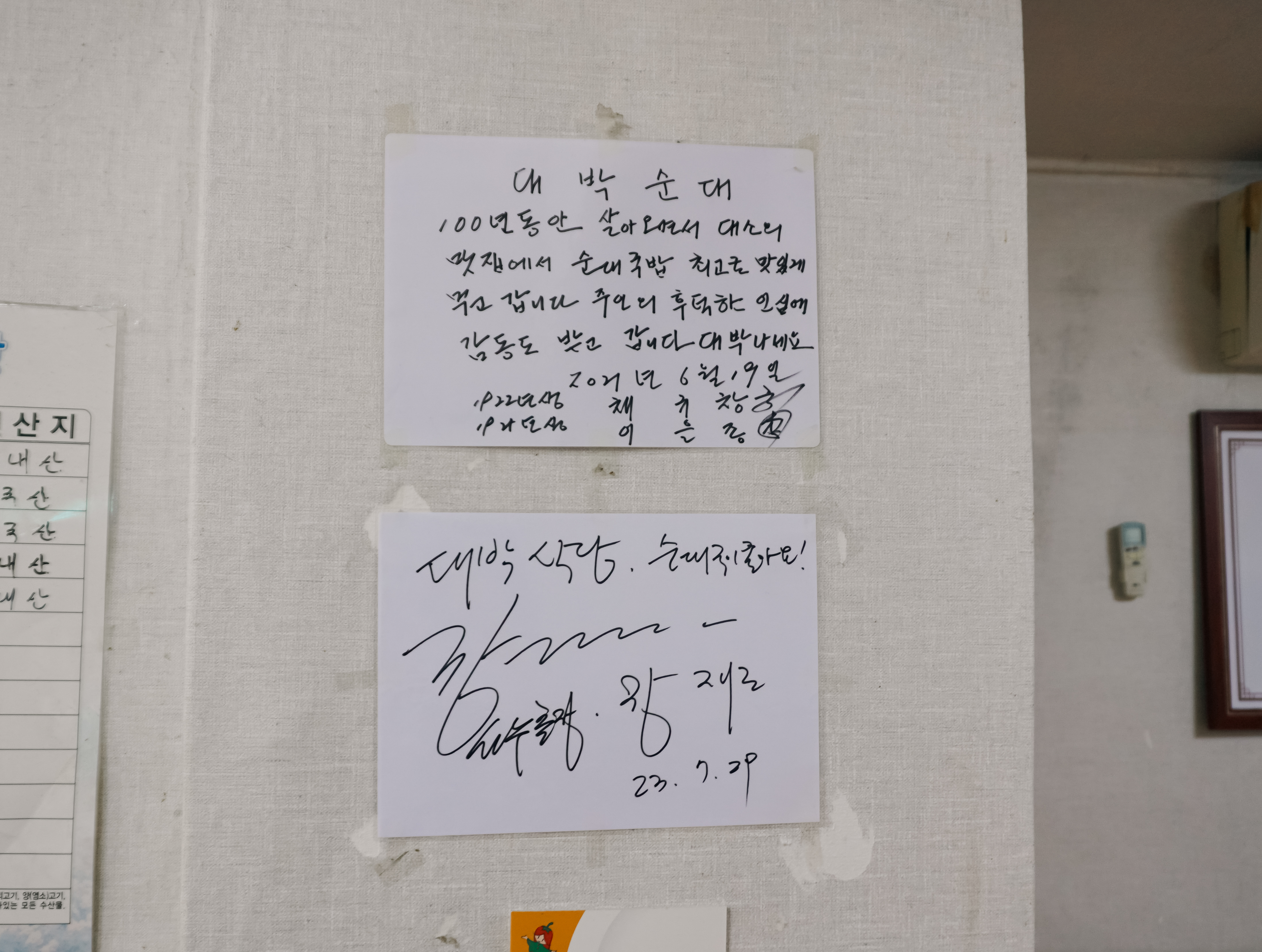 음성군 대소면에 위치한 대박순대에서 100세가 넘으신 어르신 두 분의 친필 서명도 보고, 실제로 담백하고 고소한 순댓국도 맛있게 먹고 나왔습니다. 워낙 작은 크기의 동네이다 보니 먹을만한 식당이 많지 않았는데, 오랜만에 맛있게 식사하고 온 식당인 것 같습니다.
