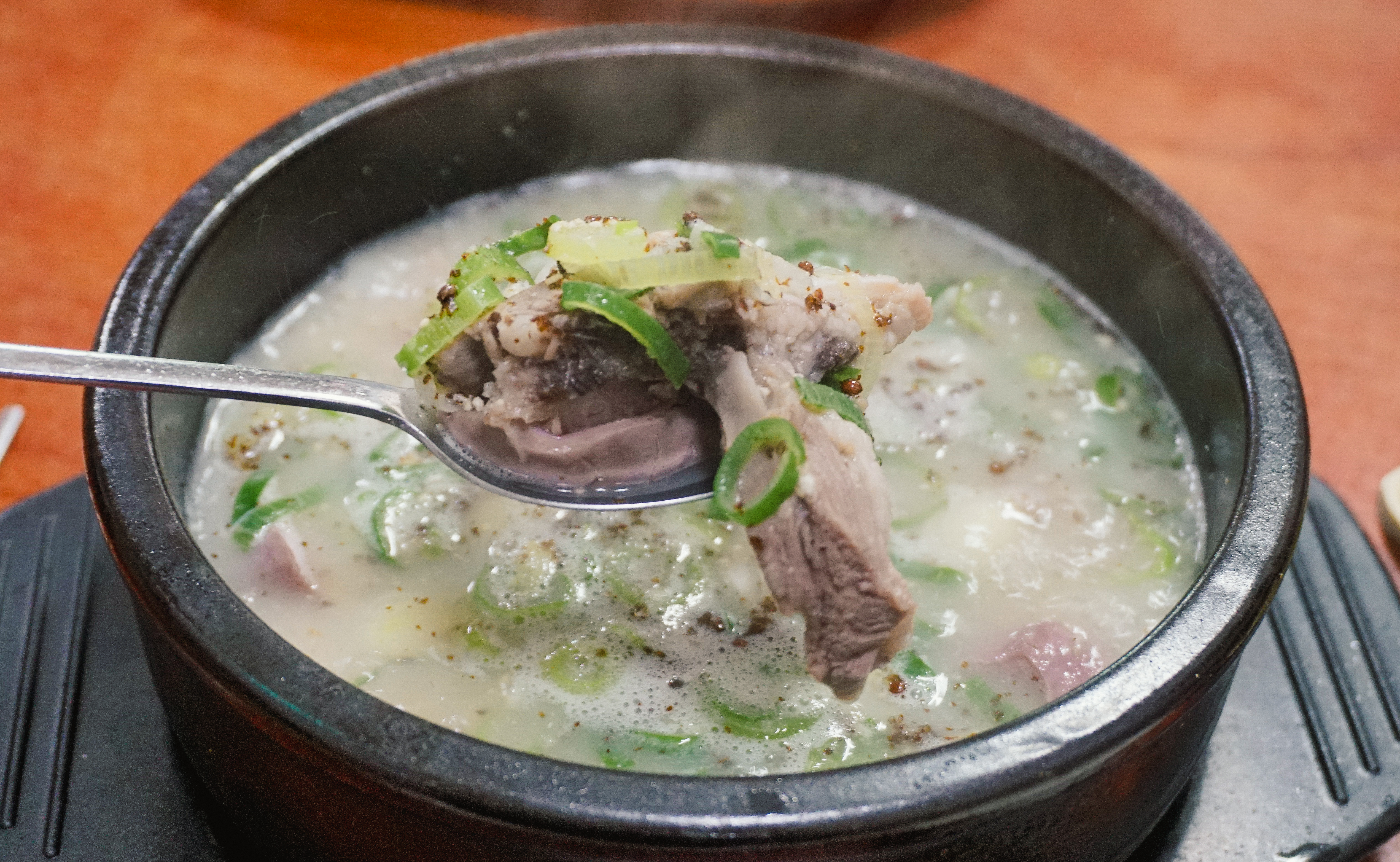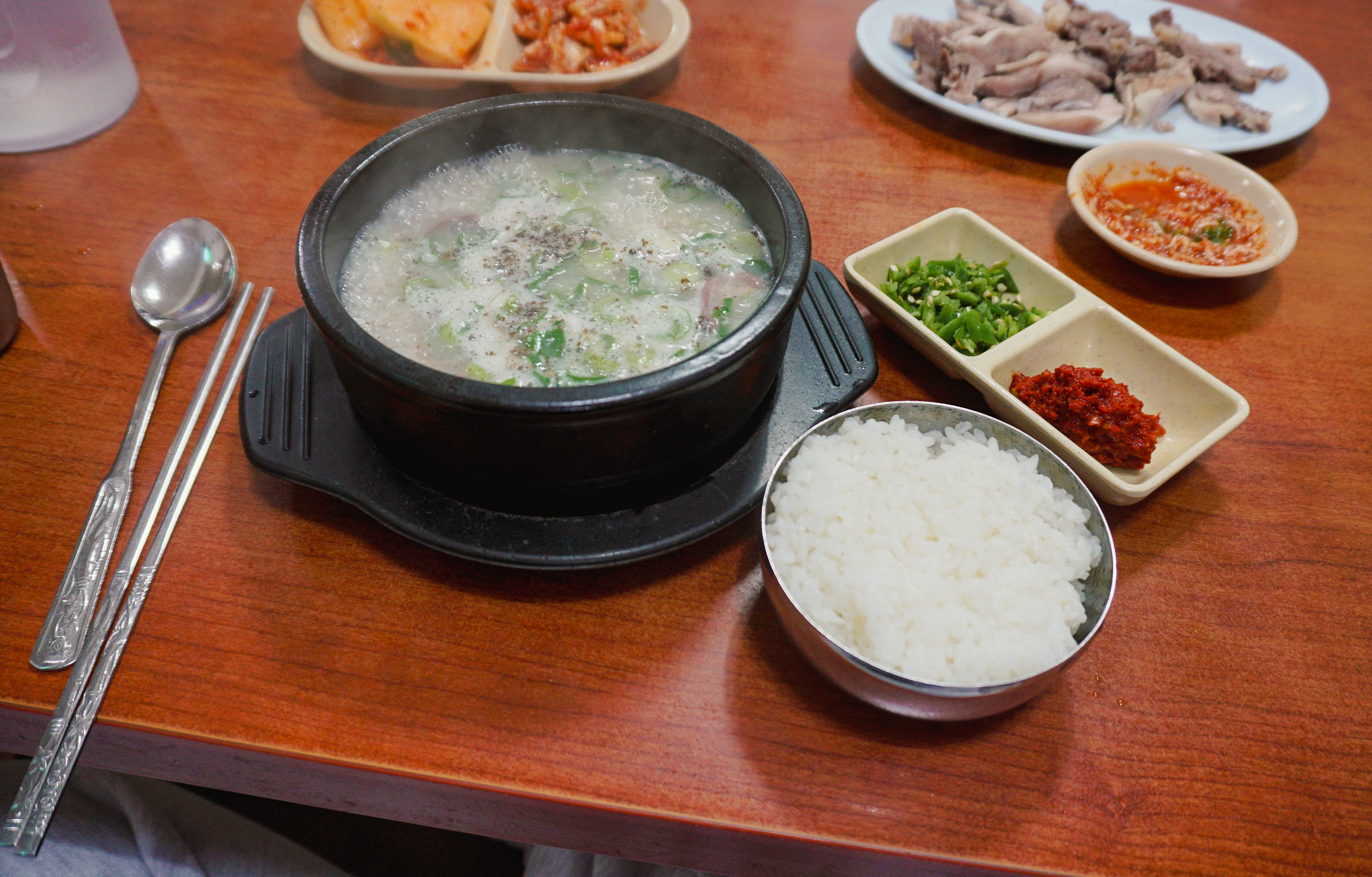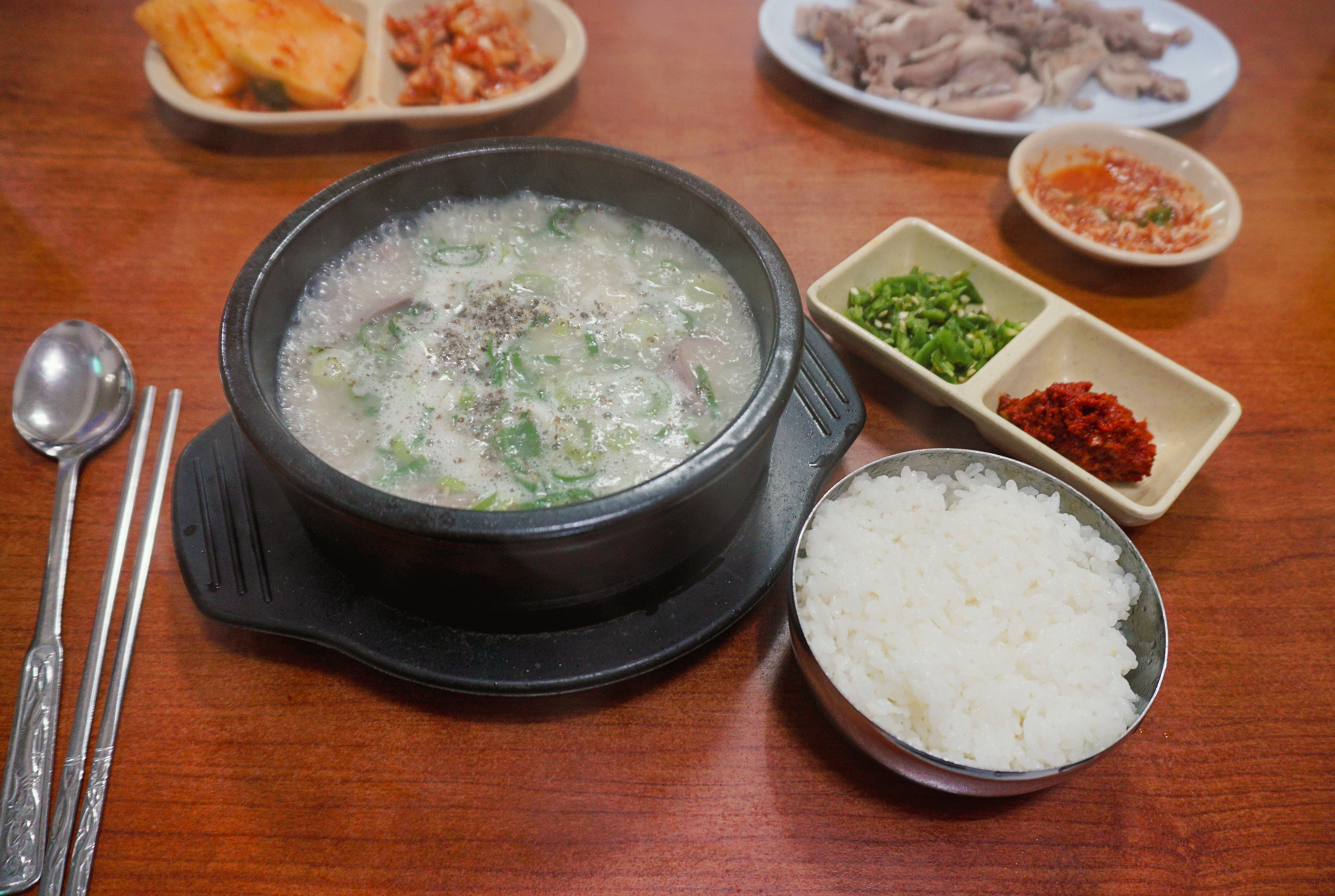 순대국밥의 모습은 이렇습니다. 돼지 머리 고기가 들어간 순대국밥으로 고기가 수육에 나오는 고기만큼 적당히 도톰하게 썰어져 들어갔고, 양은 많지도 적지도 않은 적당한 수준이었습니다. 국물은 담백하고 심심한 편이었는데, 같이 내어주신 새우젓과 다진 양념 양념장으로 간을 맞춰서 먹었습니다.