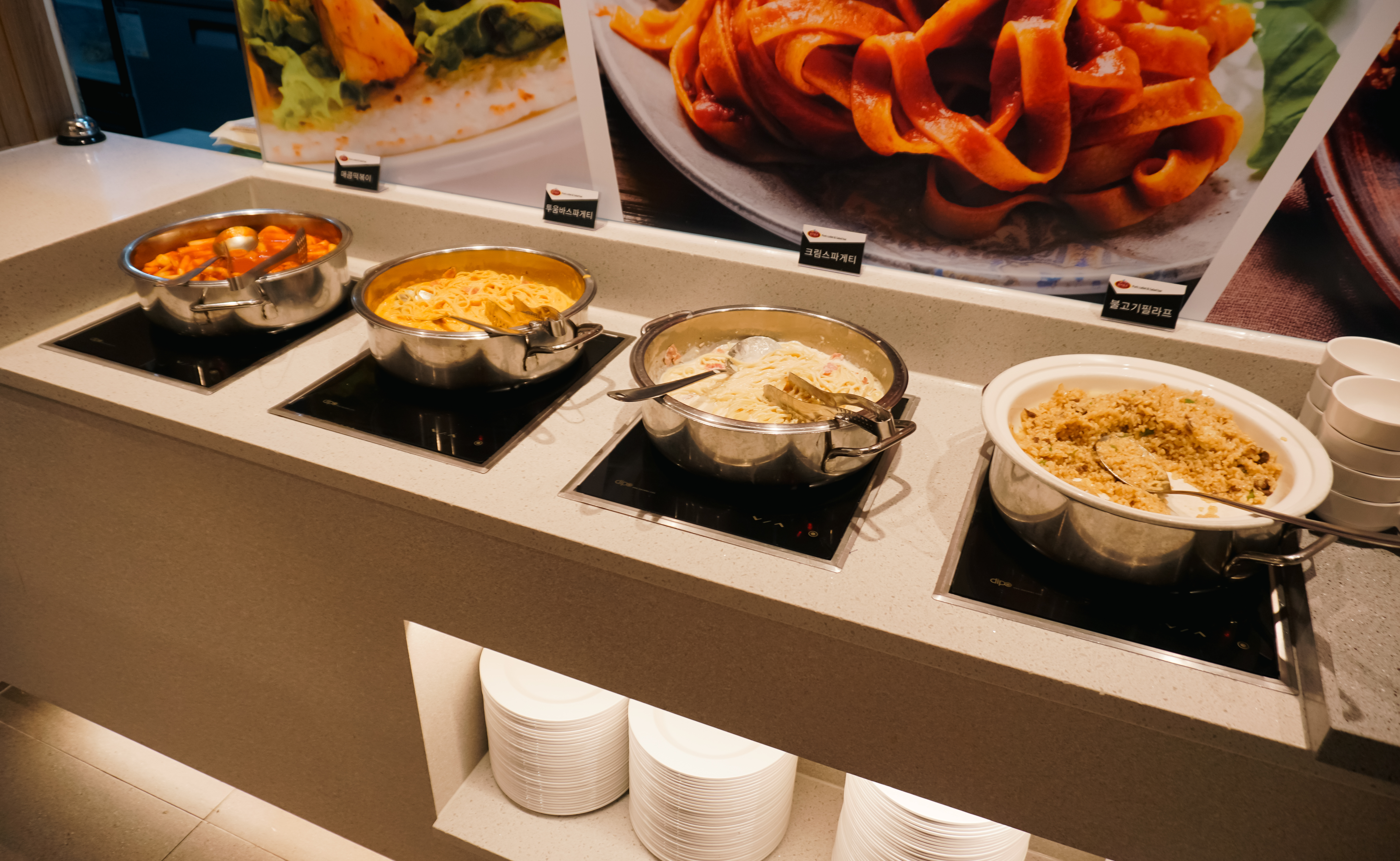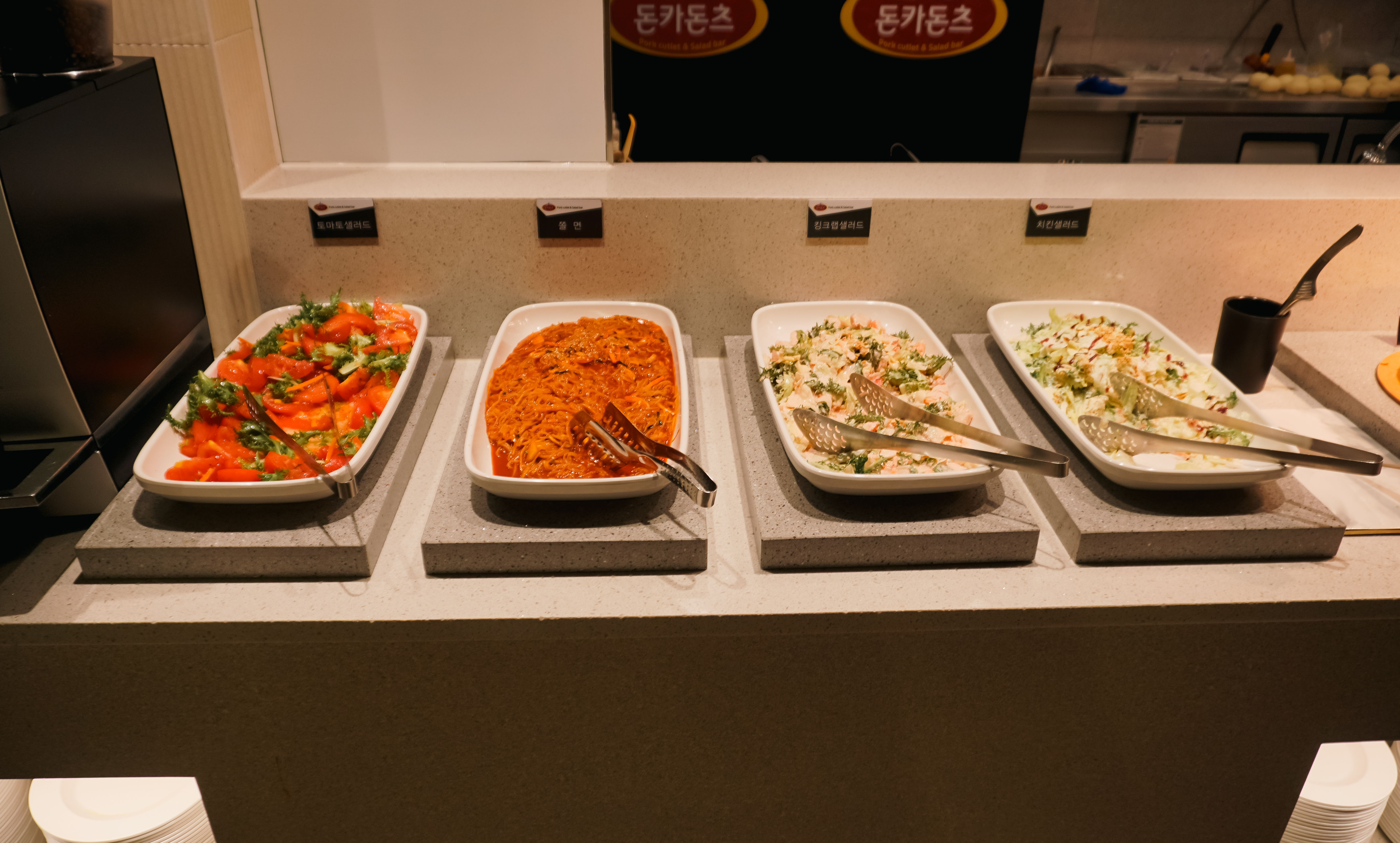 돈카돈츠의 메뉴는 피자, 파스타, 샐러드, 볶음요리, 튀김요리 등 샐러드바 형태로 되어있어서, 편리하게 원하는 만큼 덜어서 먹을 수 있었습니다. 다른 메뉴들도 이어서 살펴보시죠.