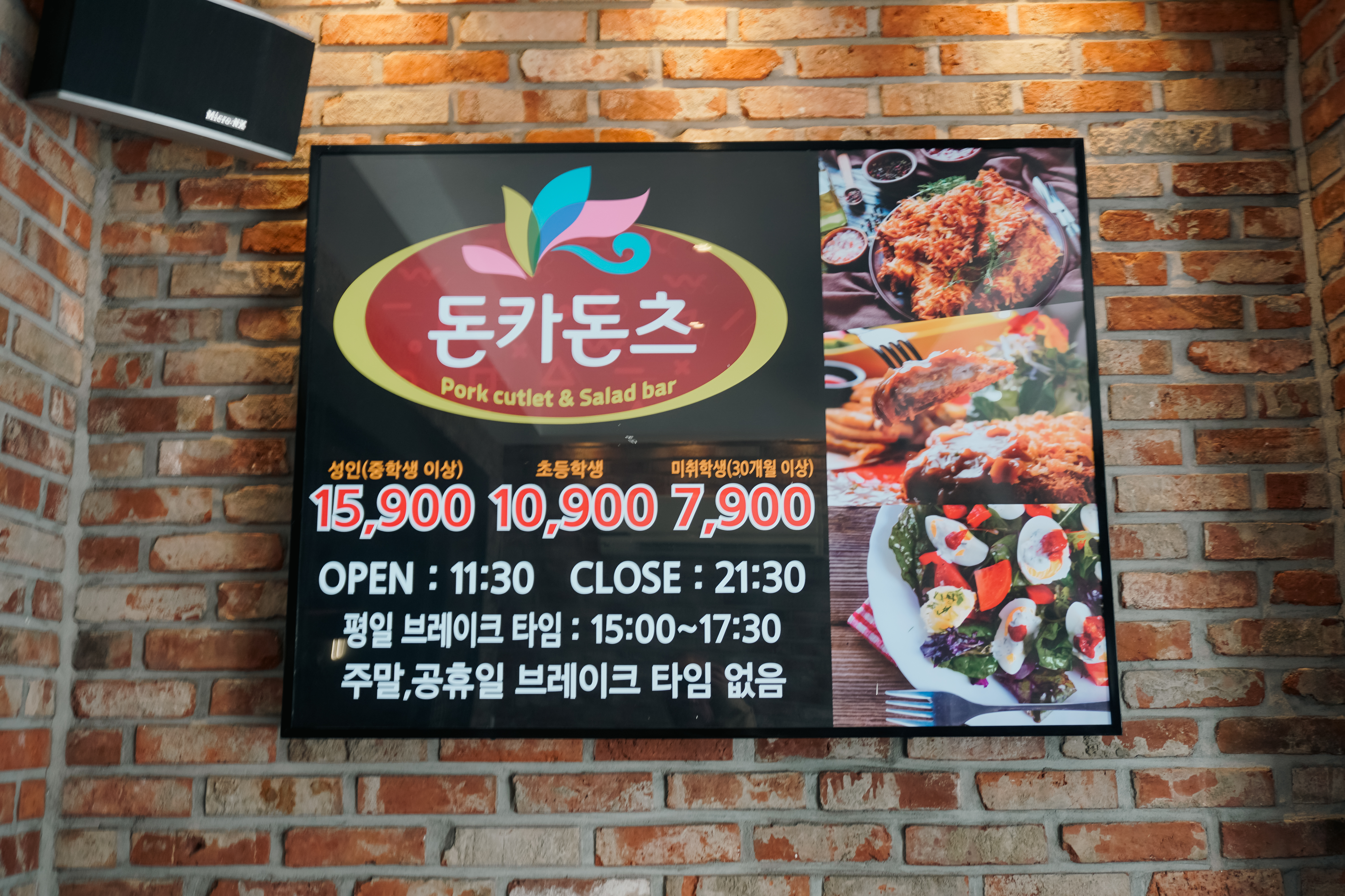 대구 돈까스 무한리필 돈카돈츠의 가격은 성인기준 15,900원 이었고, 초등학생 10,900원, 미취학생 7,900원 이었습니다. 그럼 이제 가게 안으로 들어가 메뉴를 함께 살펴보시죠.