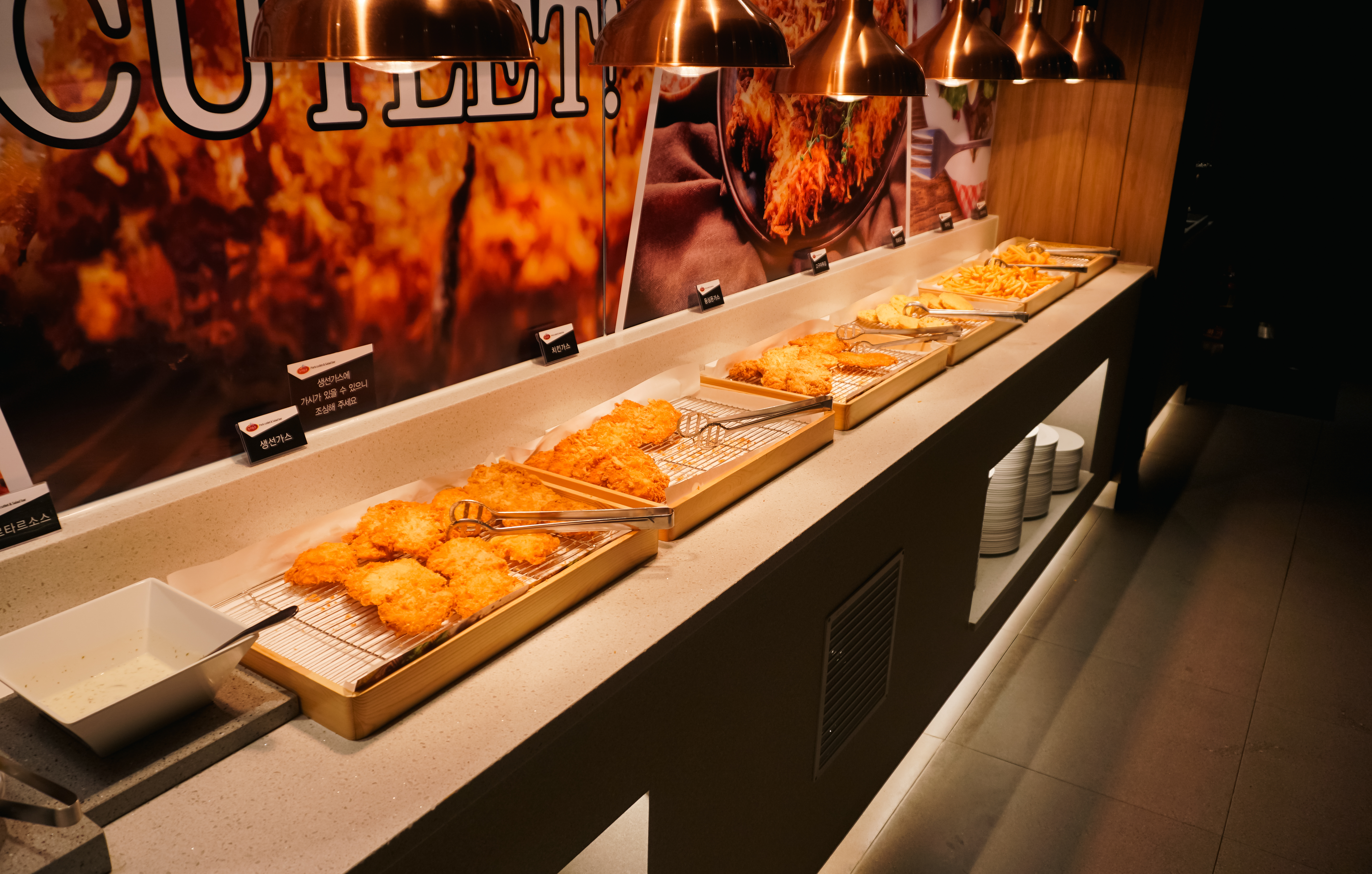 돈까스와 스프, 소스 등을 담아갈 수 있었고, 과일이나 와플 같은 디저트도 직접 굽거나 가져와 먹을 수 있었습니다. 전체적으로 가격대비 구성이 잘 되어있었고, 깔끔하게 잘 유지되어 이용이 편리했습니다.