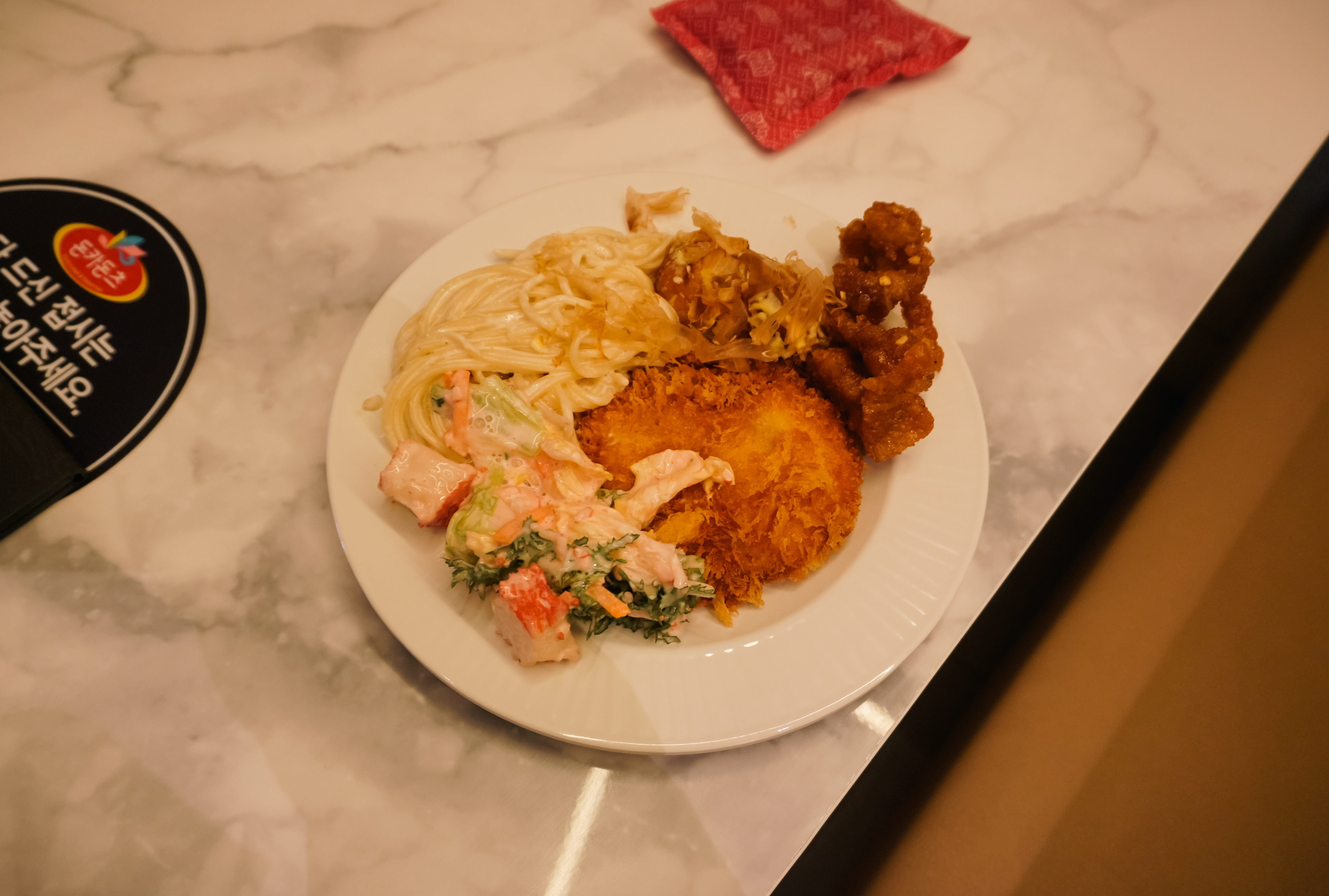 돈까스와 스프, 소스 등을 담아갈 수 있었고, 과일이나 와플 같은 디저트도 직접 굽거나 가져와 먹을 수 있었습니다. 전체적으로 가격대비 구성이 잘 되어있었고, 깔끔하게 잘 유지되어 이용이 편리했습니다.
