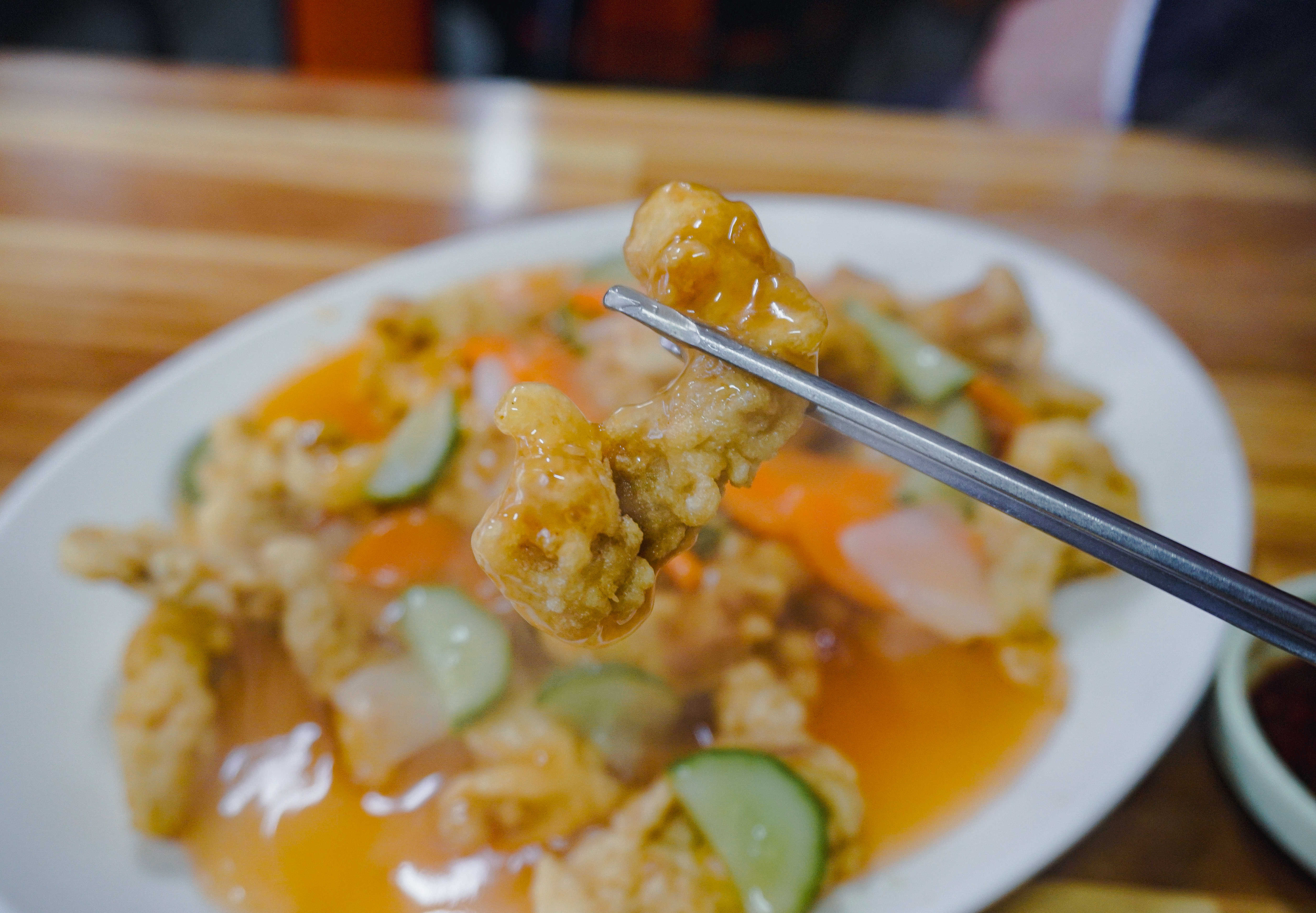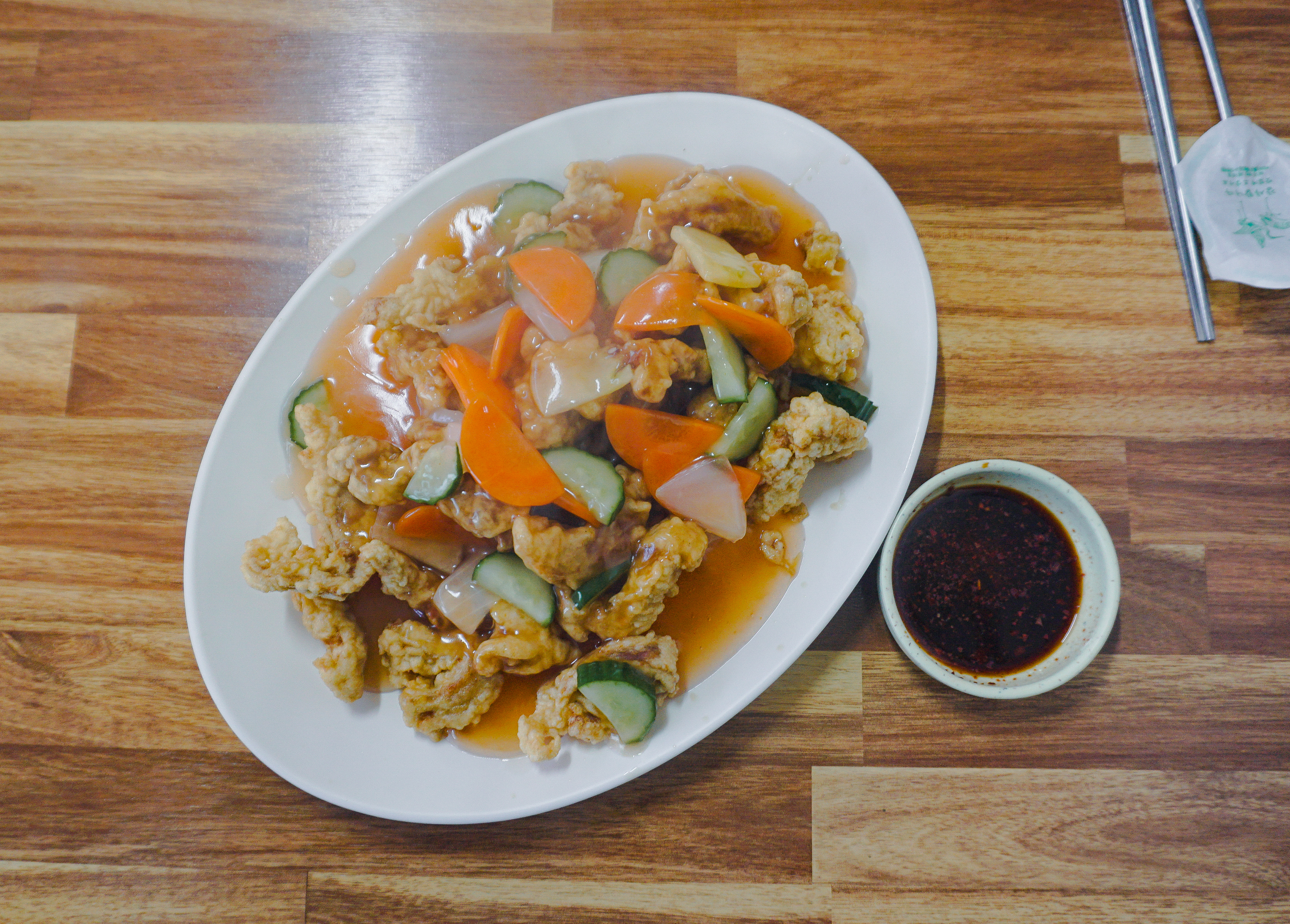 먼저, 아리랑반점의 탕수육 부터 살펴보겠습니다. 탕수육은 옛날 중국집 탕수육이었는데, 확실히 이런 종류의 탕수육은 찍먹보다는 부먹으로 먹는게 맛있는 것 같더라고요. 촉촉한 소스가 잘 스며든 탕수육은 맛이 좋았고, 양도 꽤 넉넉해서 배불리 먹을 수 있었습니다.