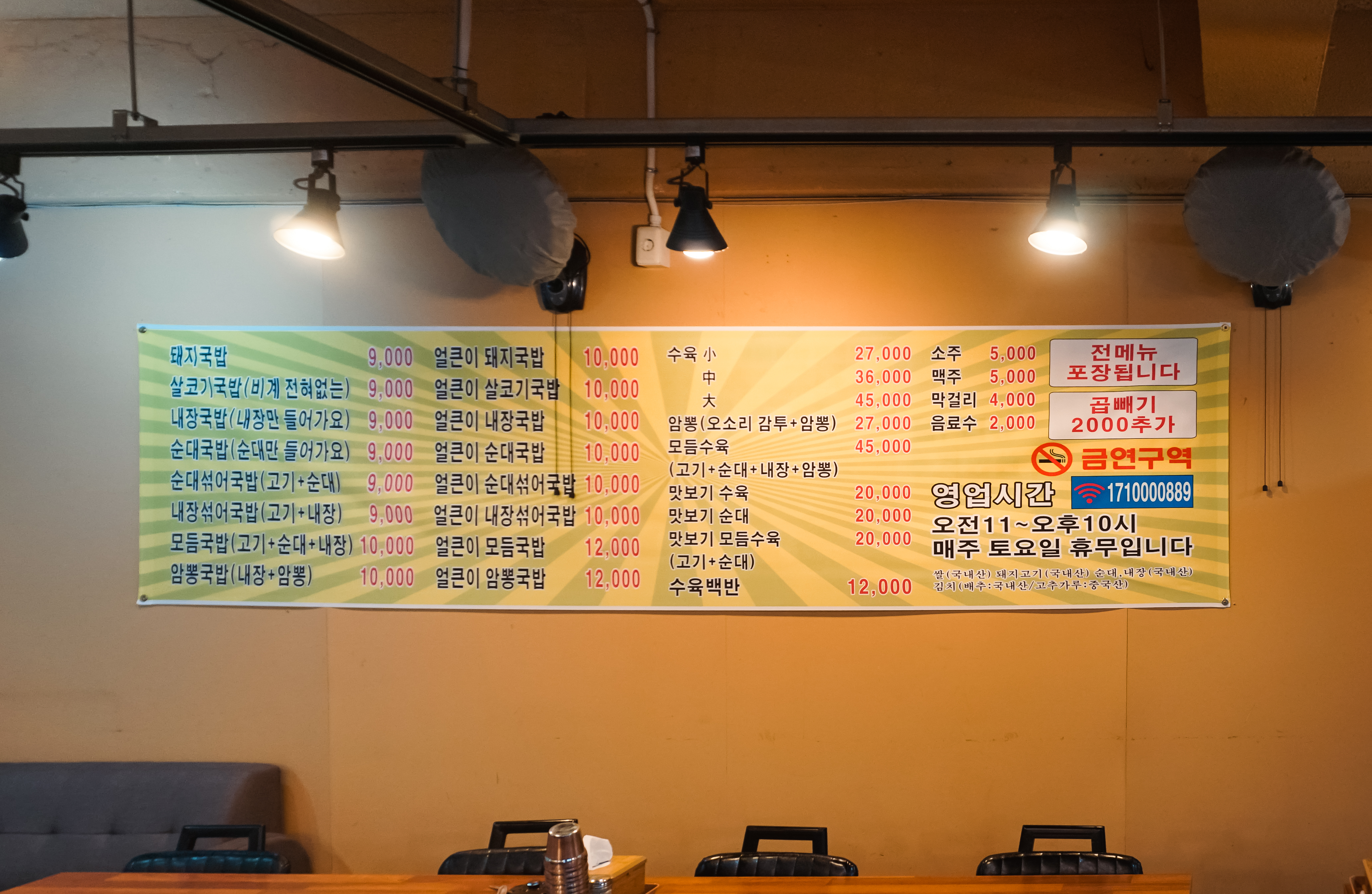 대구 무학골돼지국밥의 메뉴는 돼지국밥, 살코기국밥, 내장국밥, 순대국밥, 순대섞어국밥, 내장섞어국밥, 모듬국밥, 암뽕국밥, 수육, 암뽕, 모듬수육, 수육백반 등이 있었습니다. 일단 여기에서는 식사를 하면 셀프코너에 무조건 한 번 이상은 다녀온다고 합니다.