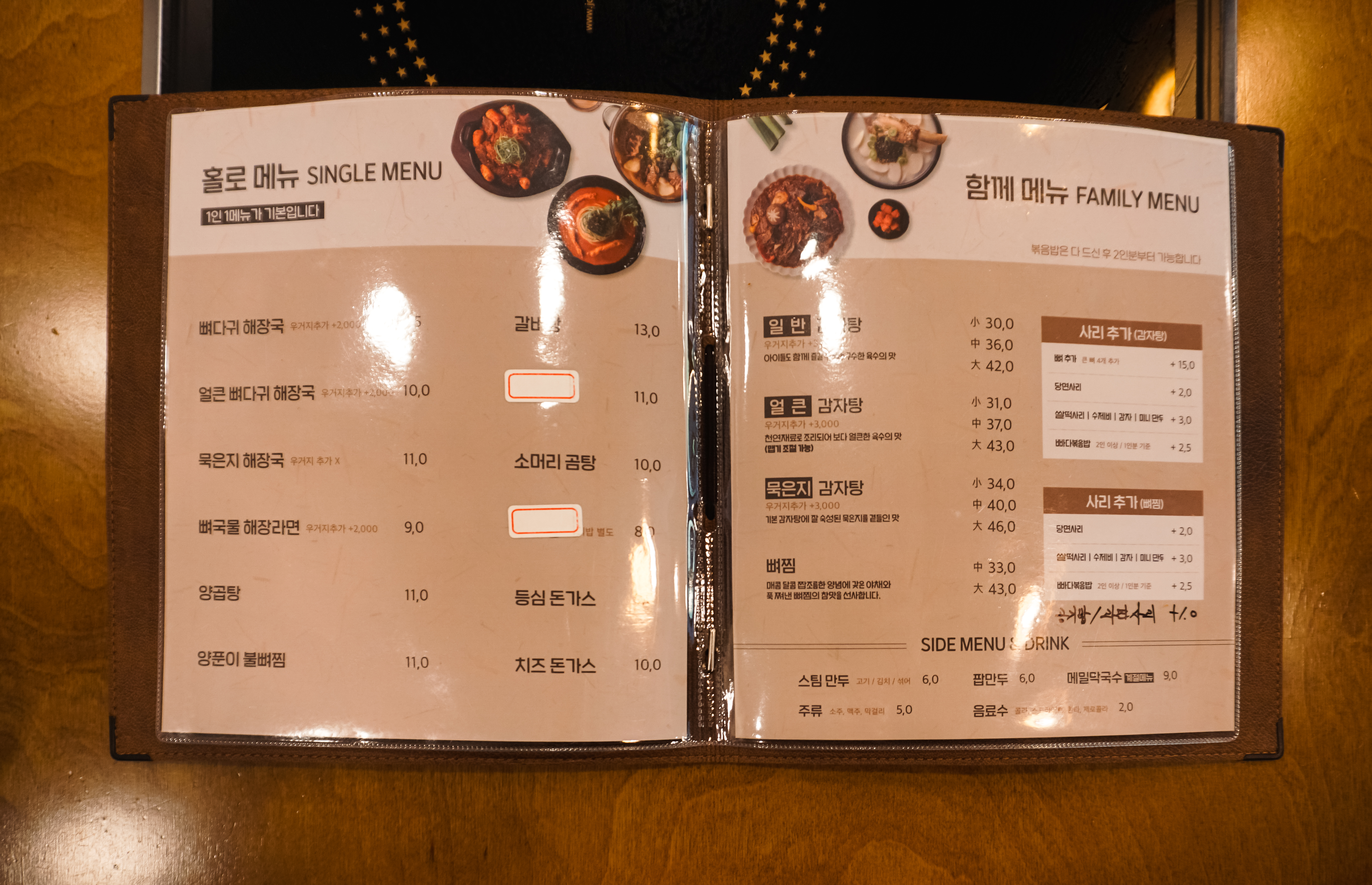 이을감자탕의 메뉴는 이렇습니다. 뼈다귀해장국, 얼큰뼈다귀해장국, 묵은지해장국, 뼈국물해장라면, 양곱탕, 양푼이불뼈찜, 갈비탕, 소머리곰탕, 등심돈까스, 치즈돈까스, 일반감자탕, 얼큰감자탕, 묵은지감자탕, 뼈찜 등이 있었습니다. 저희는 얼큰감자탕 중 자와 라면사리, 볶음밥을 먹었습니다.