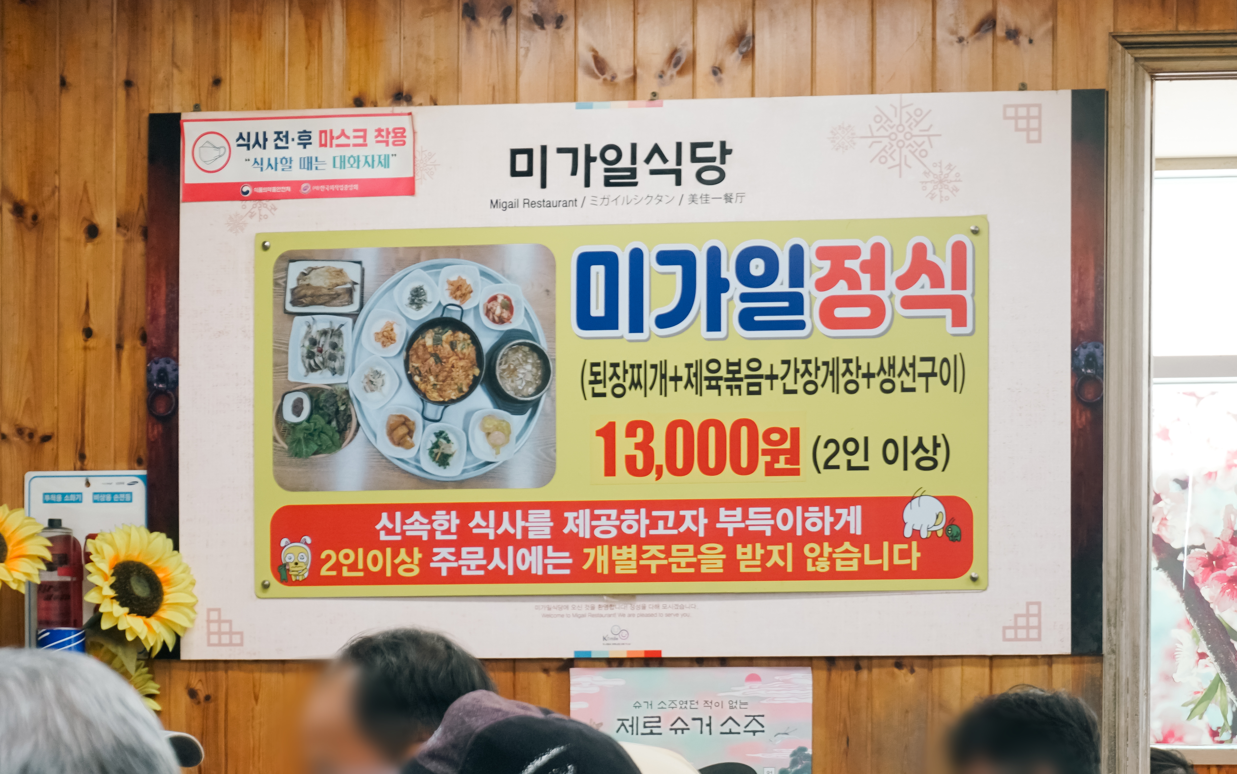 미가일정식된장찌개, 제육볶음, 간장게장, 생선구이가 나오는 메뉴로 1인 13,000원에 판매하고 있었습니다. 하지만 이 메뉴는 2인 이상만 주문이 가능하기 때문에 혼자서 방문한 저는 먹을 수 없었습니다.