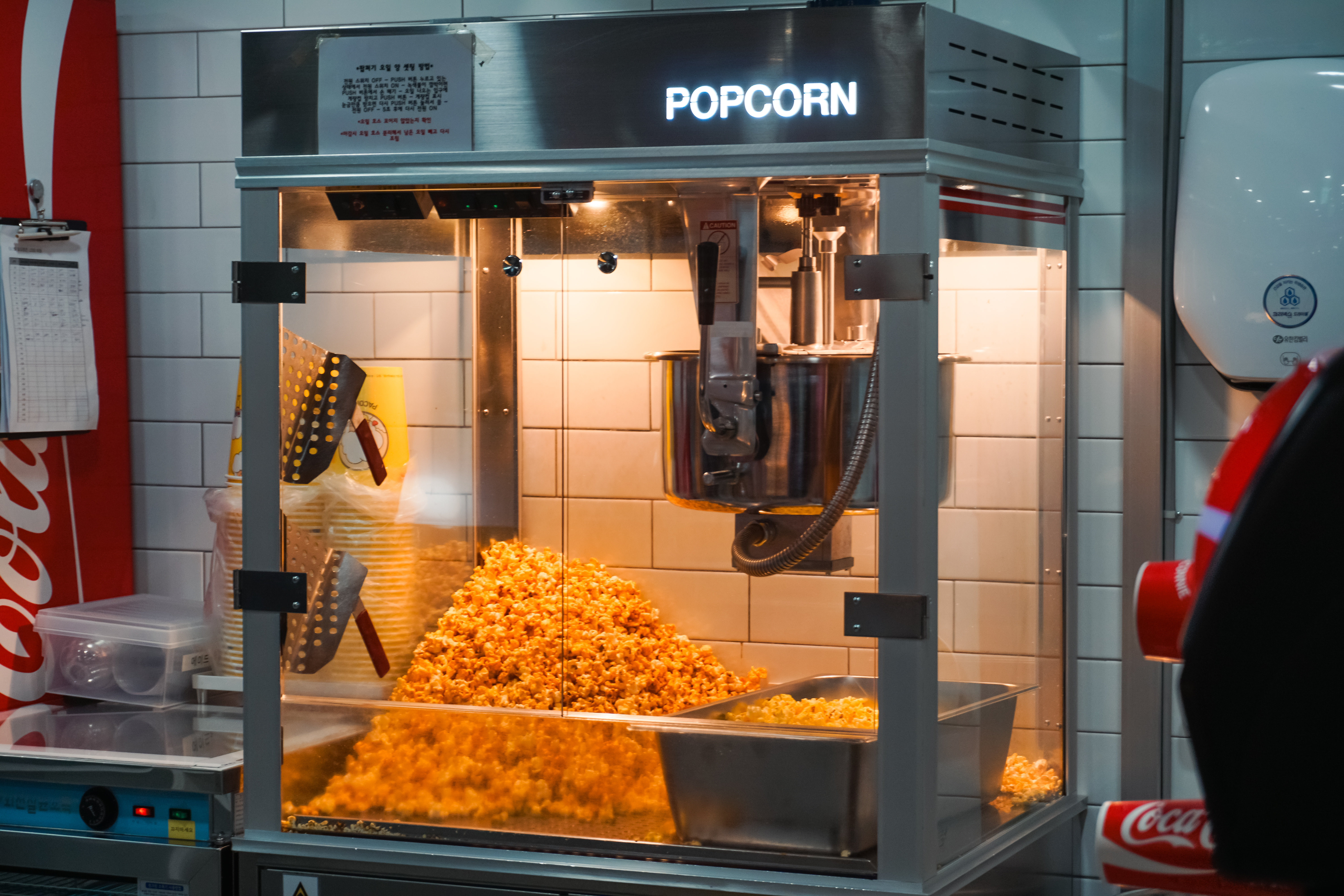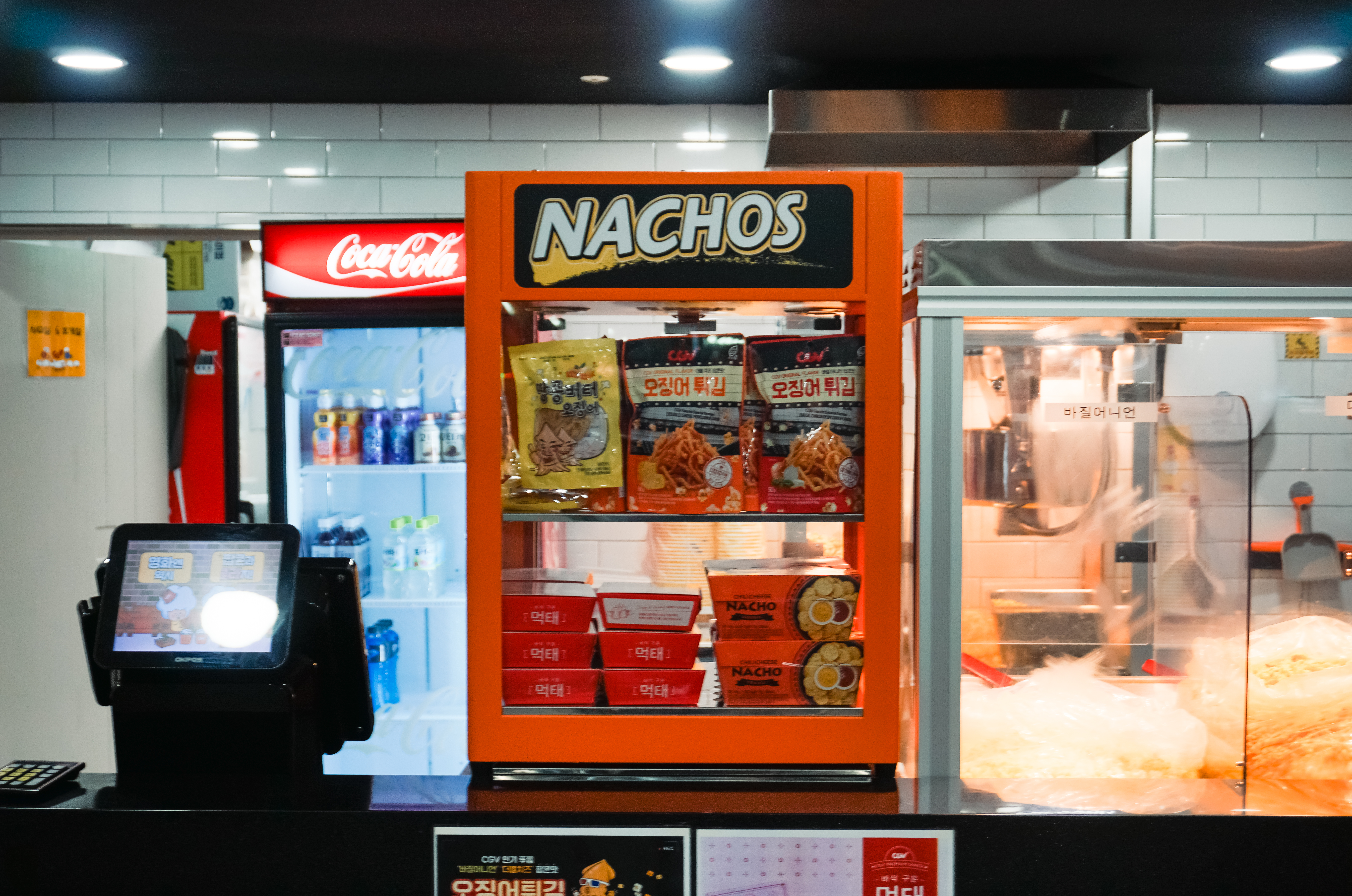메뉴는 팝콘(기본/달콤/바질어니언/더블치즈), 칠리치즈나쵸, 바삭구운먹태, 오징어튀김, 땅콩버터오징어 등이 있었습니다. 참고로, 음료는 제로음료 선택이 안되었습니다.
