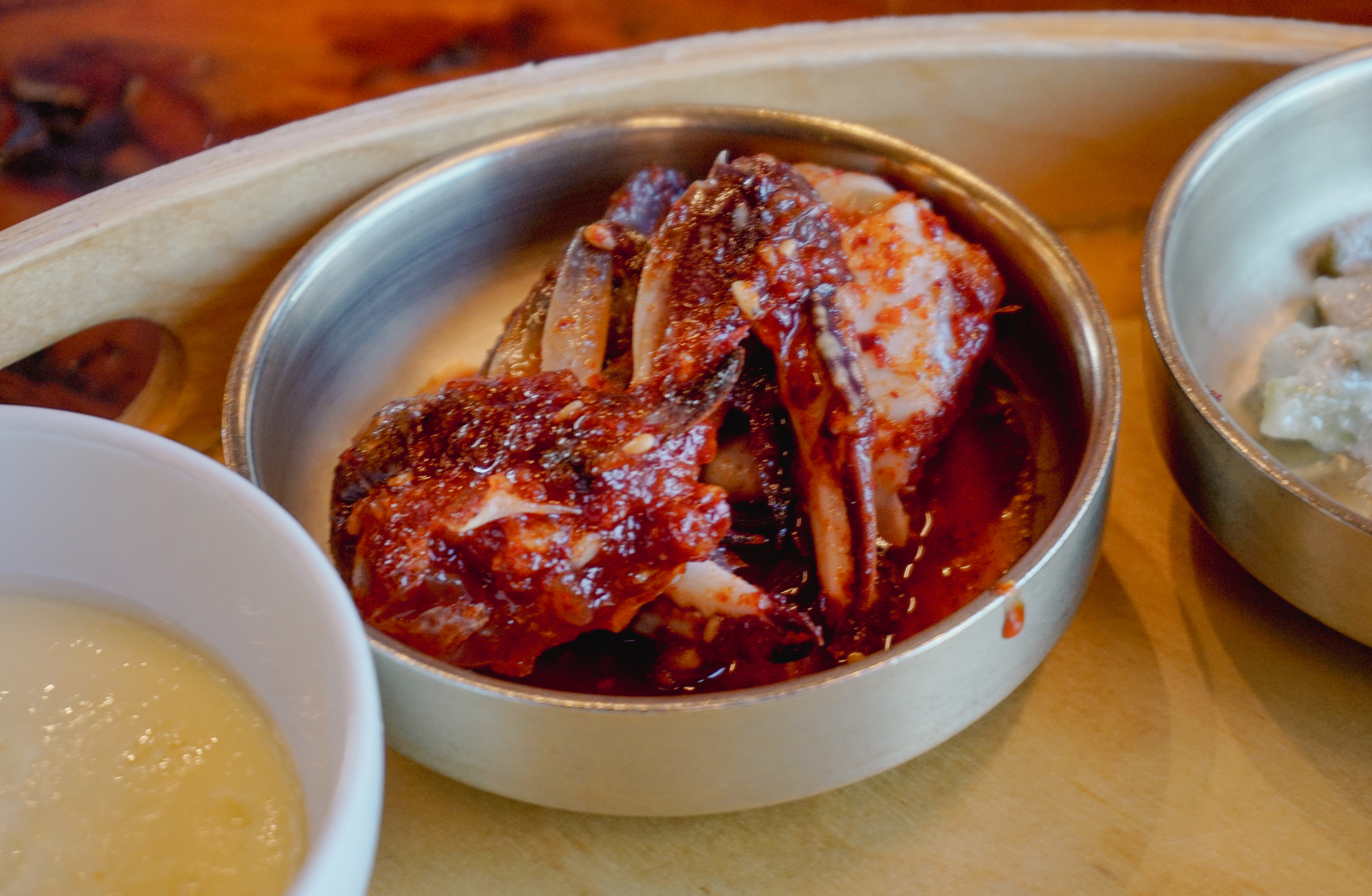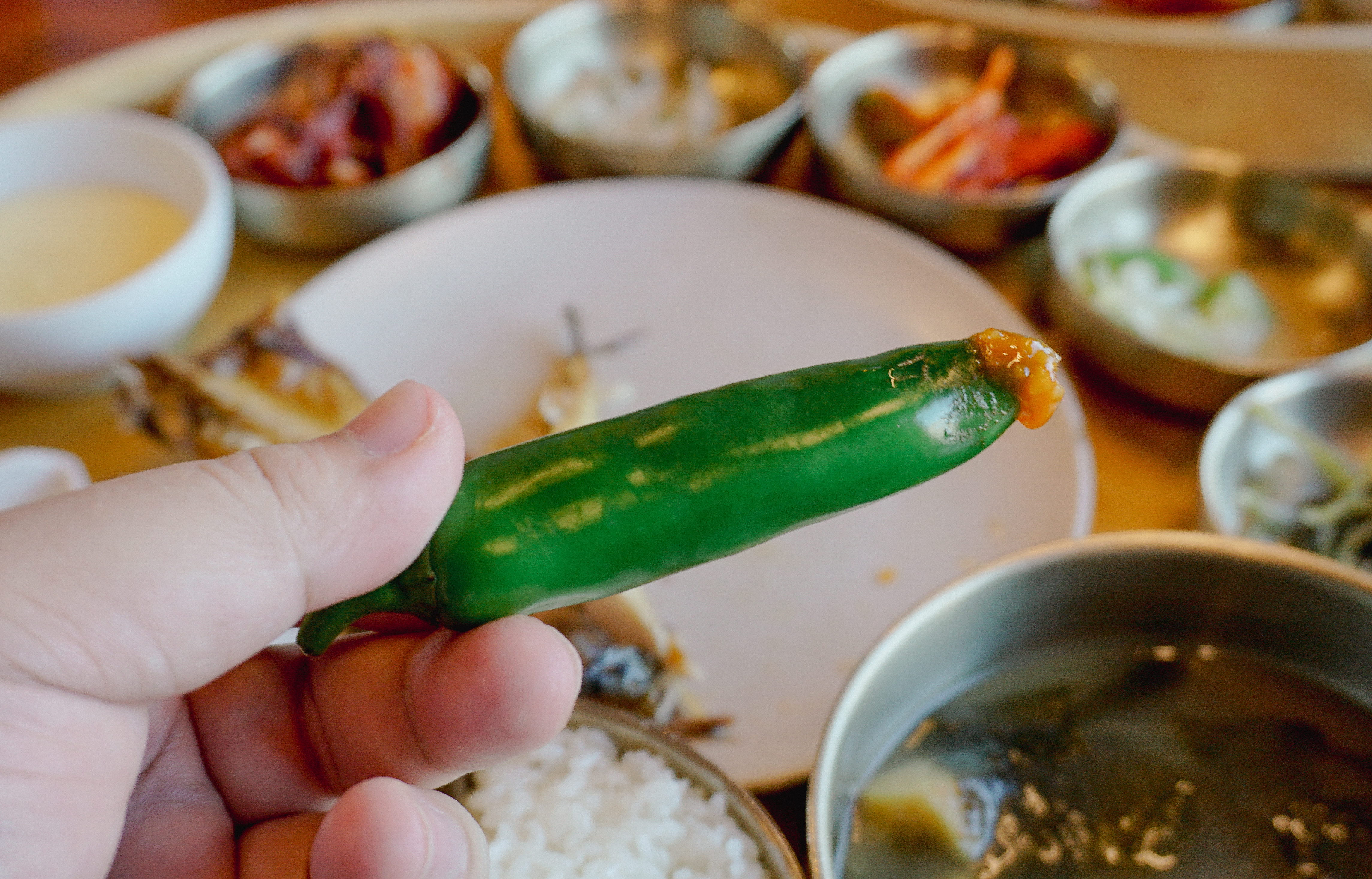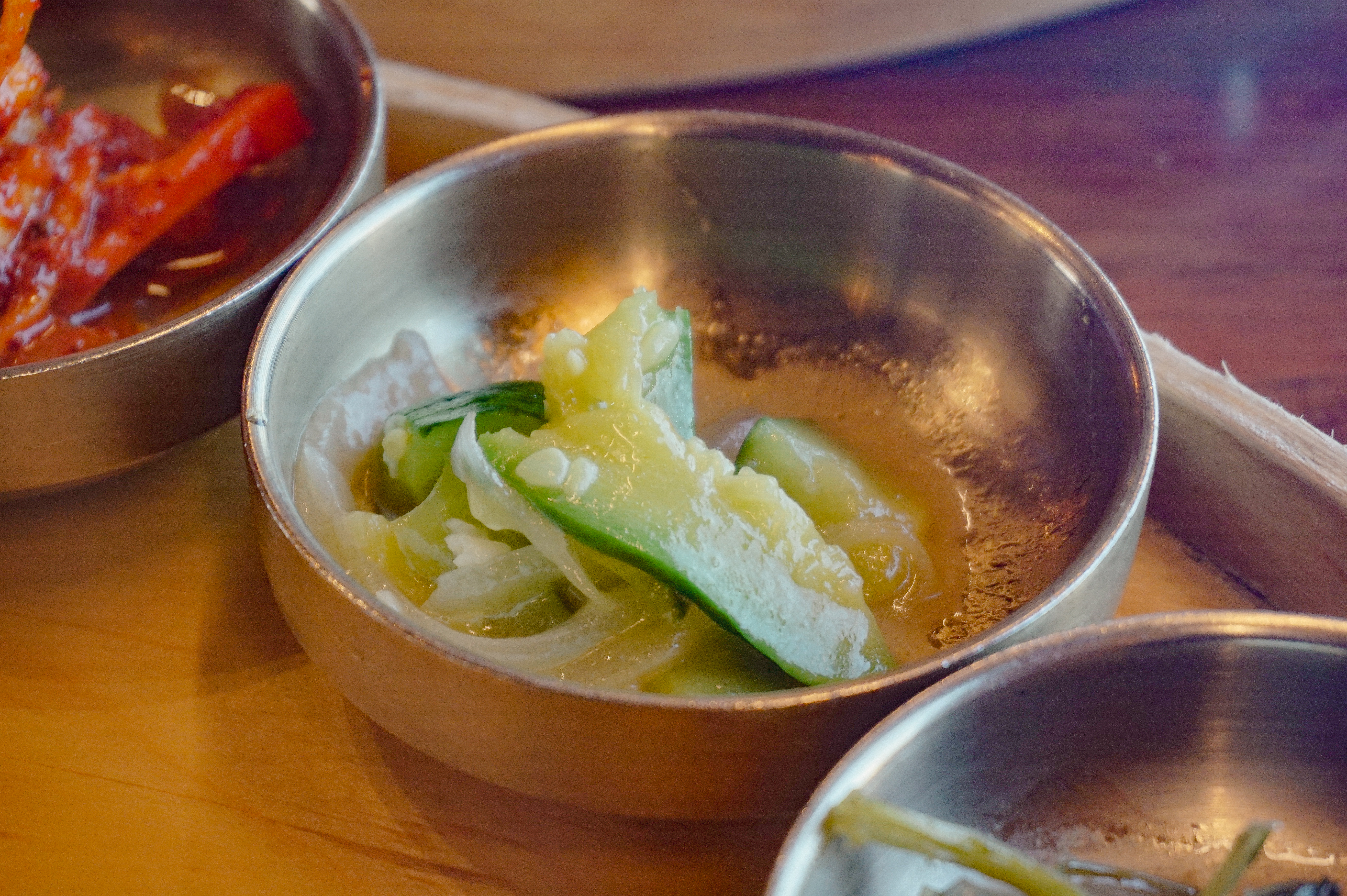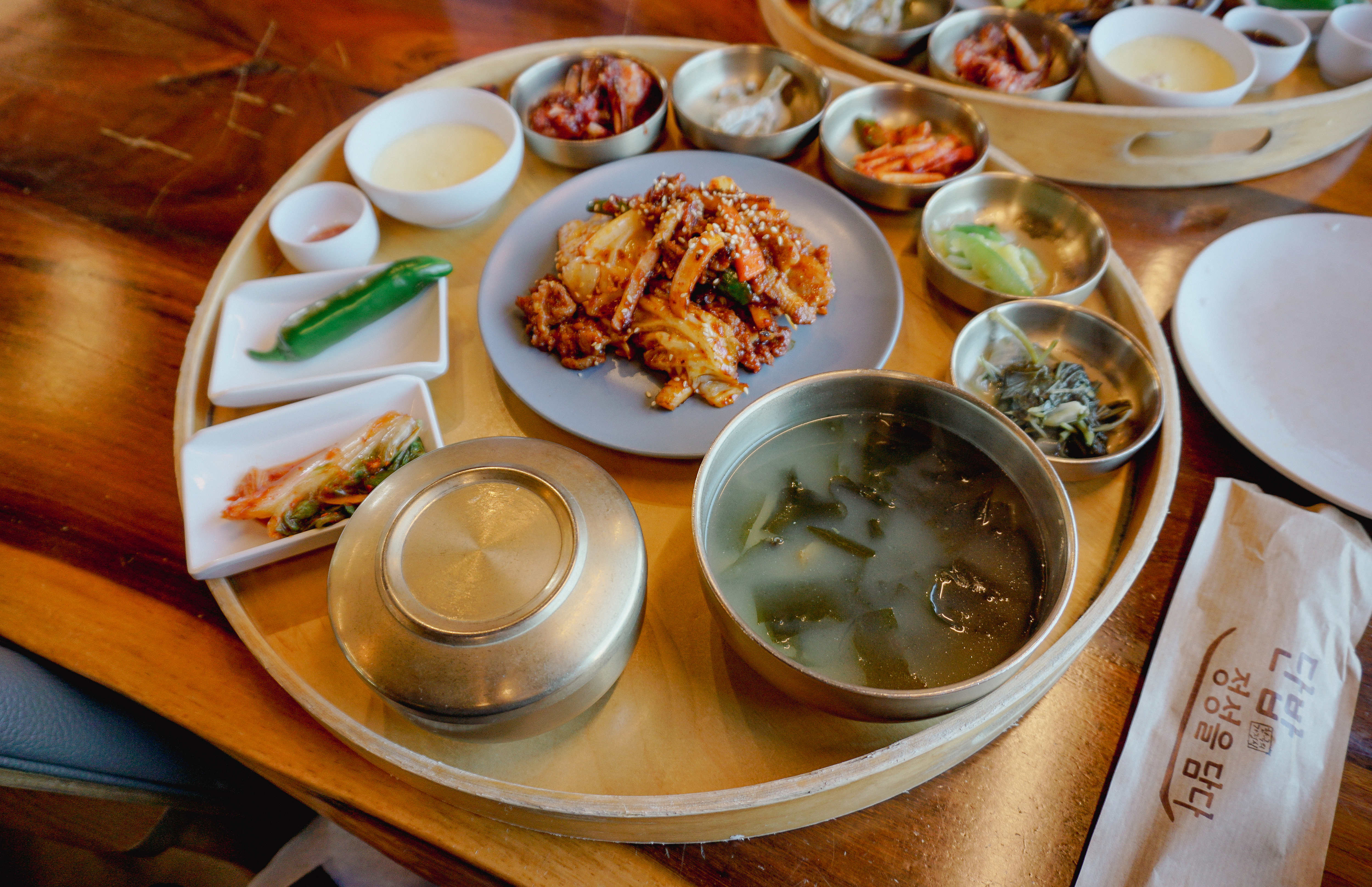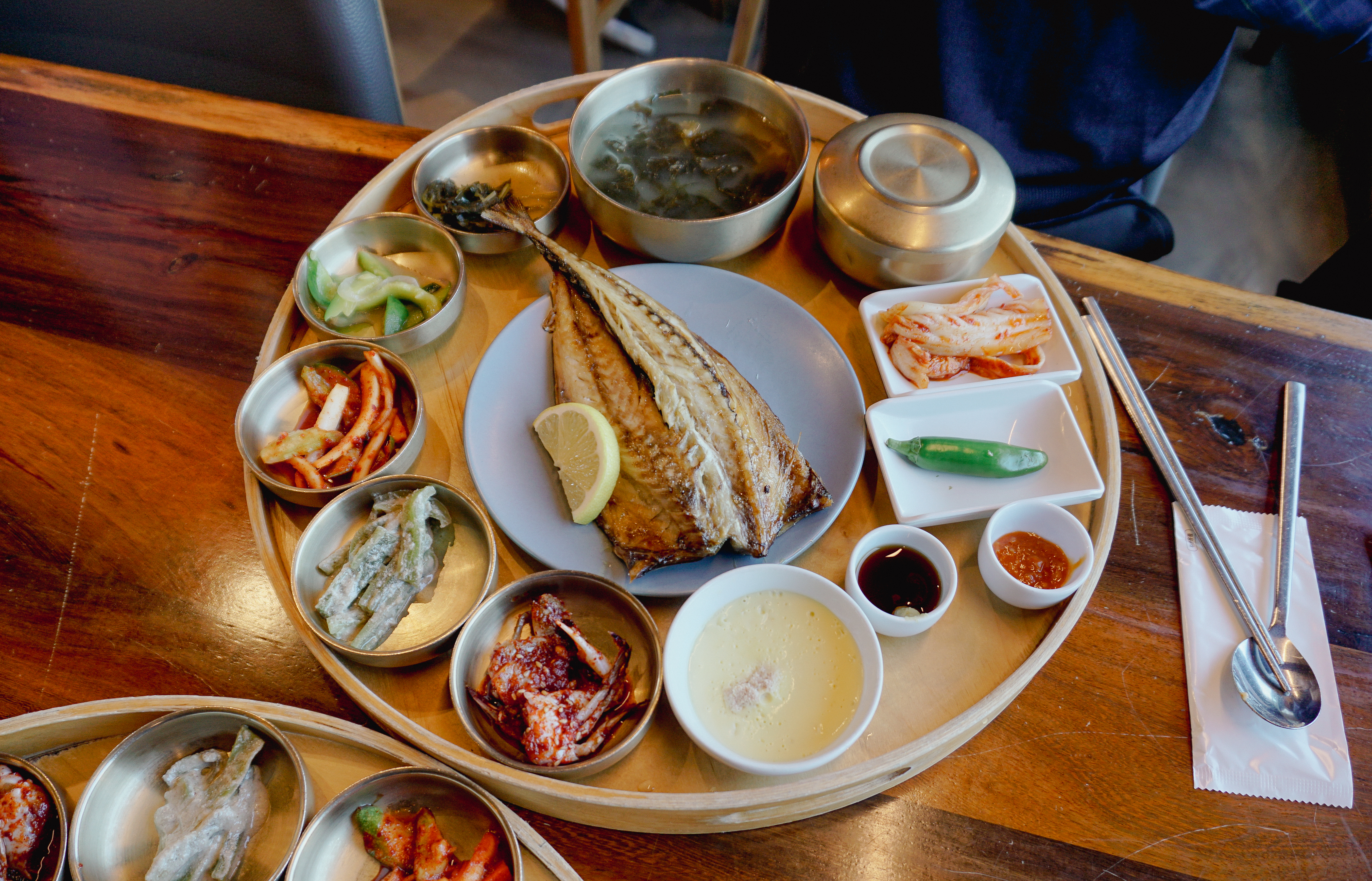 단밥의 메뉴는 동그란 나무 쟁반에 각자 먹을 수 있도록 반찬이 따로 제공되고 있었습니다. 기본 반찬인 나물무침, 호박무침, 도라지무침, 고추, 김치, 게장, 미역국, 명란이 들어간 달걀찜은 동일했고, 메인으로 주문한 고등어구이나 오징어불고기 같은 반찬만 달랐습니다.