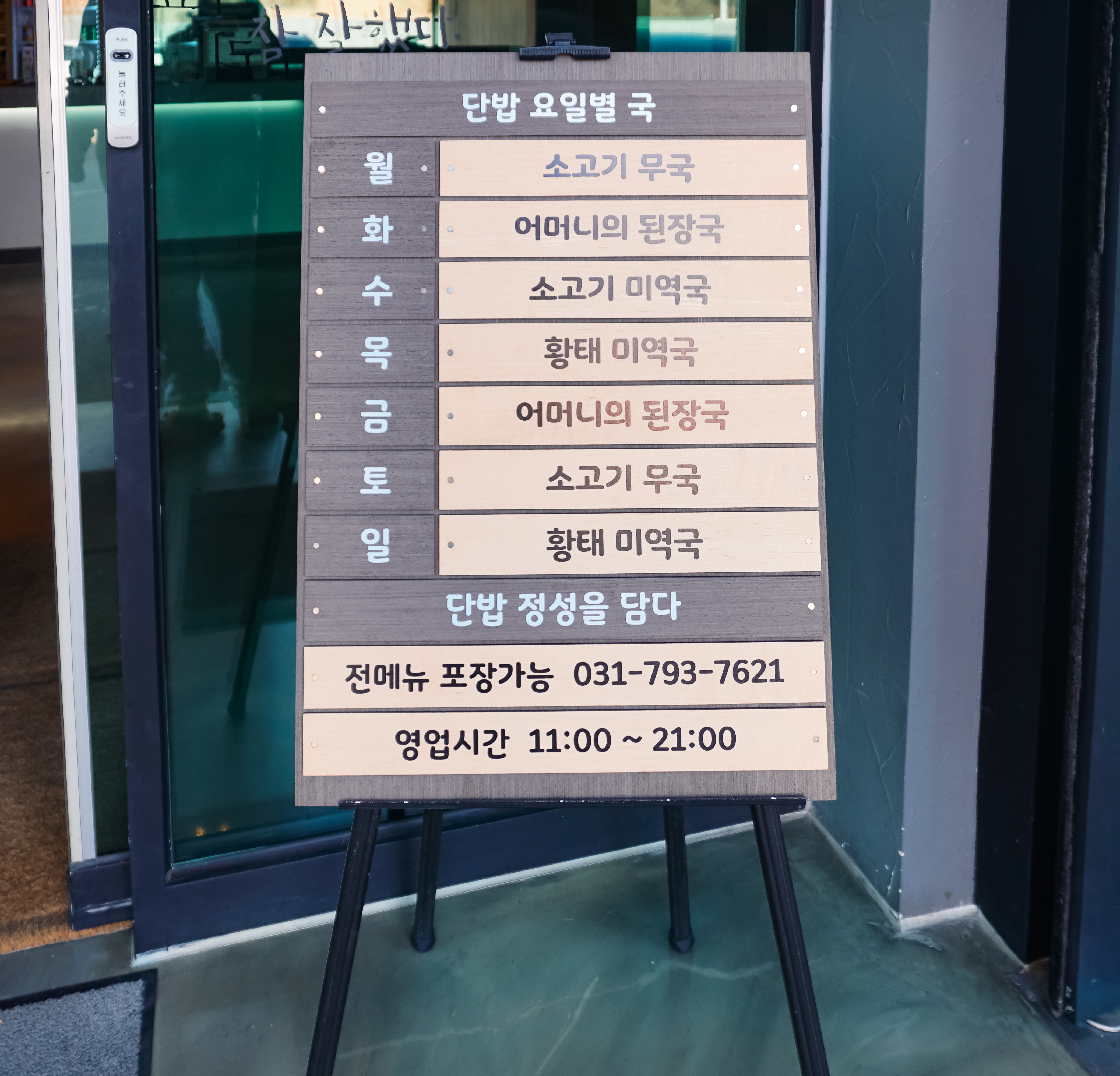 단밥은 경기 하남시 창우동 37-2 에 위치한 한식집입니다. 한상차림이 나오는 한정식집보다는 한식집이라는 표현이 맞을 것 같고요. 정갈하게 1인분씩 반찬을 내어주는 가게로 만족도가 높은 가게였습니다. 주차공간은 꽤 여유 있는 편이었고, 주로 가족단위 식사를 위해 방문하는 것을 확인할 수 있었습니다. 가게에는 요일별로 뭇국, 미역국, 된장국을 제공하고 있었고, 제가 방문한 요일에는 황태 미역국과 식사를 제공하고 있었습니다.