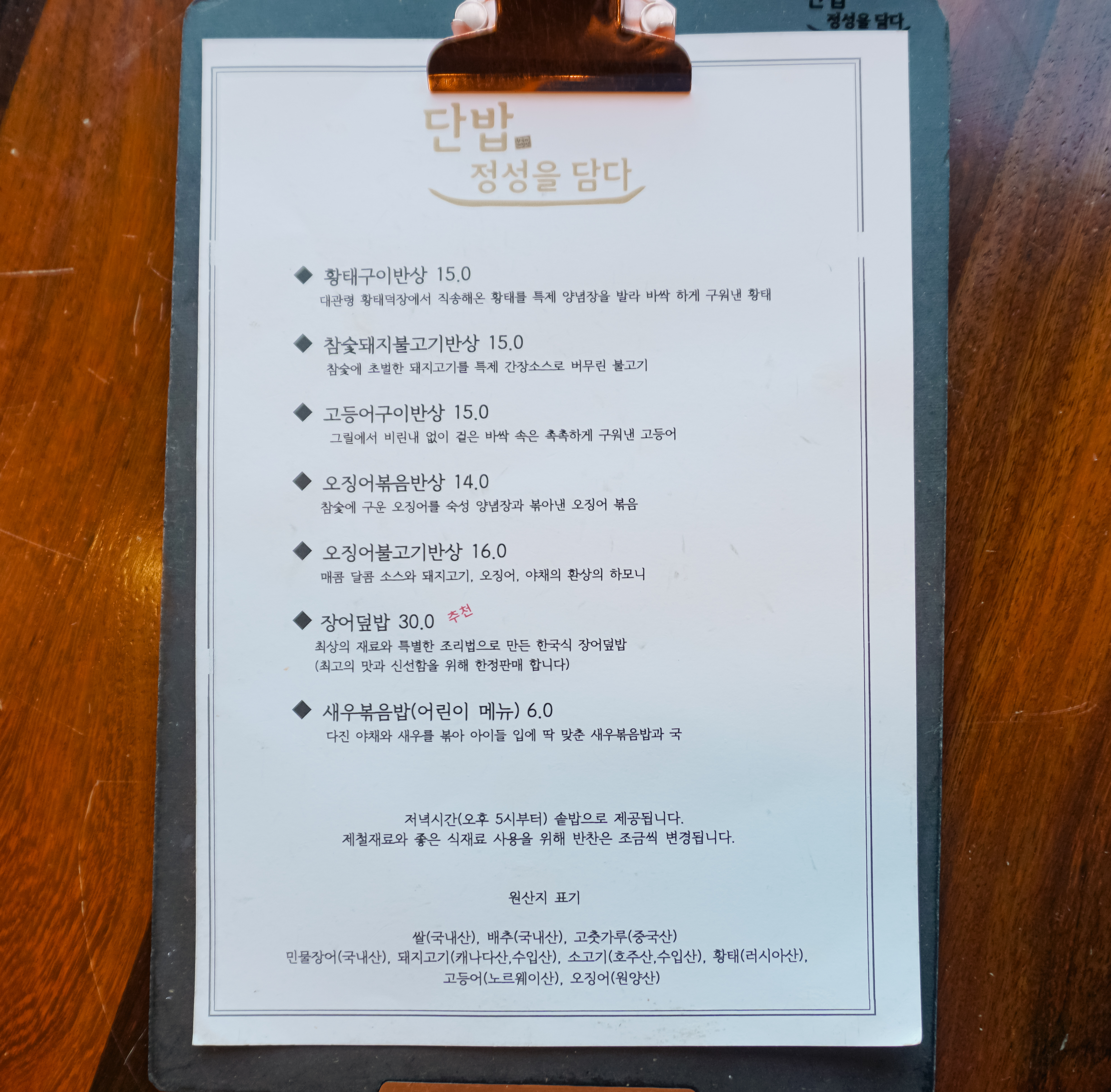하남 단밥의 메뉴는 위와 같습니다. 황태구이반상, 참숯돼지불고기반상, 고등어구이반상, 오징어볶음반상, 오징어불고기반상, 장어덮밥, 새우볶음밥이 있었습니다. 참고로 이 가게는 저녁시간인 오후 5시부터는 솥밥으로 제공된다고 하네요. 제가 방문한 점심시간에는 솥밥은 아니어서 조금 아쉬웠습니다.