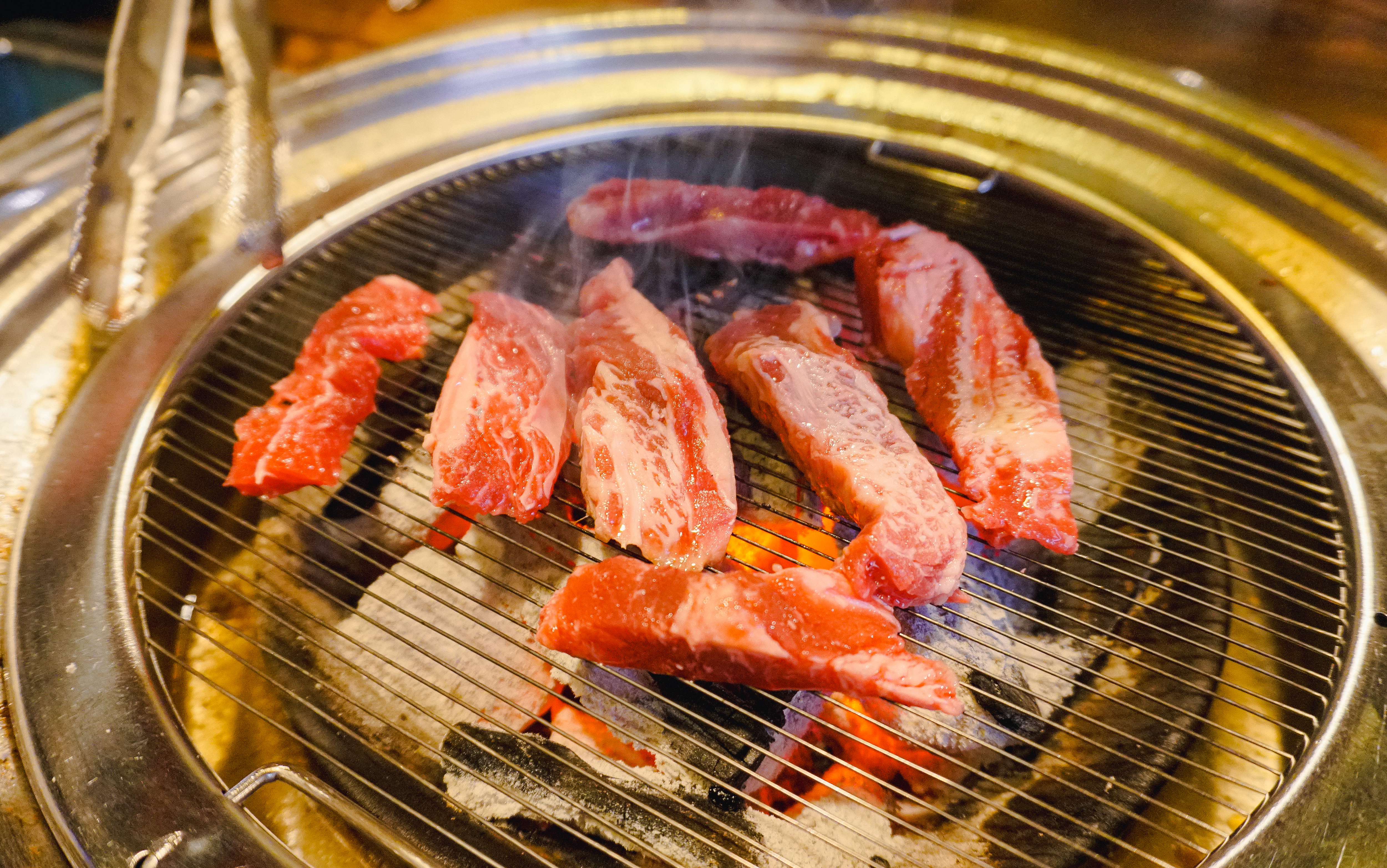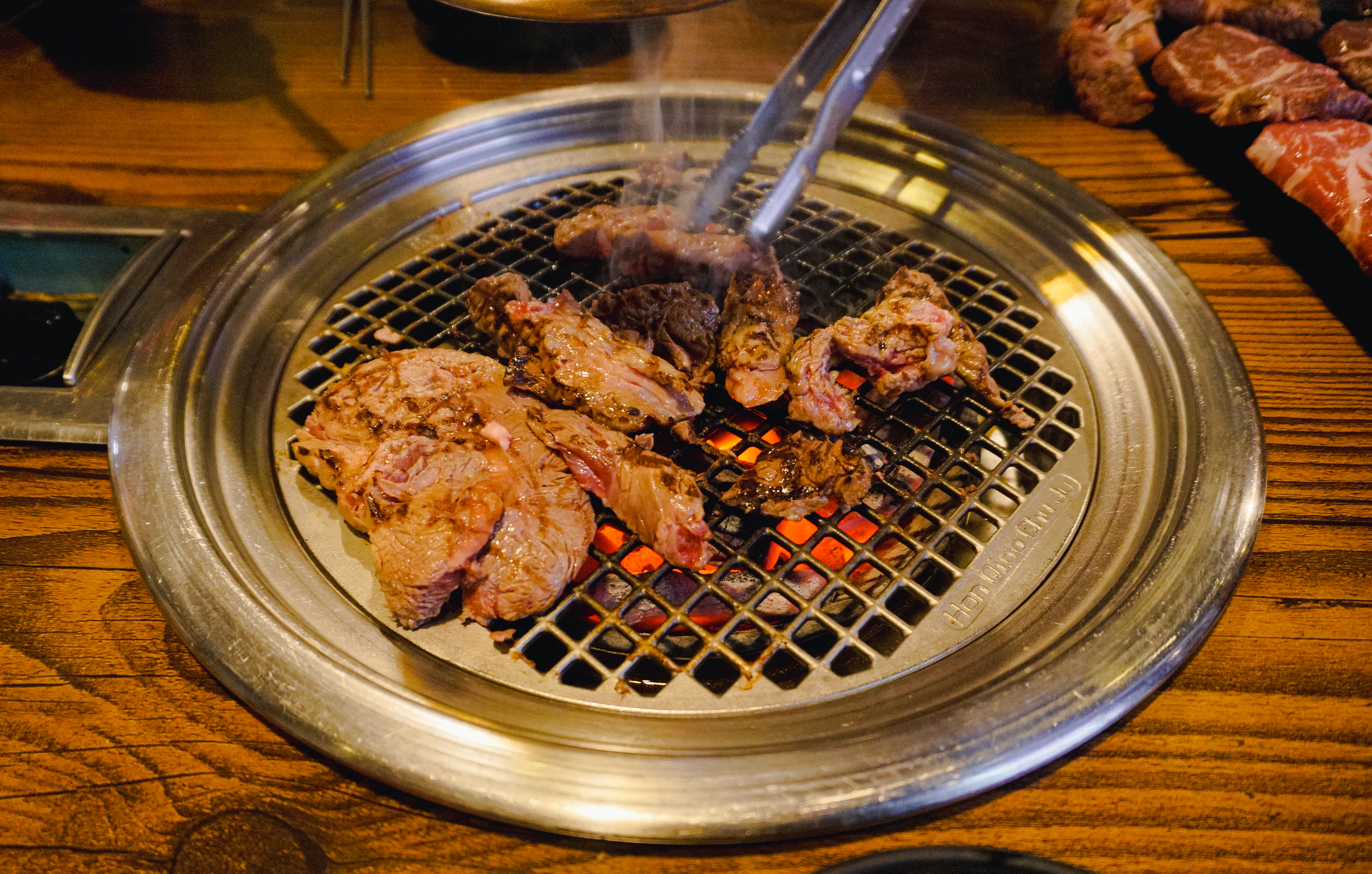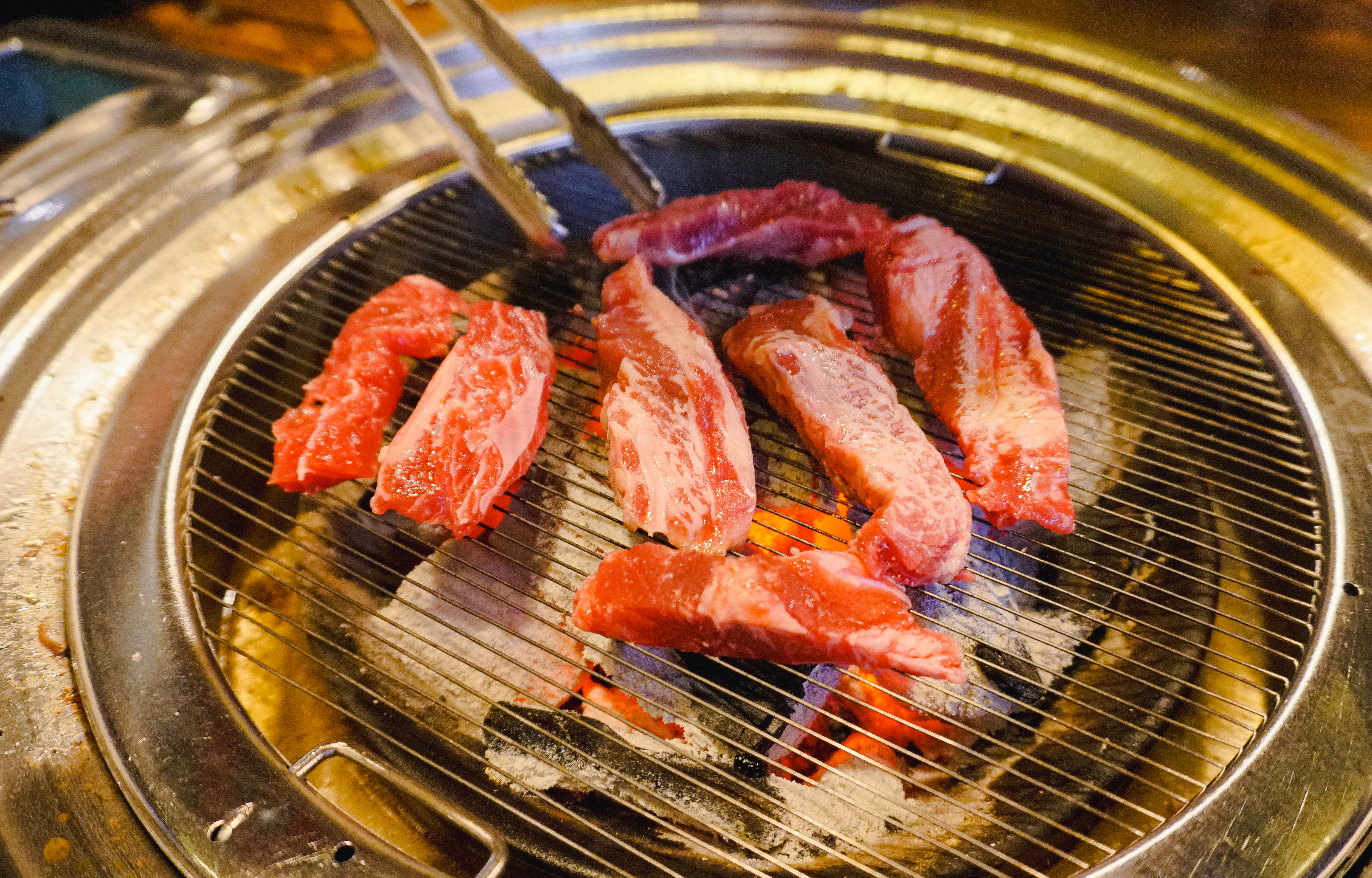 고기를 구울 숯불이 준비되었고, 소고기 꽃등심, 토시살, 부채살, 갈비살이 나왔습니다. 저는 셀프코너에서 같이 구울 버섯과 마늘을 가져왔고, 불판이 어느 정도 달궈졌을 때 소고기를 올려 구워주었습니다.