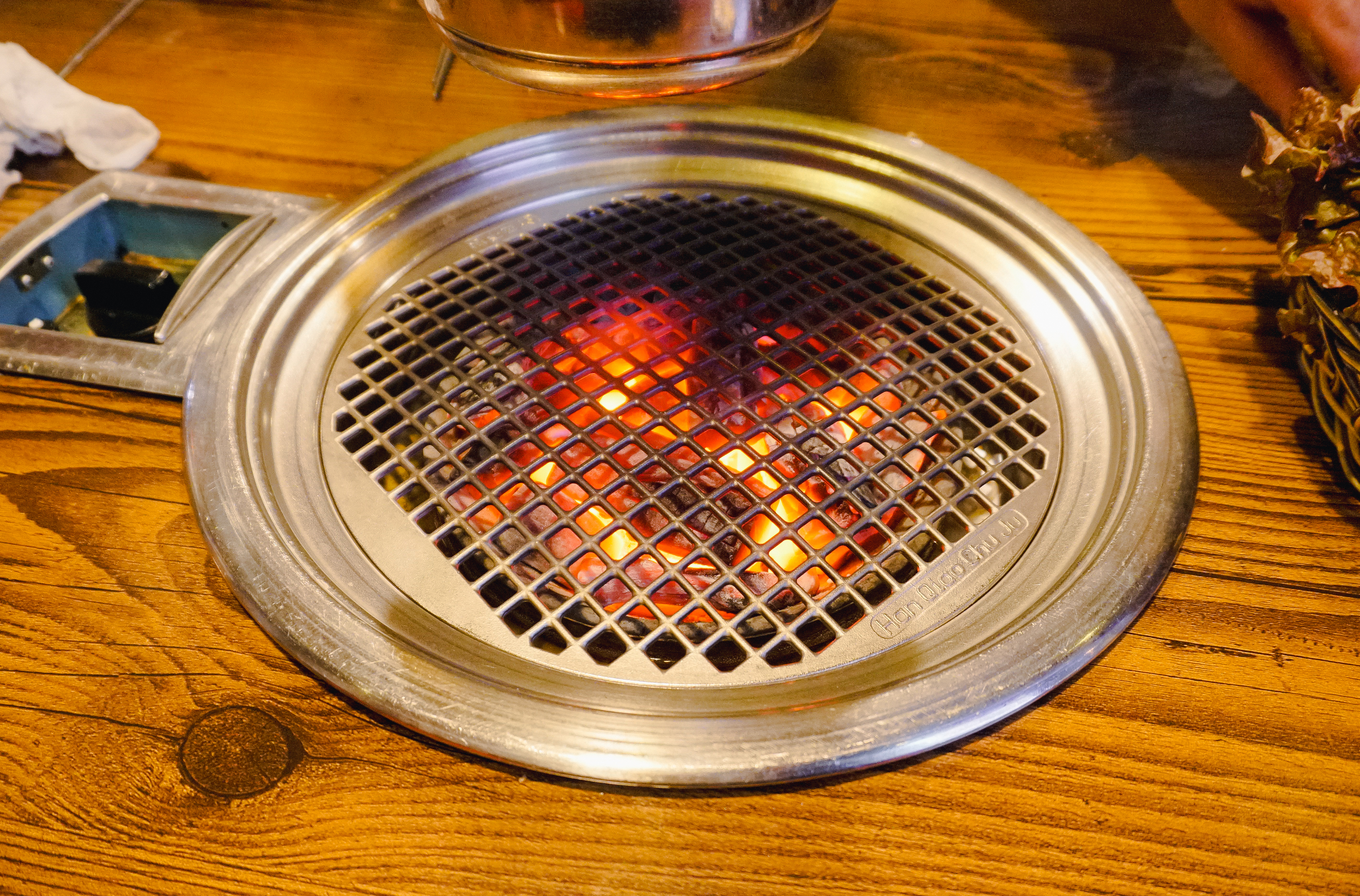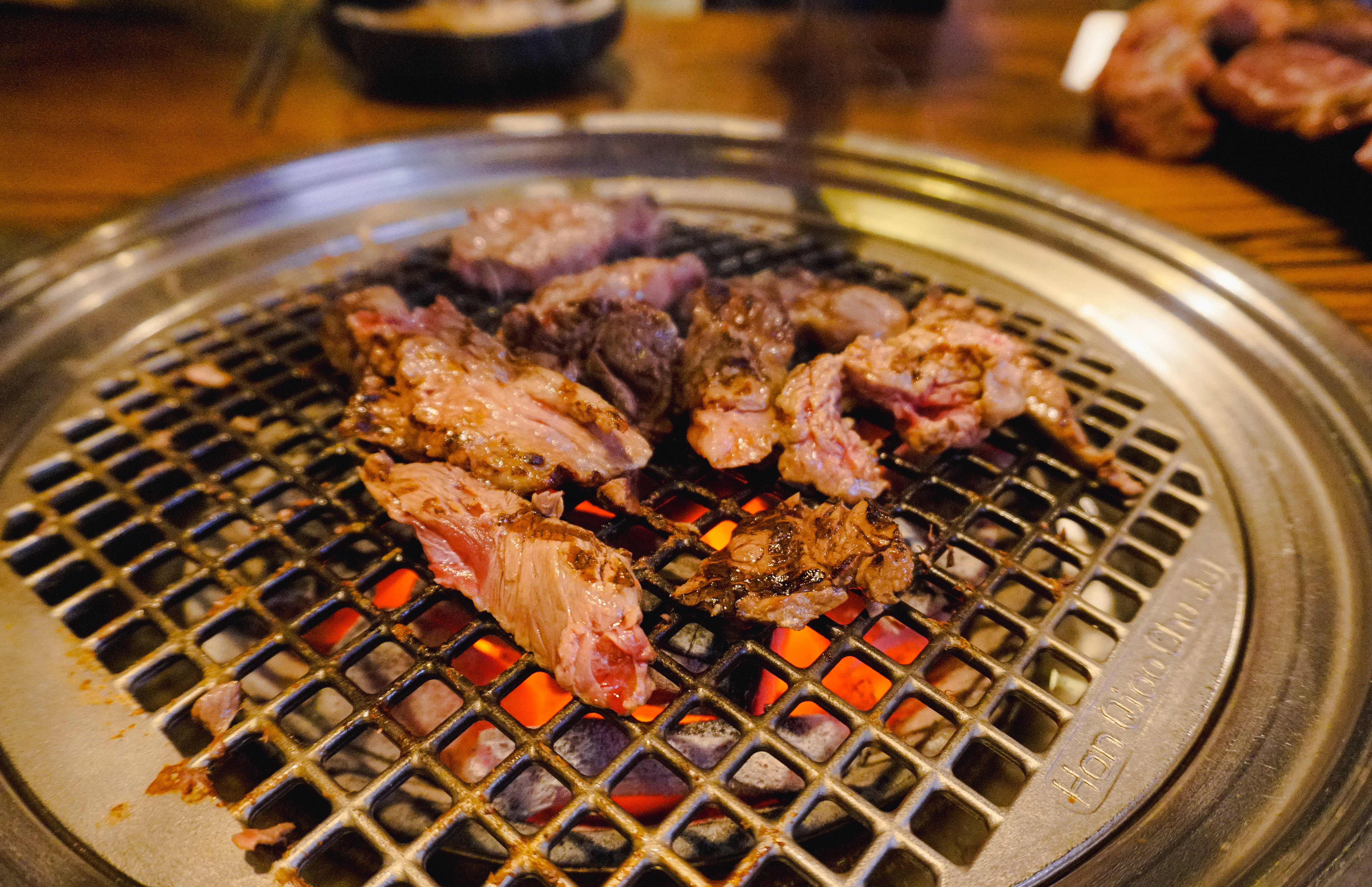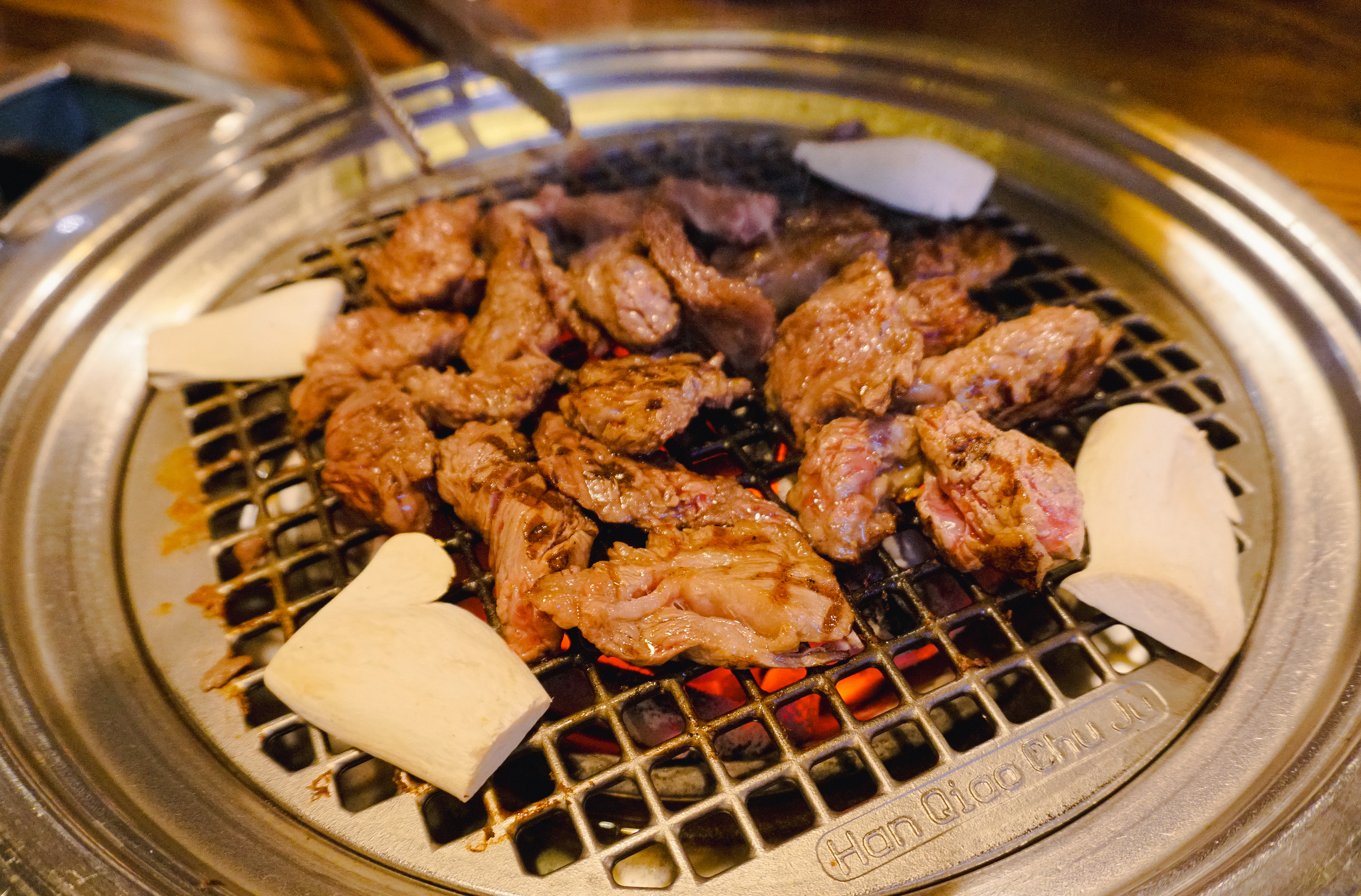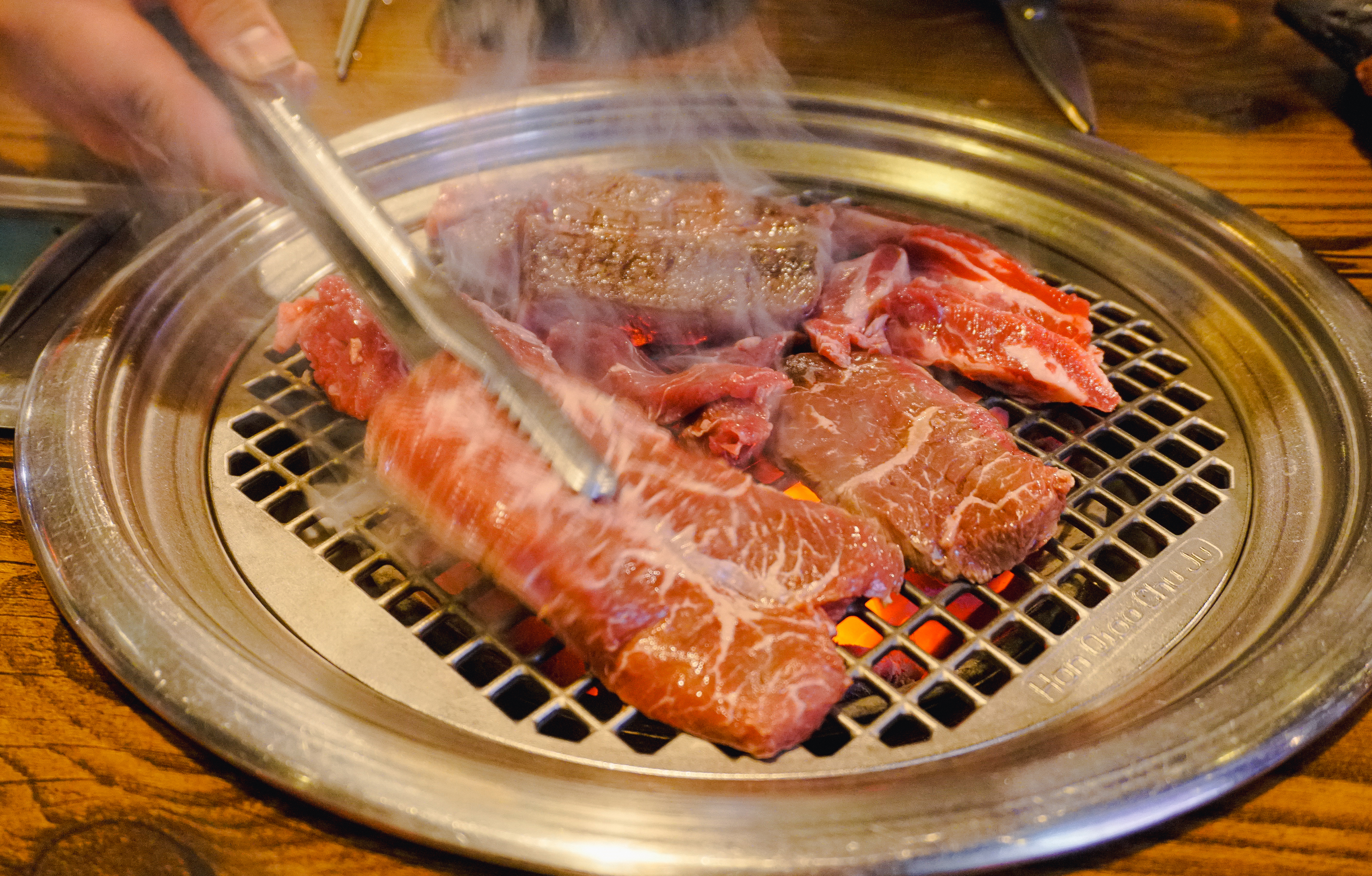 고기를 구울 숯불이 준비되었고, 소고기 꽃등심, 토시살, 부채살, 갈비살이 나왔습니다. 저는 셀프코너에서 같이 구울 버섯과 마늘을 가져왔고, 불판이 어느 정도 달궈졌을 때 소고기를 올려 구워주었습니다.