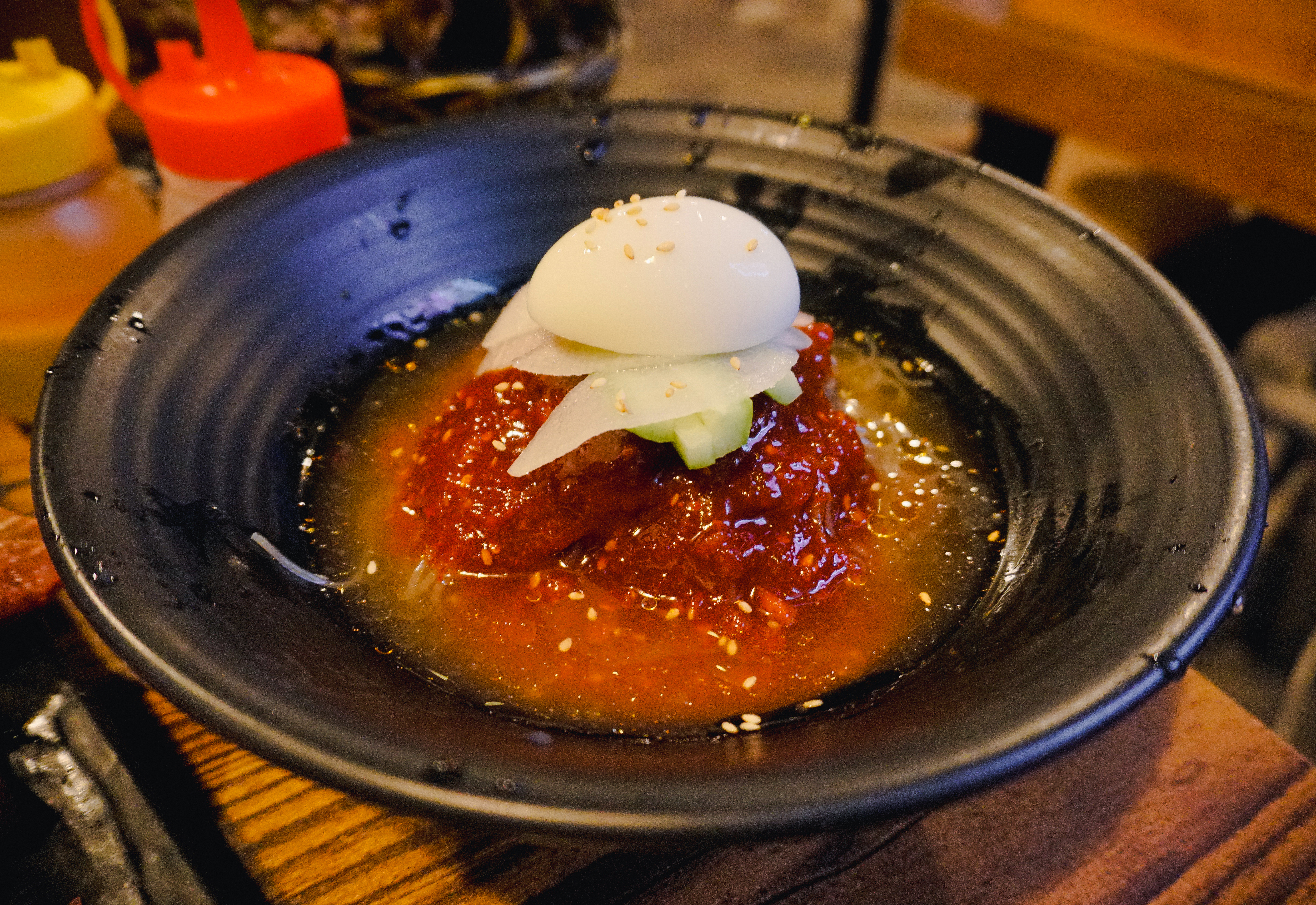 더프라임하우스의 소고기는 겉에만 살짝 익혀서 먹기엔 좀 질겅이는 식감이 있었고, 저는 겉을 바짝 익혀서 먹는 게 맛있더라고요. 양파소스나 소금과 같이 먹으니 괜찮았고요. 저희는 고기와 같이 먹을 냉면을 주문했습니다.