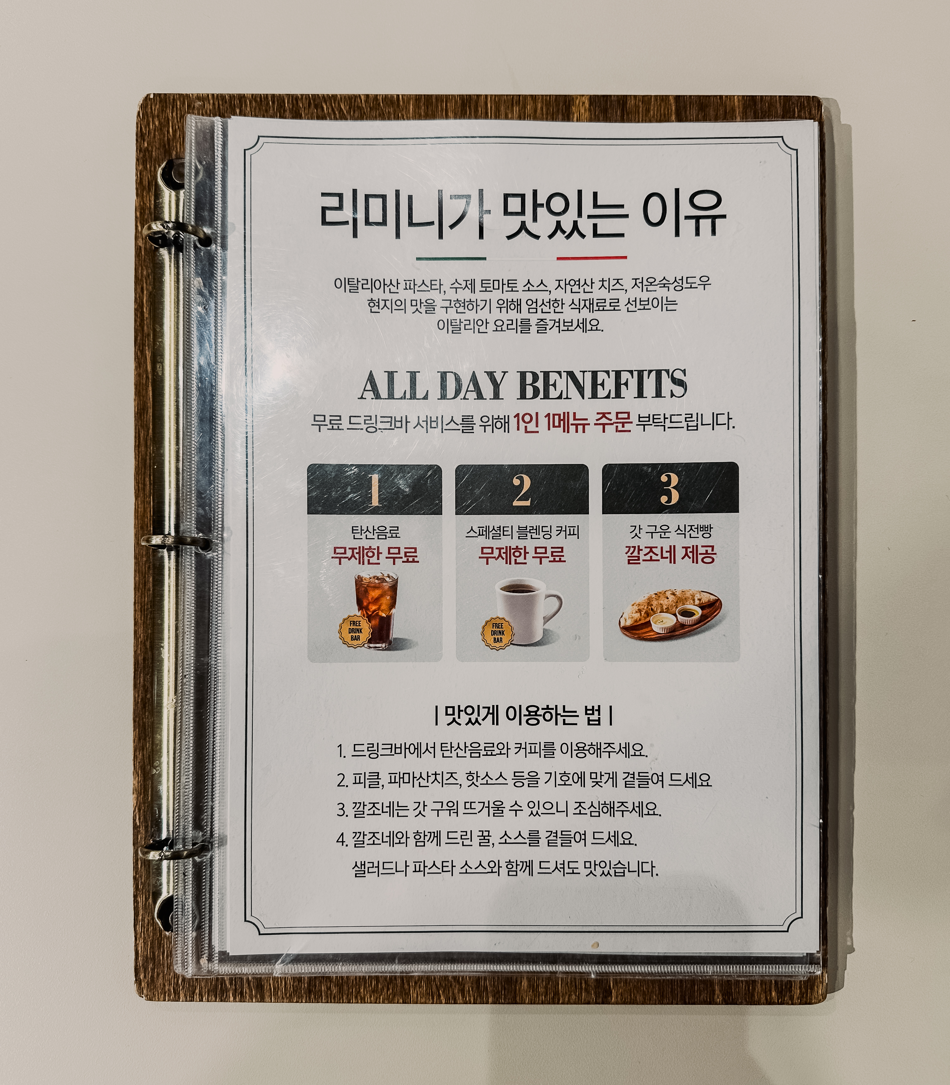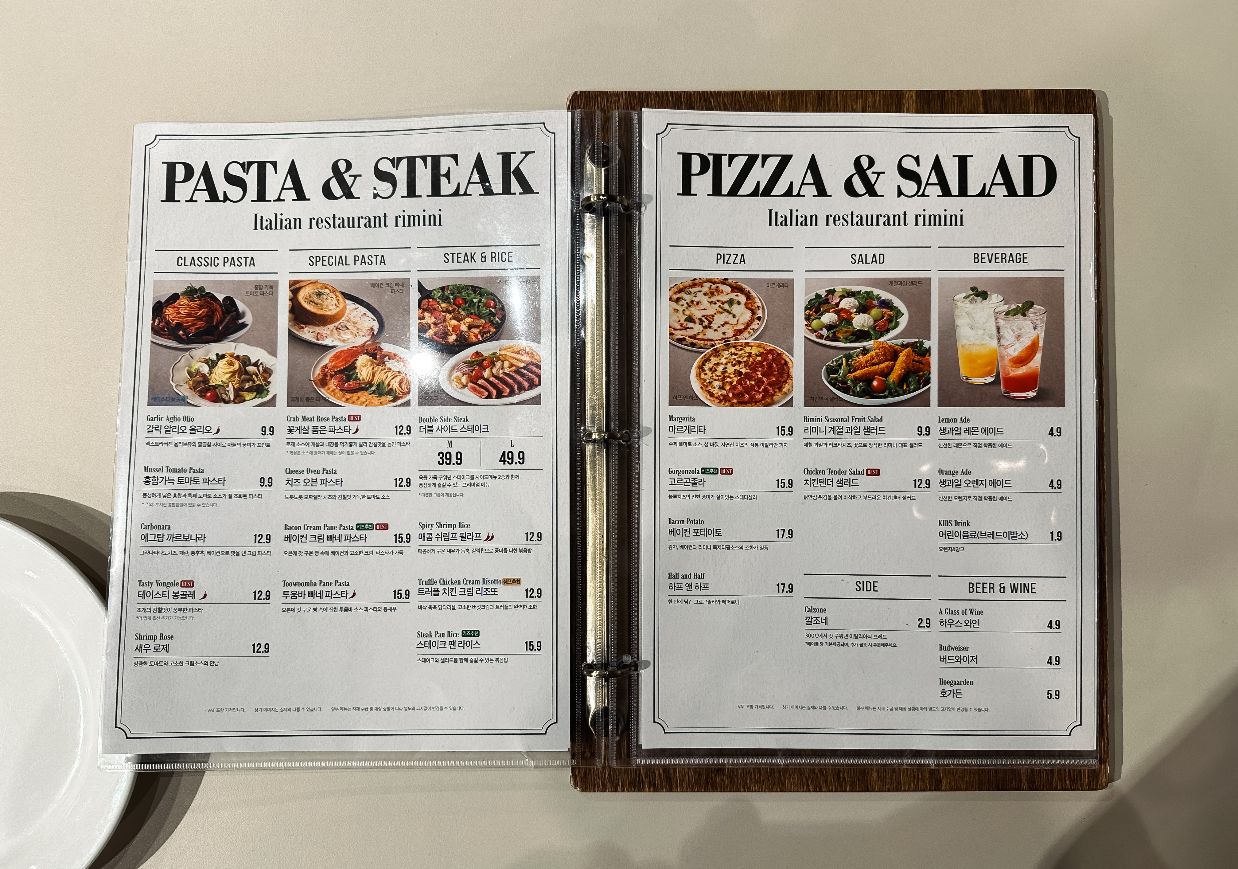 리미니의 메뉴는 갈릭알리오올리오, 홍합가득토마토파스타, 에그탑까르보나라, 테이스티봉골레, 새우로제, 꽃게살품은파스타, 치즈오븐파스타, 베이컨크림빠네파스타, 투움바빠네파스타, 마르게리타, 고르곤졸라, 베이컨포테이토, 하프앤하프, 매콤쉬림프필라프, 트러플치킨크림리조또, 스테이크팬라이스, 리미니계절과일샐러드, 치킨텐더샐러드, 더블사이드스테이크, 리미니듀오세트, 더블사이드스테이크세트, 패밀리세트 등이 있었습니다.