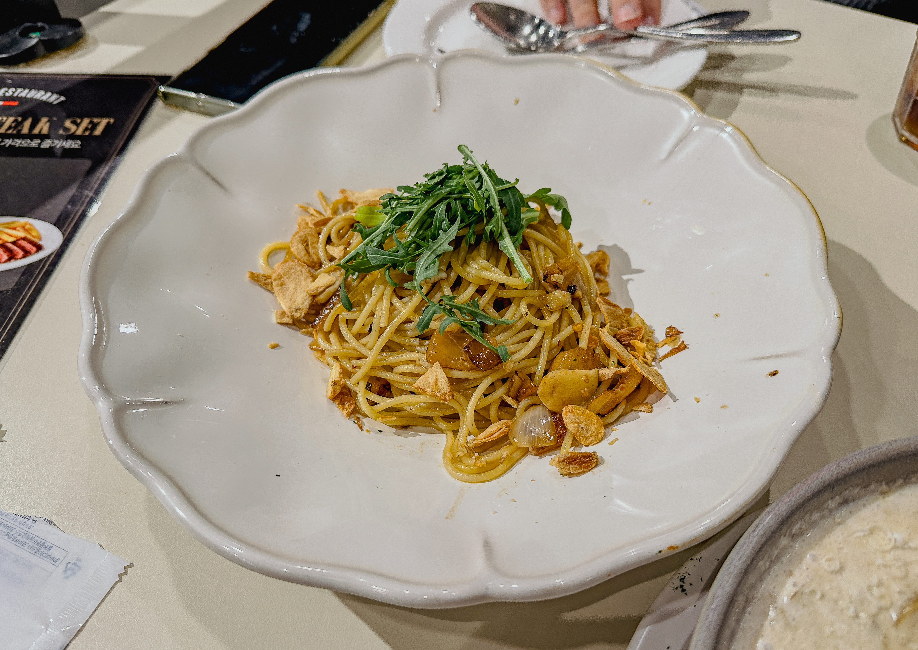 트러플치킨크림리조또라는 이름답게 리조또에는 오븐에 구운 닭고기가 들어가 있었고, 크림리조또답게 고소하고 부드러운 맛이 괜찮았습니다. 같이 주문했던 갈릭알리오올리로파스타는 면발을 살짝 덜 익혀서 식감도 좋았고, 담백해서 좋았습니다.