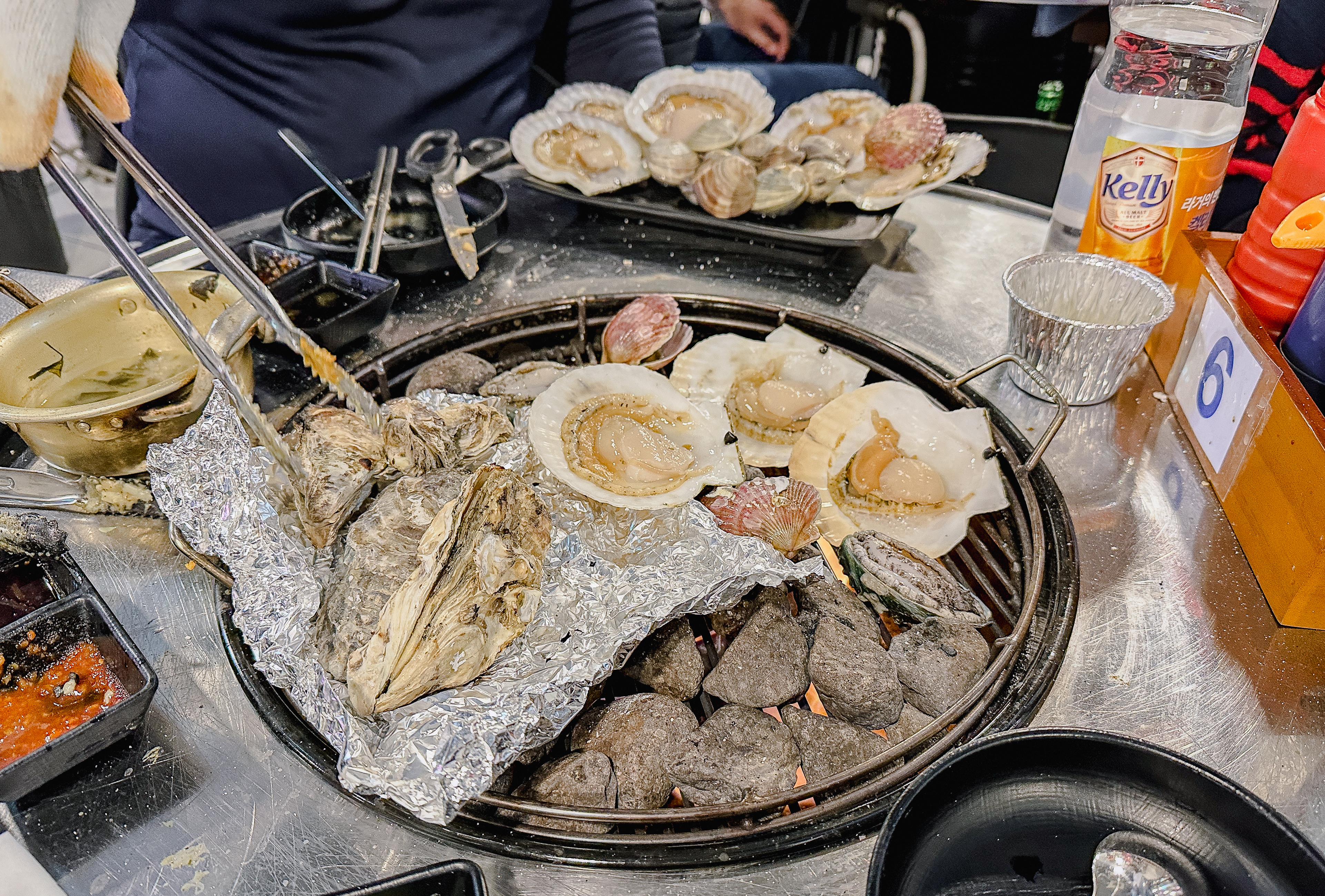 저희는 범고래 조개구이의 가리비, 굴, 전복을 먹었는데, 전체적으로 조개구이의 가격은 비싼 느낌이 있었지만, 신선한 느낌이었고 맛도 괜찮았습니다. 조금 더 주문을 해서 가리비나 키조개도 먹었습니다.