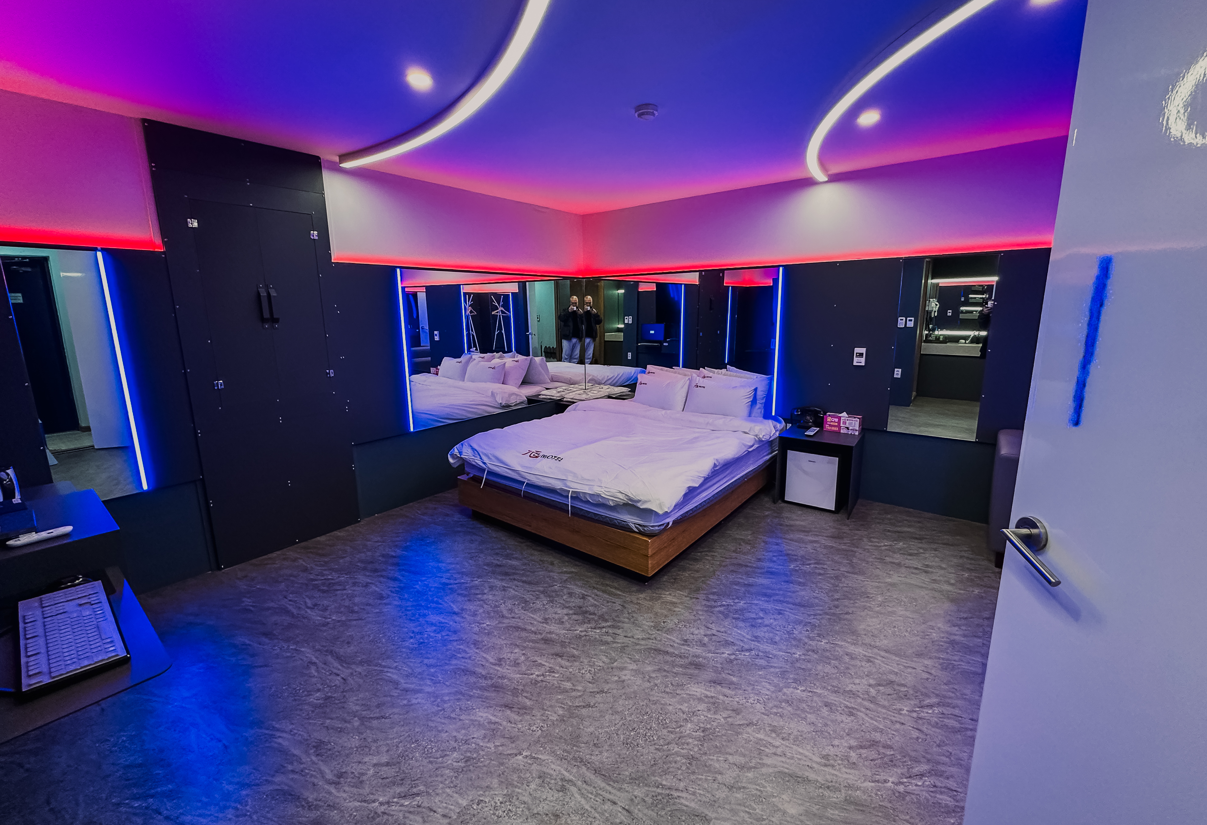 침실은 일단 넓고 인테리어도 최근에 해서 그런지 깔끔한 느낌이 있었습니다. 다만 원색의 조명을 사용해 아늑한 느낌보다는 조금 사이버틱(?)한 분위기를 연출하고 있었습니다. 참고로, 난방도 직접 켜고 끌 수 있어서 따뜻하게 지낼 수 있었습니다.