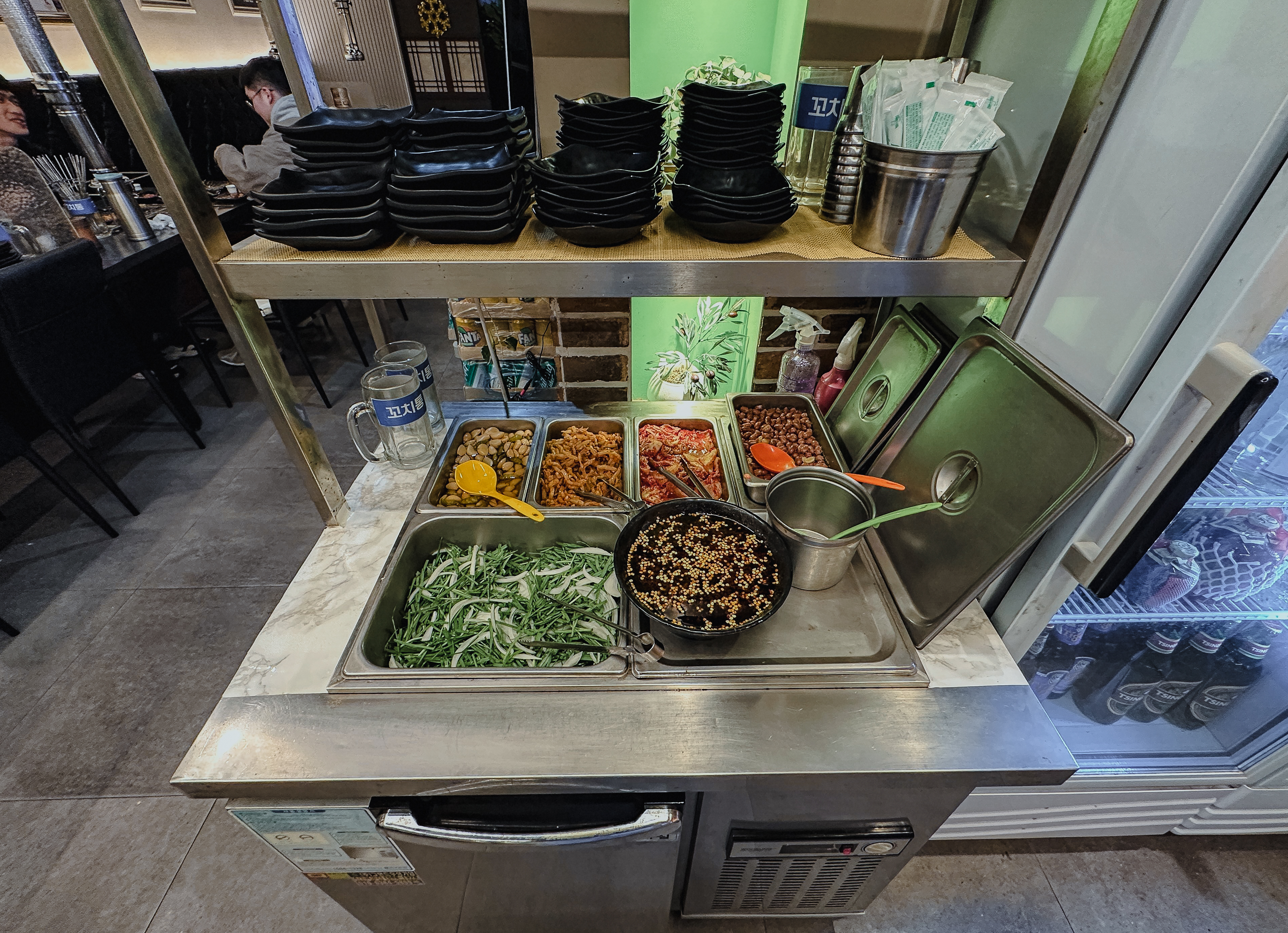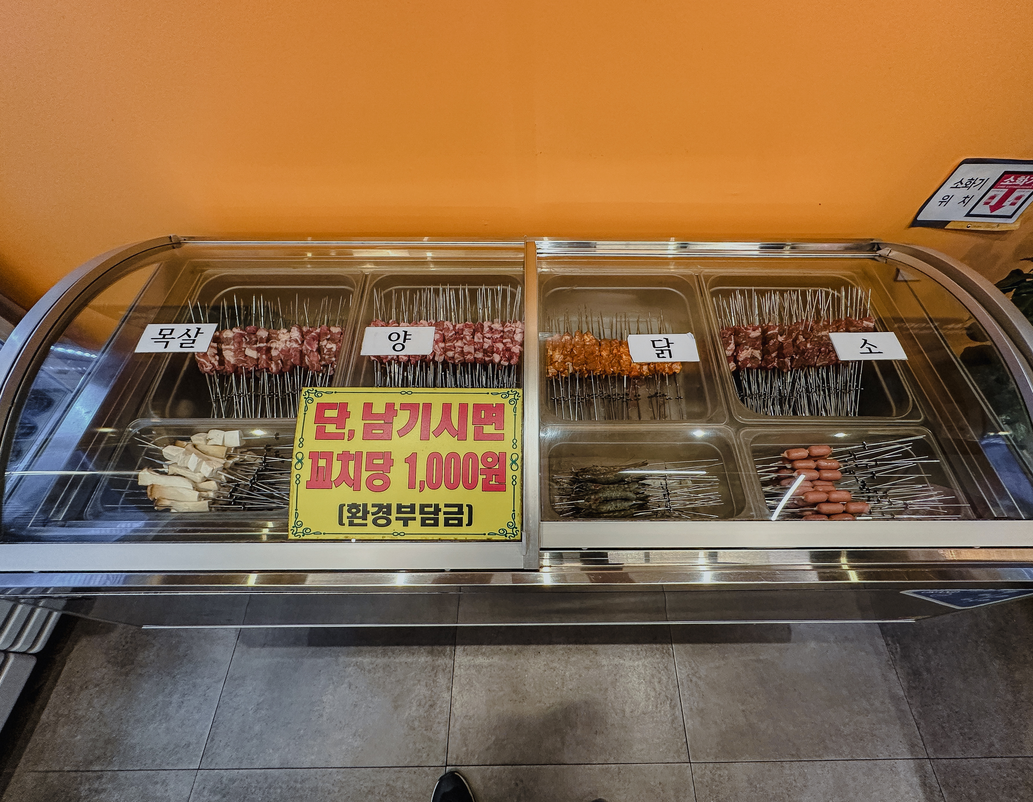 미사 램프리에서 무한리필 메뉴를 주문하면 기본적으로 양꼬치, 목살, 소고기, 닭고기, 새우, 소시지, 버섯 꼬치와 반찬으로 부추무침, 자차이, 땅콩을 제공하고 있었습니다. 셀프코너에 가면 마늘장아찌, 김치 같은 추가 반찬이 있었고, 꼬치를 먹다가 부족하면 추가로 냉장고에서 가져다 먹을 수 있었습니다.