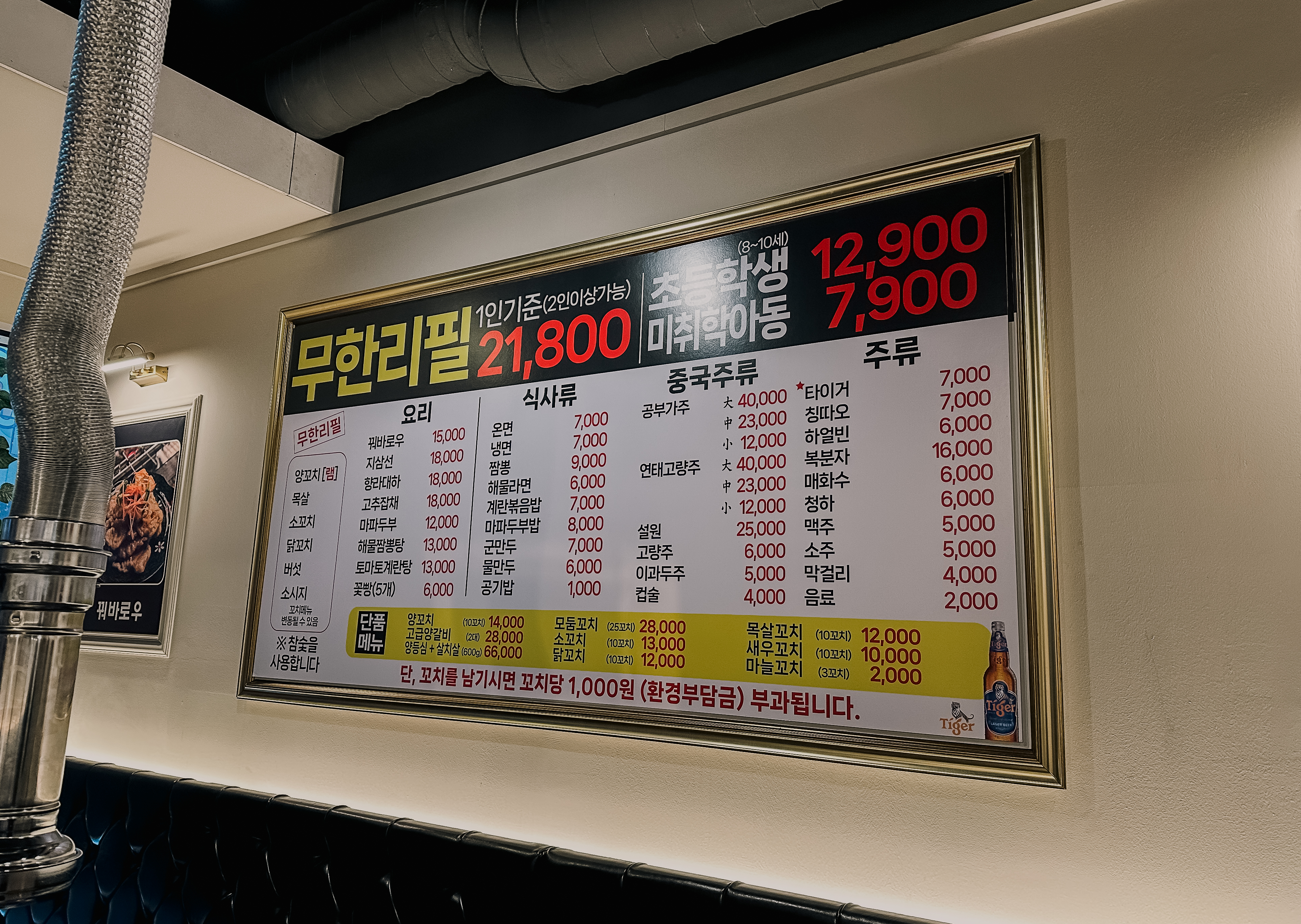 메뉴는 기본 양꼬치 무한리필 21,800원이 있었고, 그밖에 꿔바로우, 지삼선, 향라대하, 고추잡채, 마파두부, 해물짬뽕탕, 토마토계란탕, 꽃빵, 온면, 냉면, 짬뽕, 해물라면, 계란볶음밥, 마파두부밥, 군만두, 물만두 등이 있었습니다. 단품으로 꼬치를 주문할 수도 있었지만, 대부분 무한리필로 주문하기 때문에 소개는 생략하겠습니다.