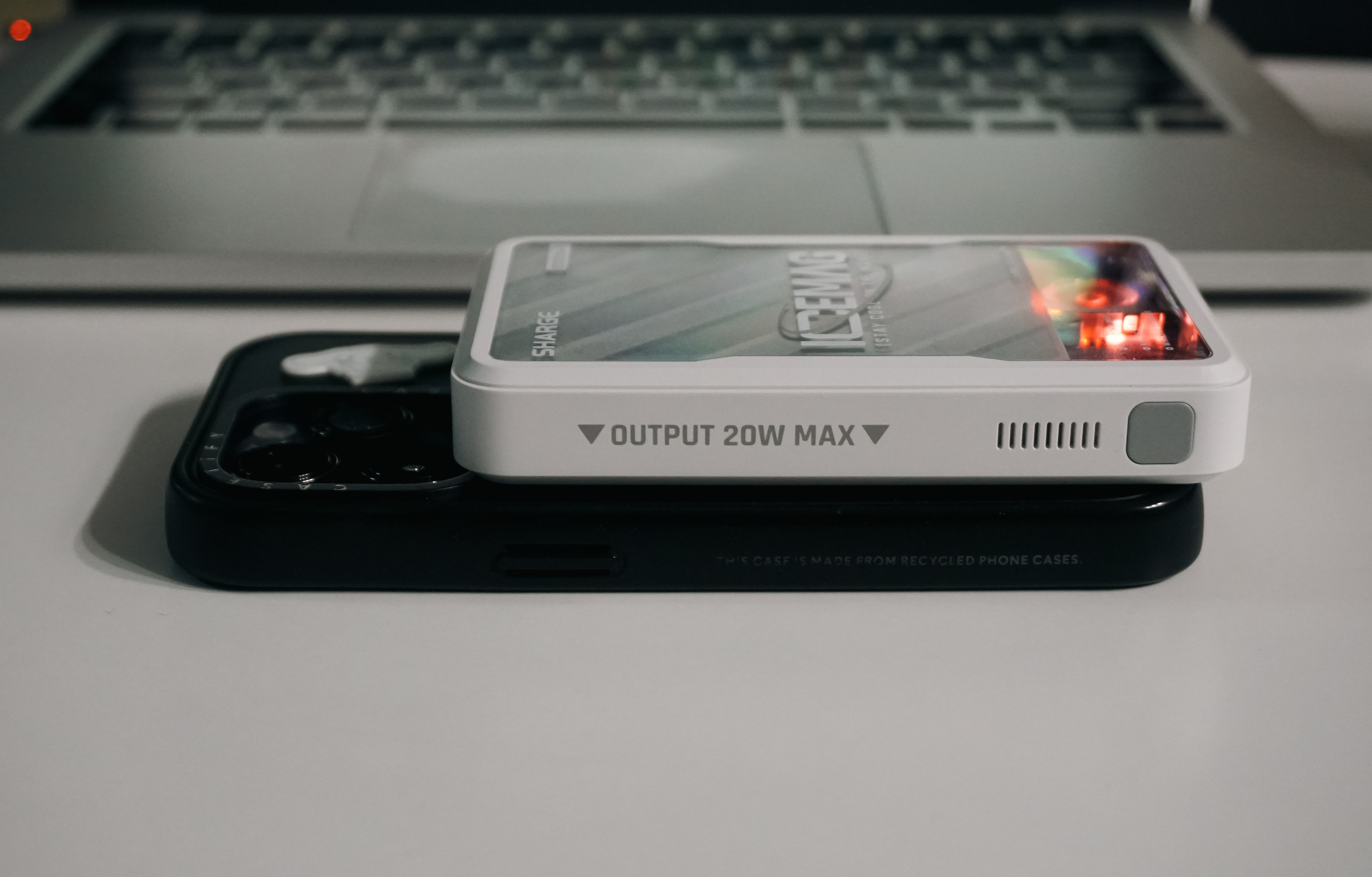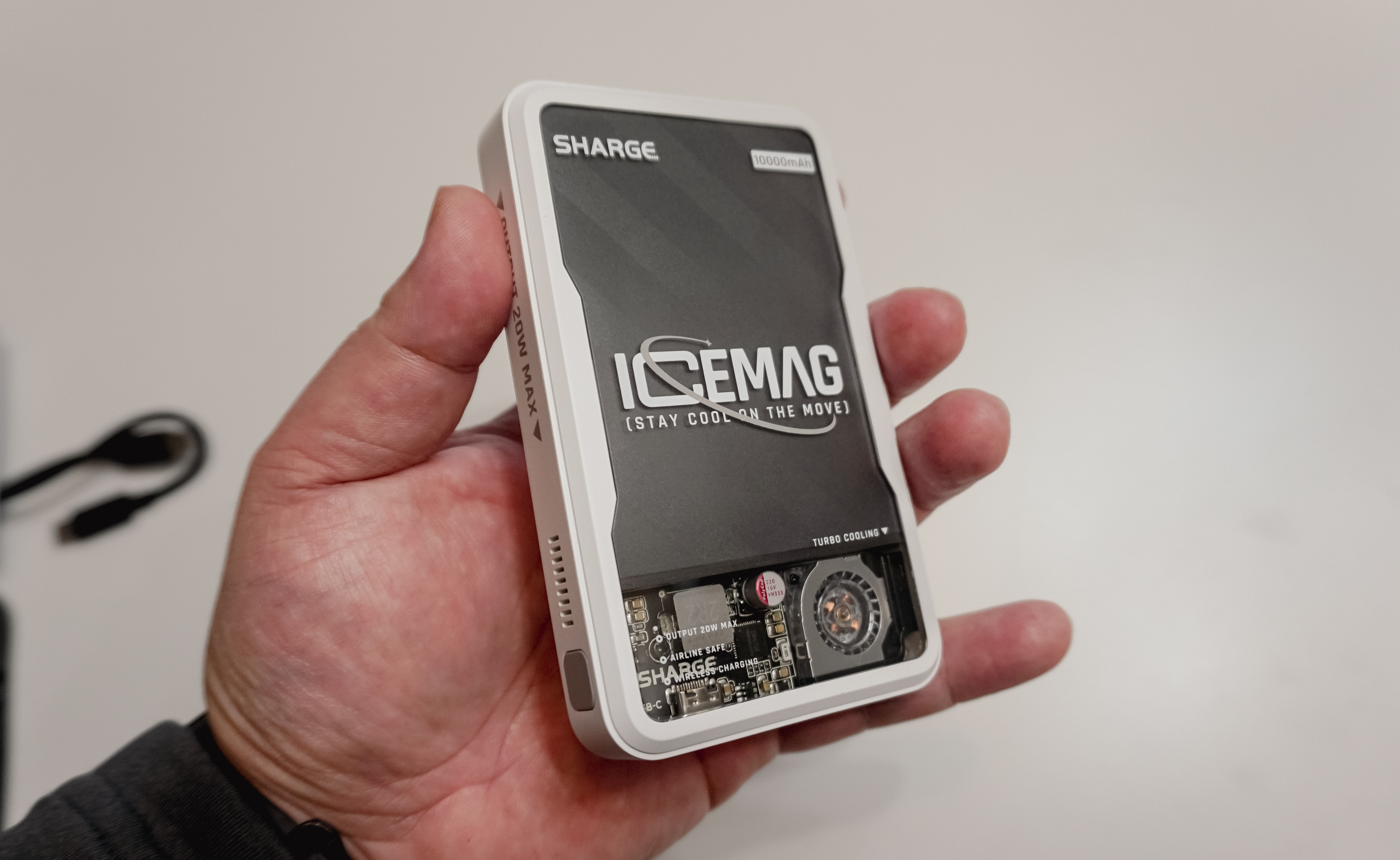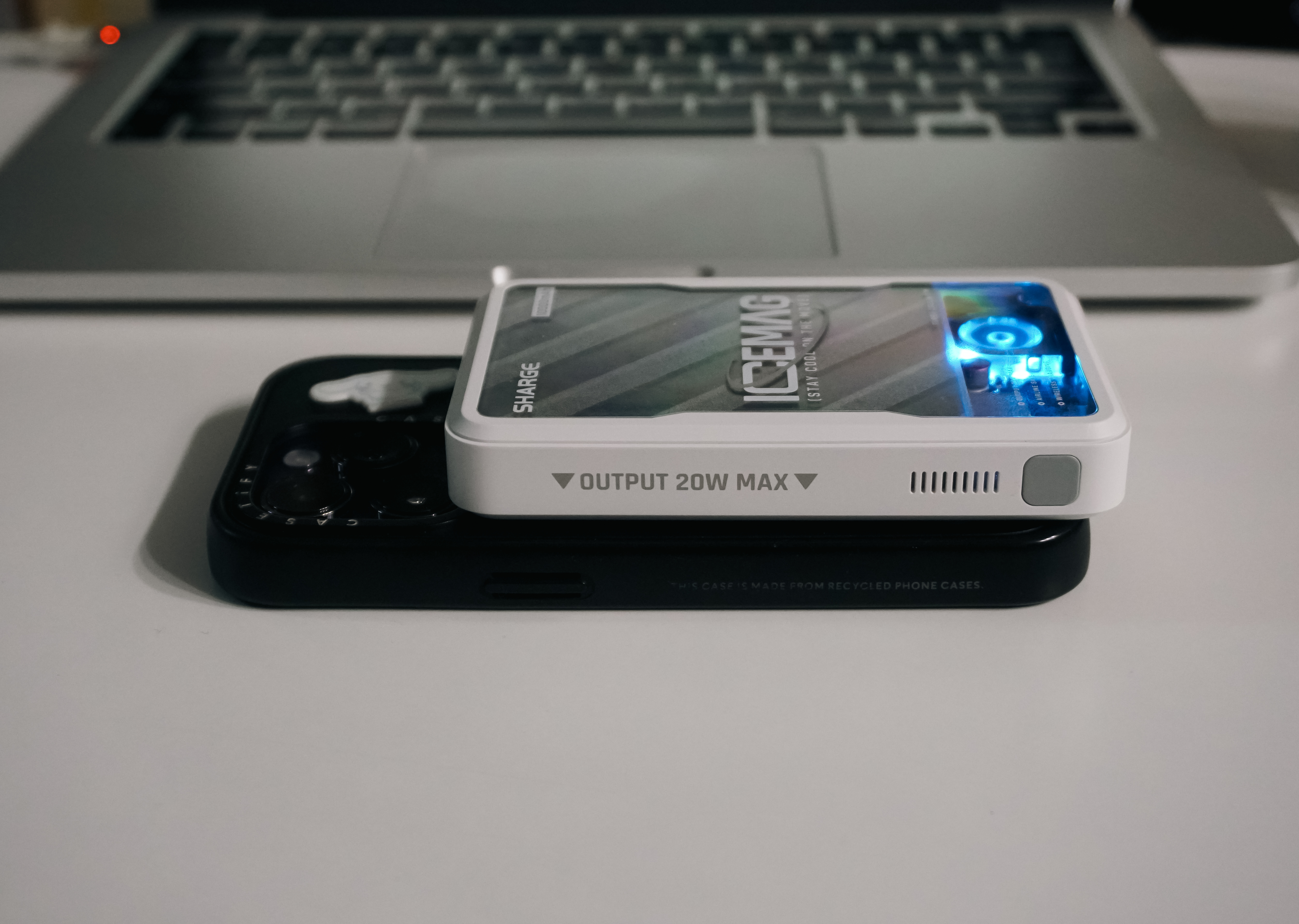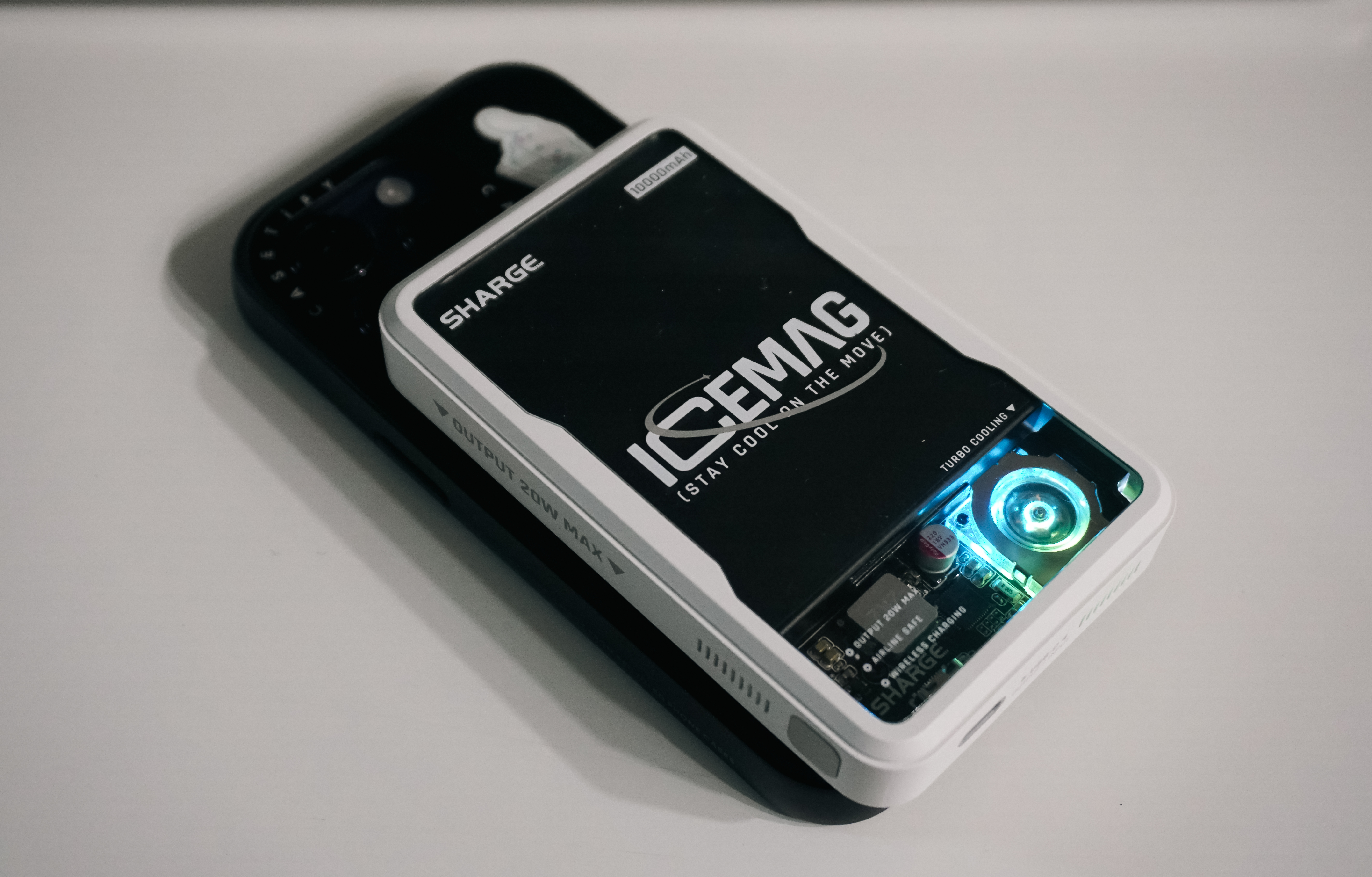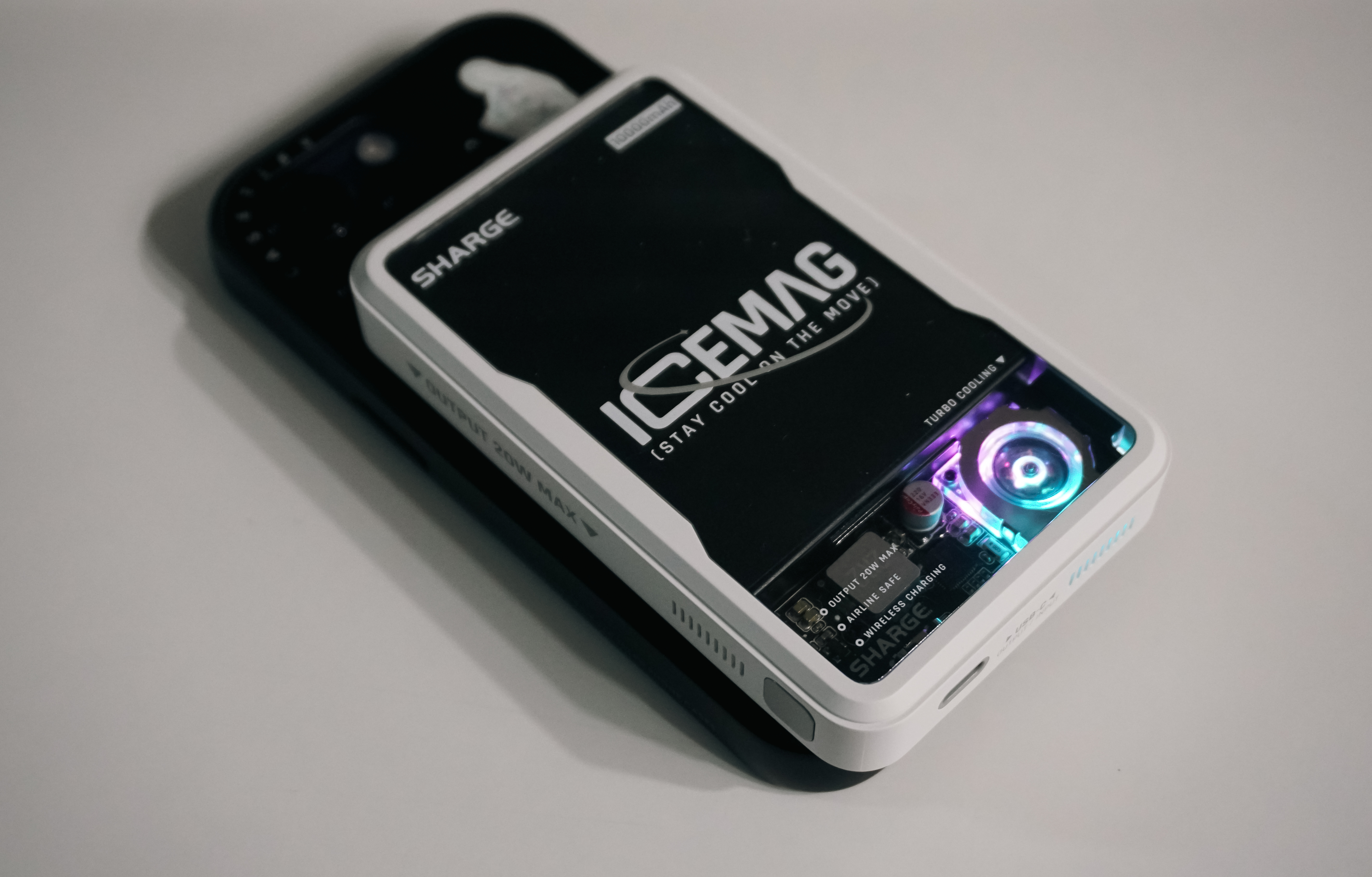 SHARGE 아이스맥의 특징을 설명하자면 20W USB-C 포트를 지원하고 있고, 무선충전기 형태로 패스스루가 가능하며, 맥세이프 형태의 자성을 띠고 있어 아이폰에 부착하여 사용하거나, USB C 포트를 지원하는 기기에 유선충전을 하거나, 무선충전으로 충전을 시킬 수도 있었습니다. 쿨링팬과 멋진 LED 조명이 달려있어 시각적으로는 만족스럽지만, 막상 들어보면 조금 부담스러운 크기와 무게가 아쉽기도 한 제품이었습니다.