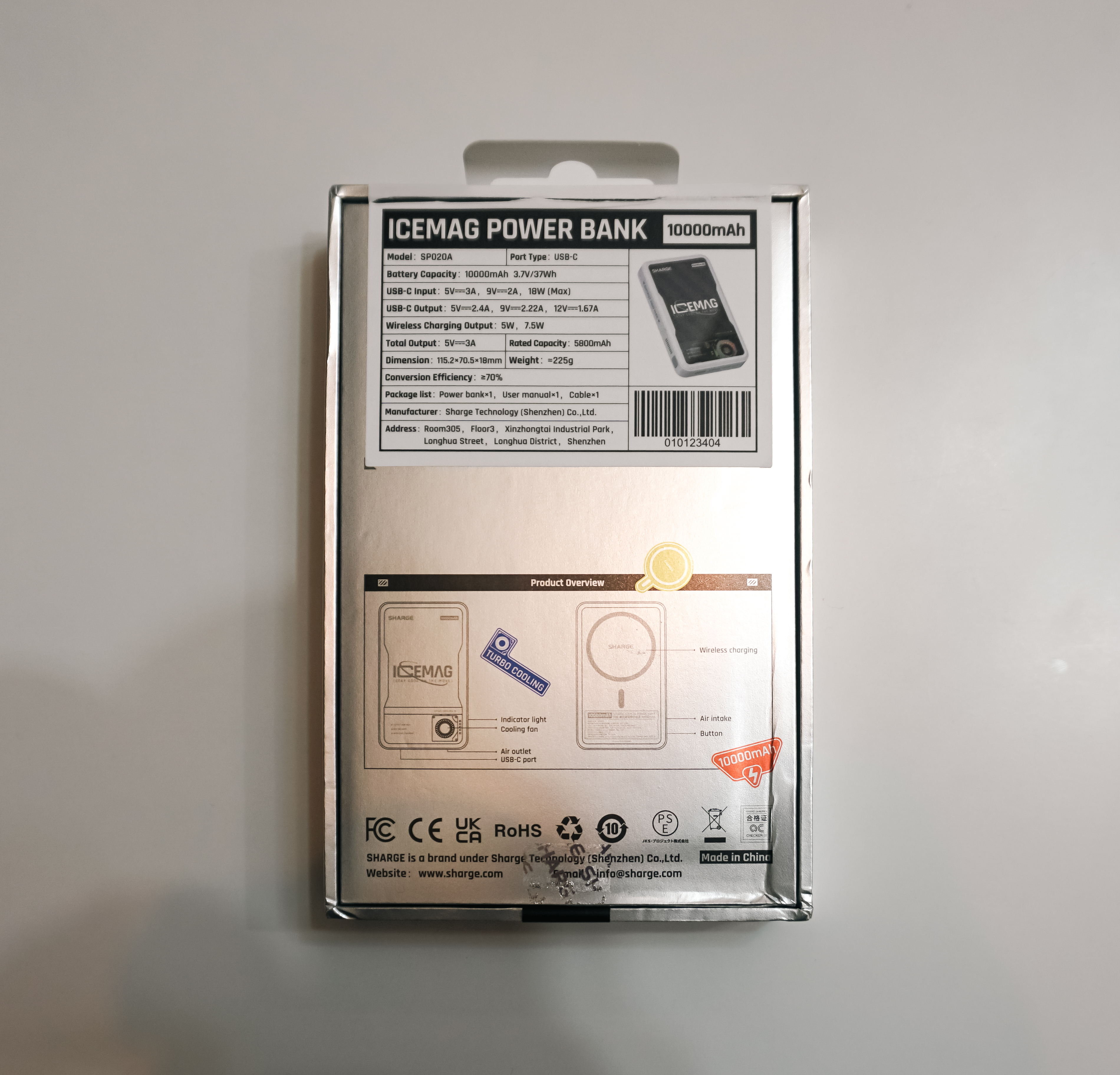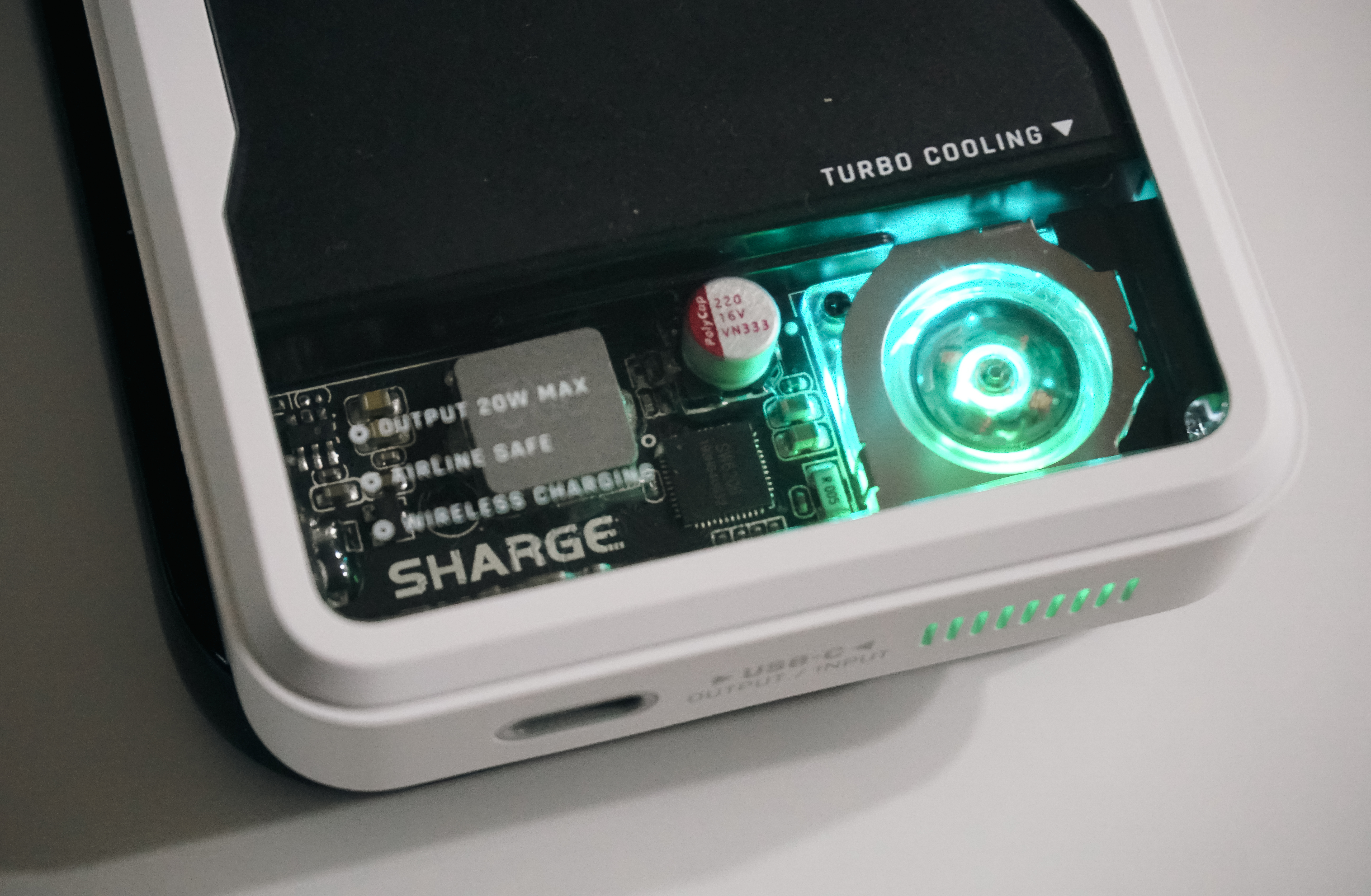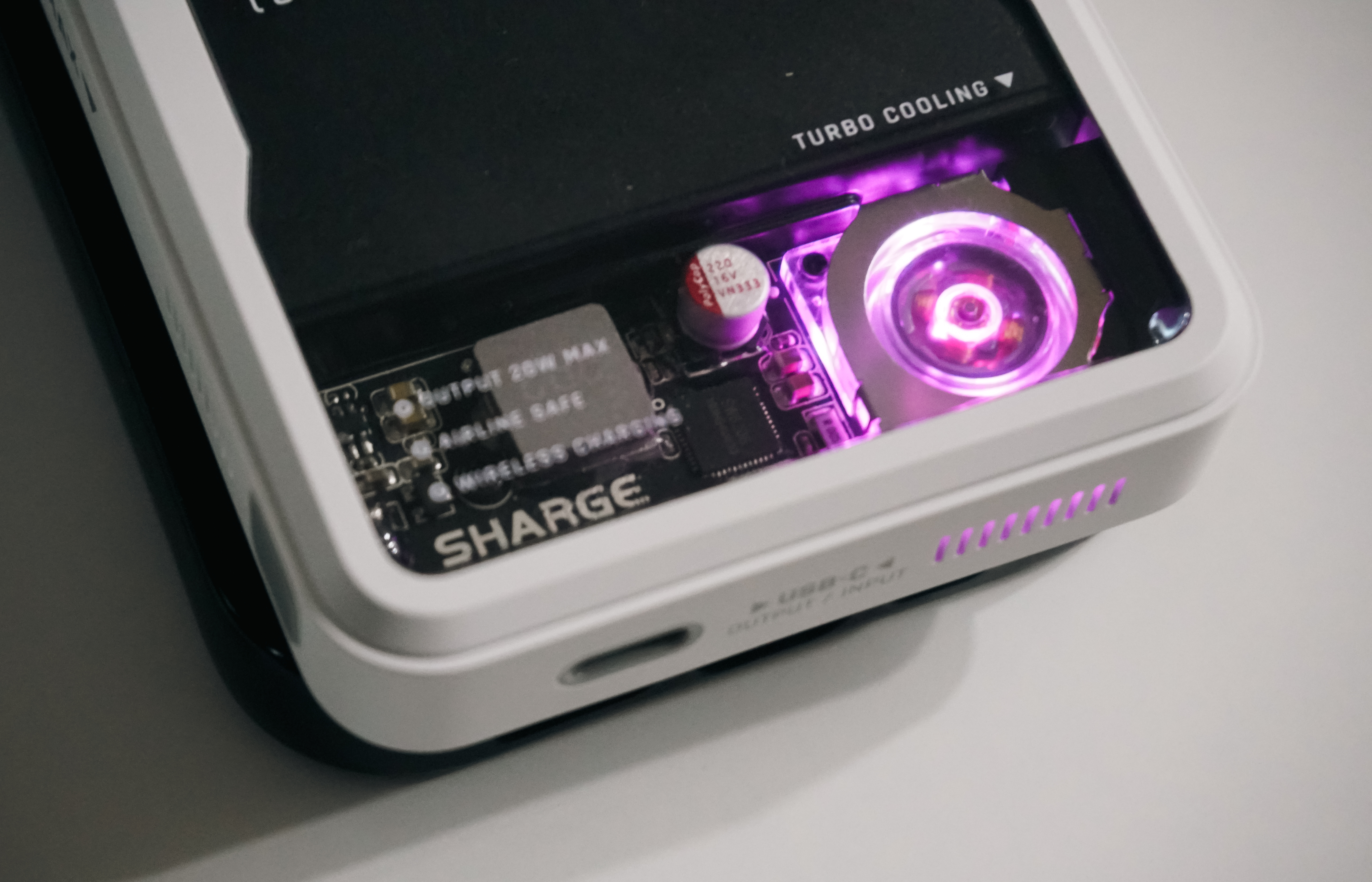 SHARGE 아이스맥은 독특한 것이 PC처럼 쿨링팬이 달려있는 것이 특징이었고, 게다가 쿨링팬에 LED 조명이 달려있어 충전 중에는 멋진 조명이 테크충에게는 안 살 수가 없는 비주얼이었죠. 본체의 하단부에는 USB-C 타입 충전포트가 있었습니다.