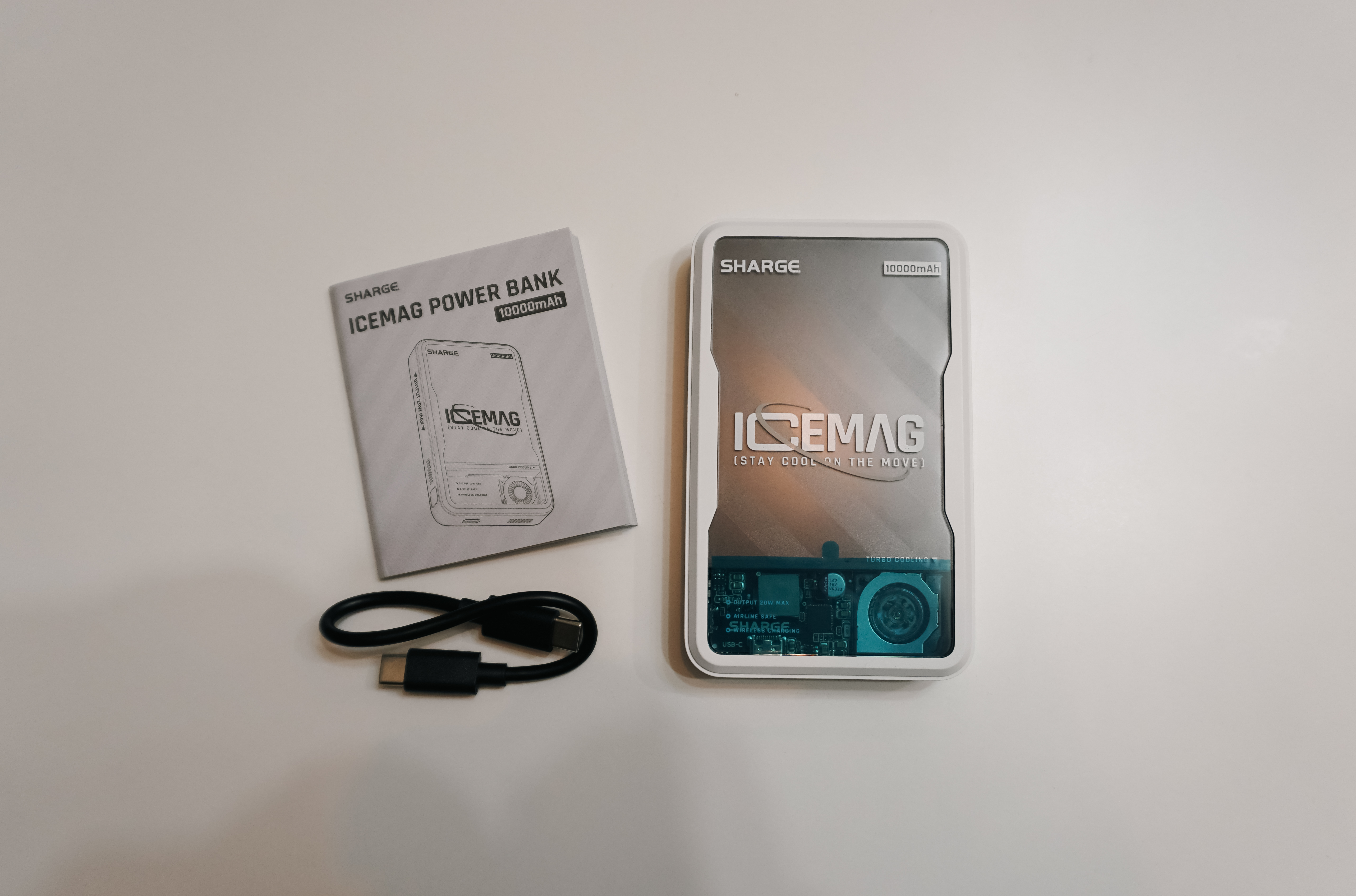 SHARGE 아이스맥의 구성품을 자세히 살펴보면, 보조배터리 본체와 사용설명서, USB C to C 케이블이 있었습니다. 이제 아이스맥 보조배터리를 자세히 들여다보실까요?