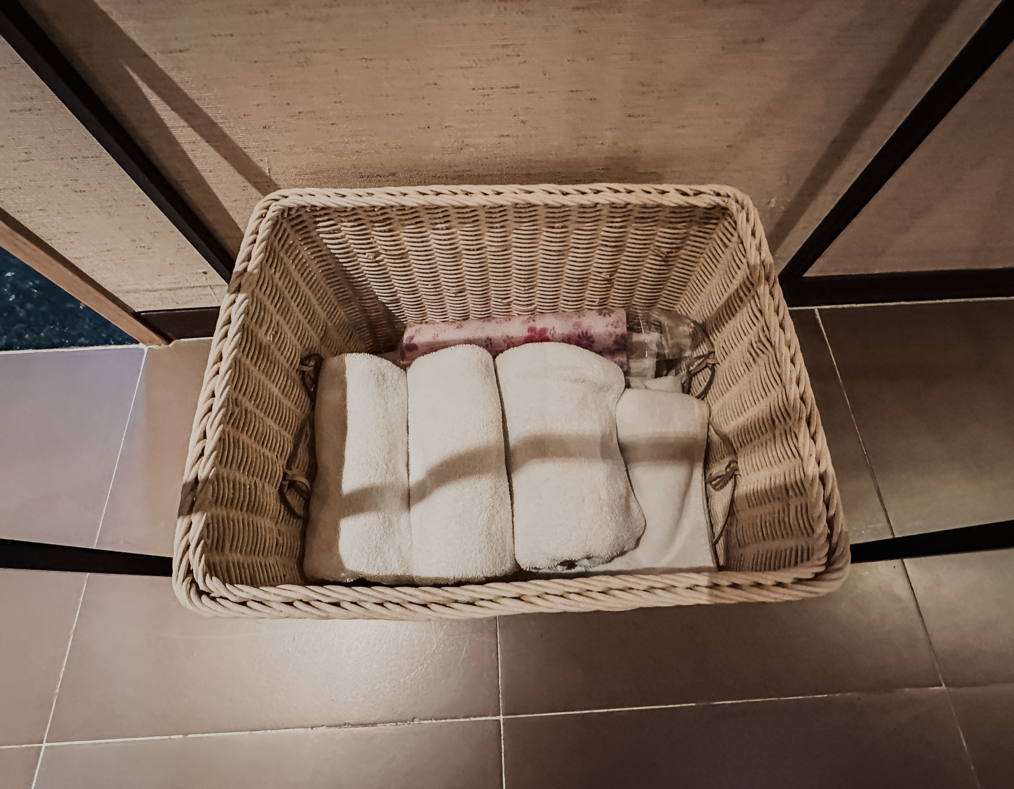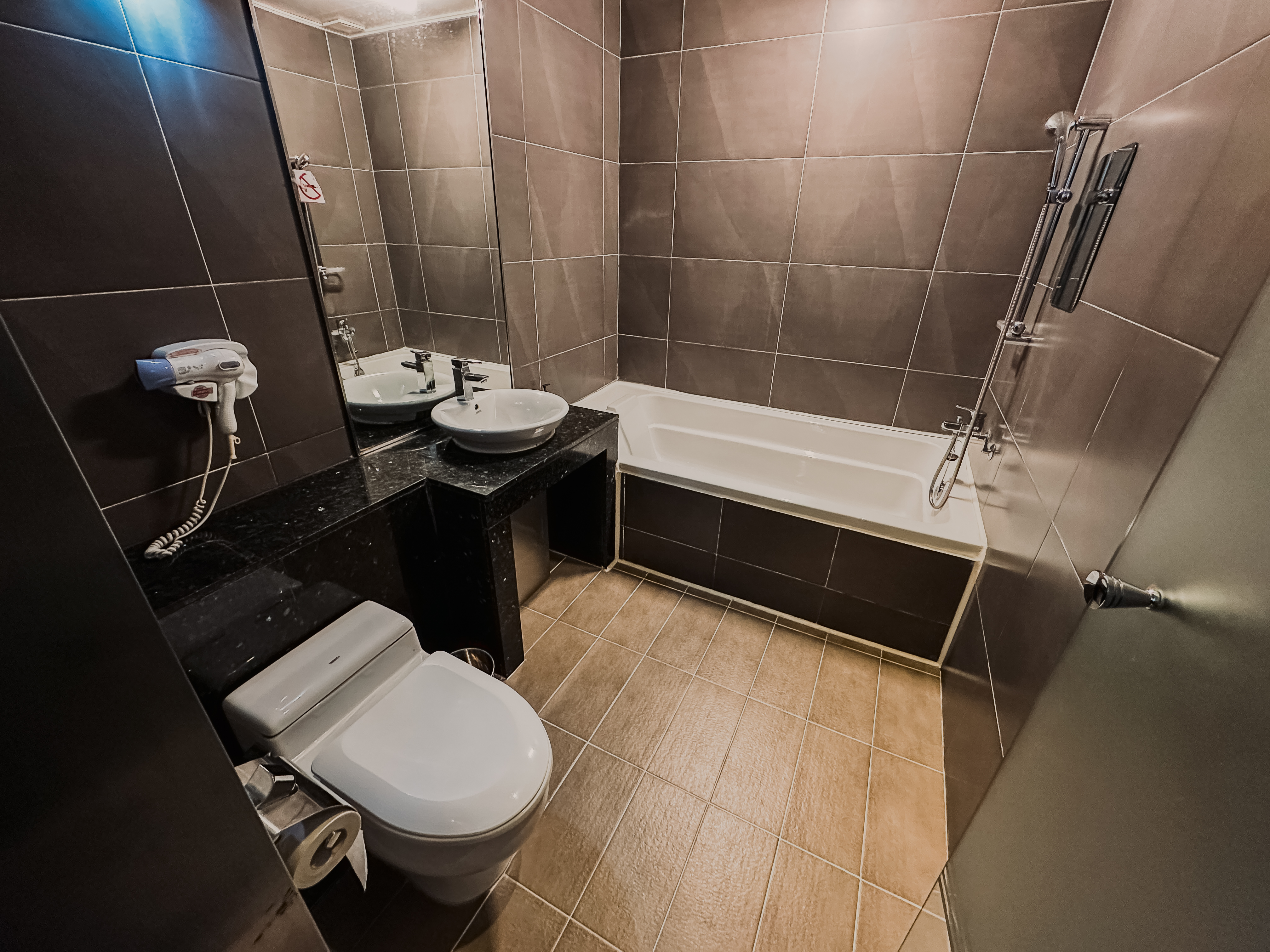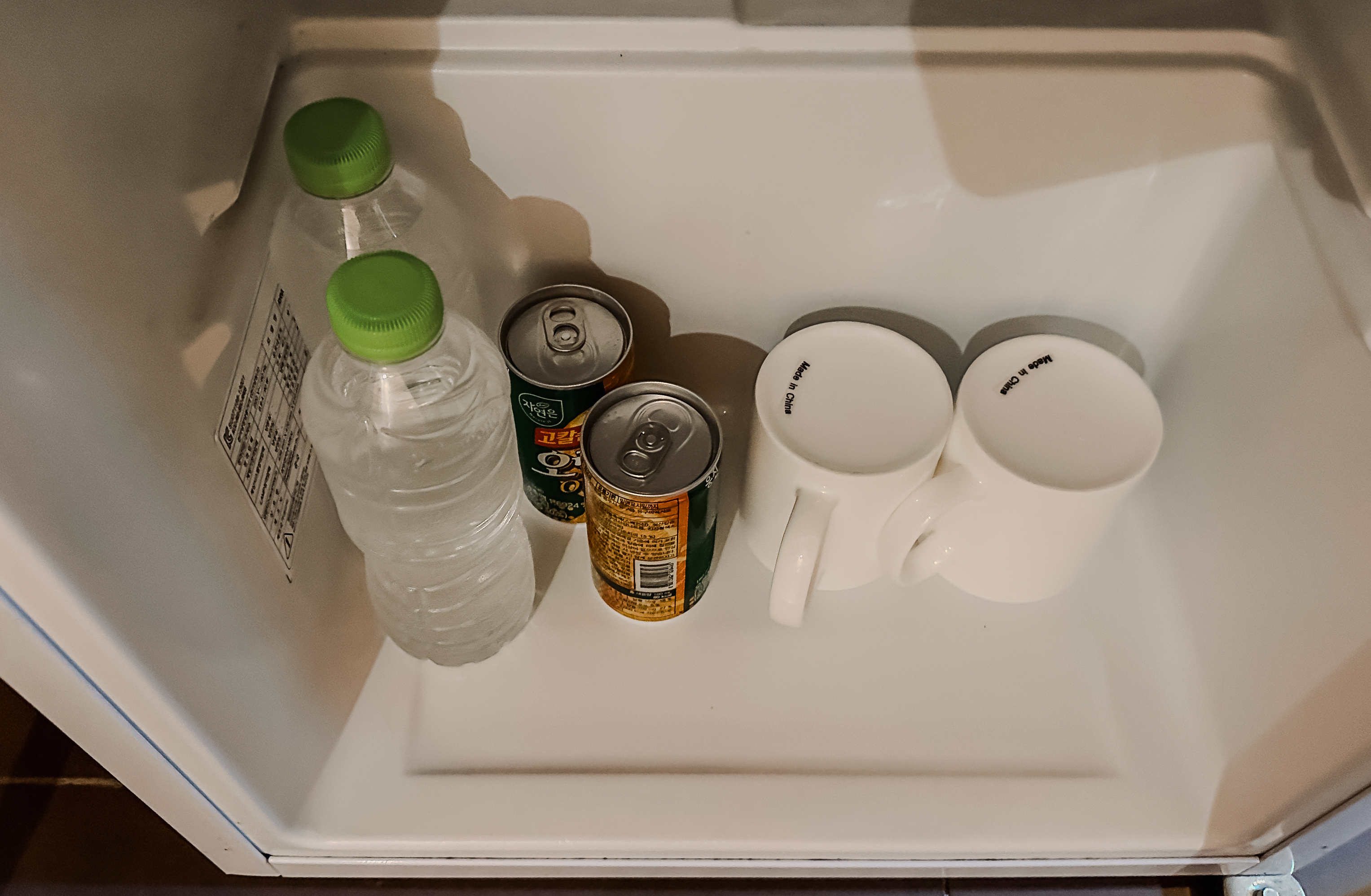 제가 투숙한 객실은 위와 같은 분위기였습니다. 객실의 크기도 꽤 넓은 편이었고, 조명 또한 너무 밝거나 하지 않아서 휴식을 취하기에 적당했습니다. 또한 객실에는 수건과 샤워타월 등 세면에 필요한 일회용품들도 비치되어 있었습니다. 그밖에 서비스 음료와 생수도 있었습니다. 이제 욕실도 한 번 살펴보시죠.