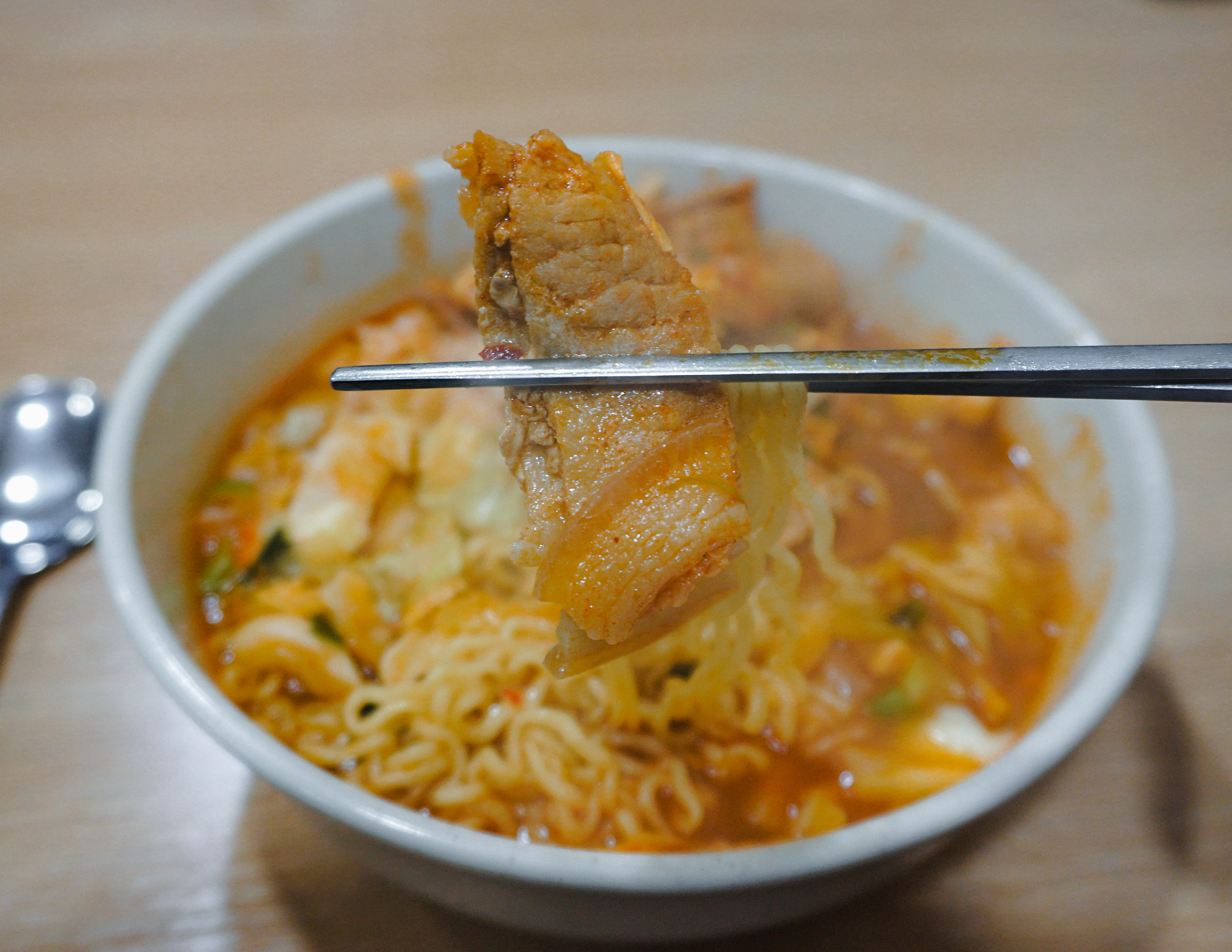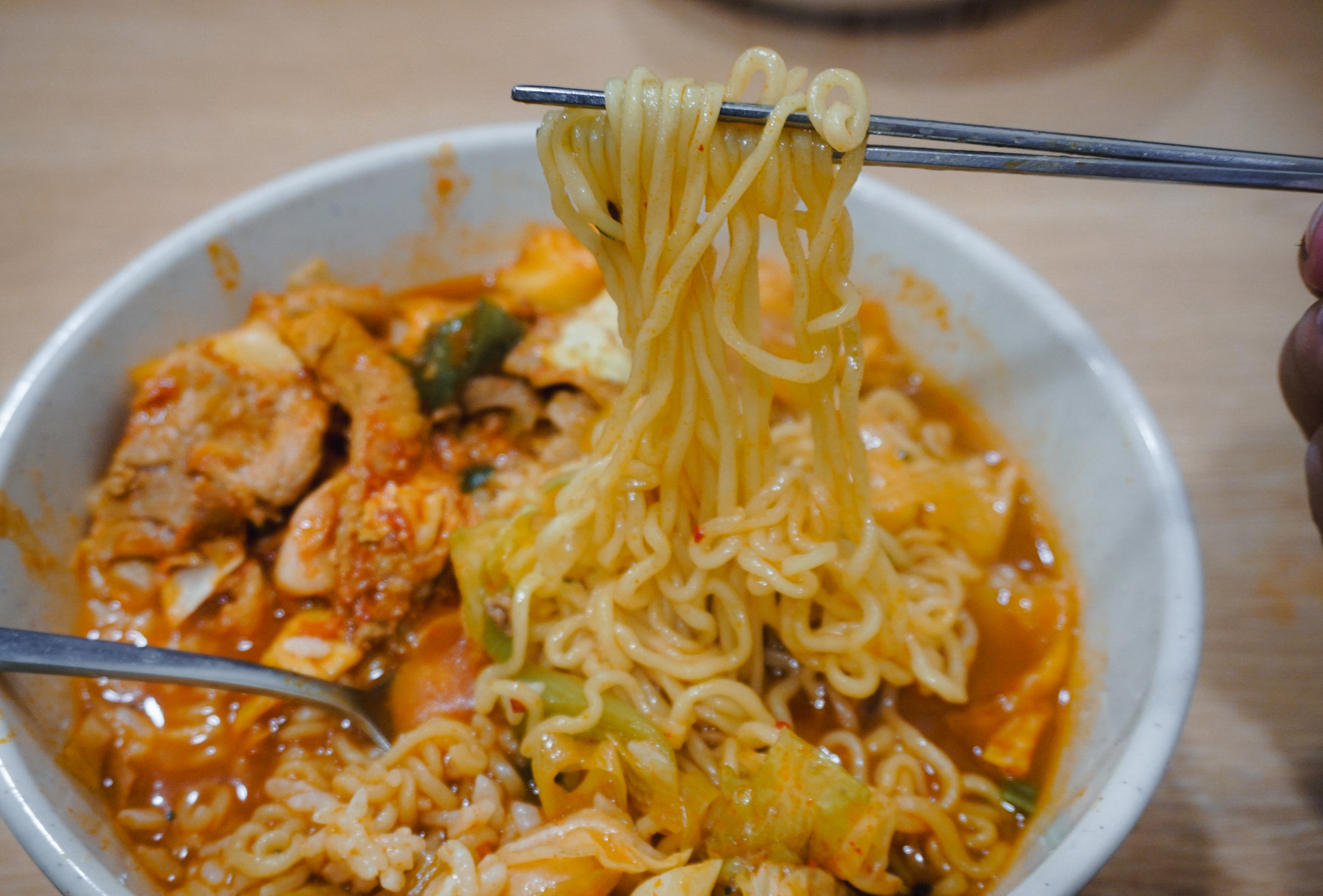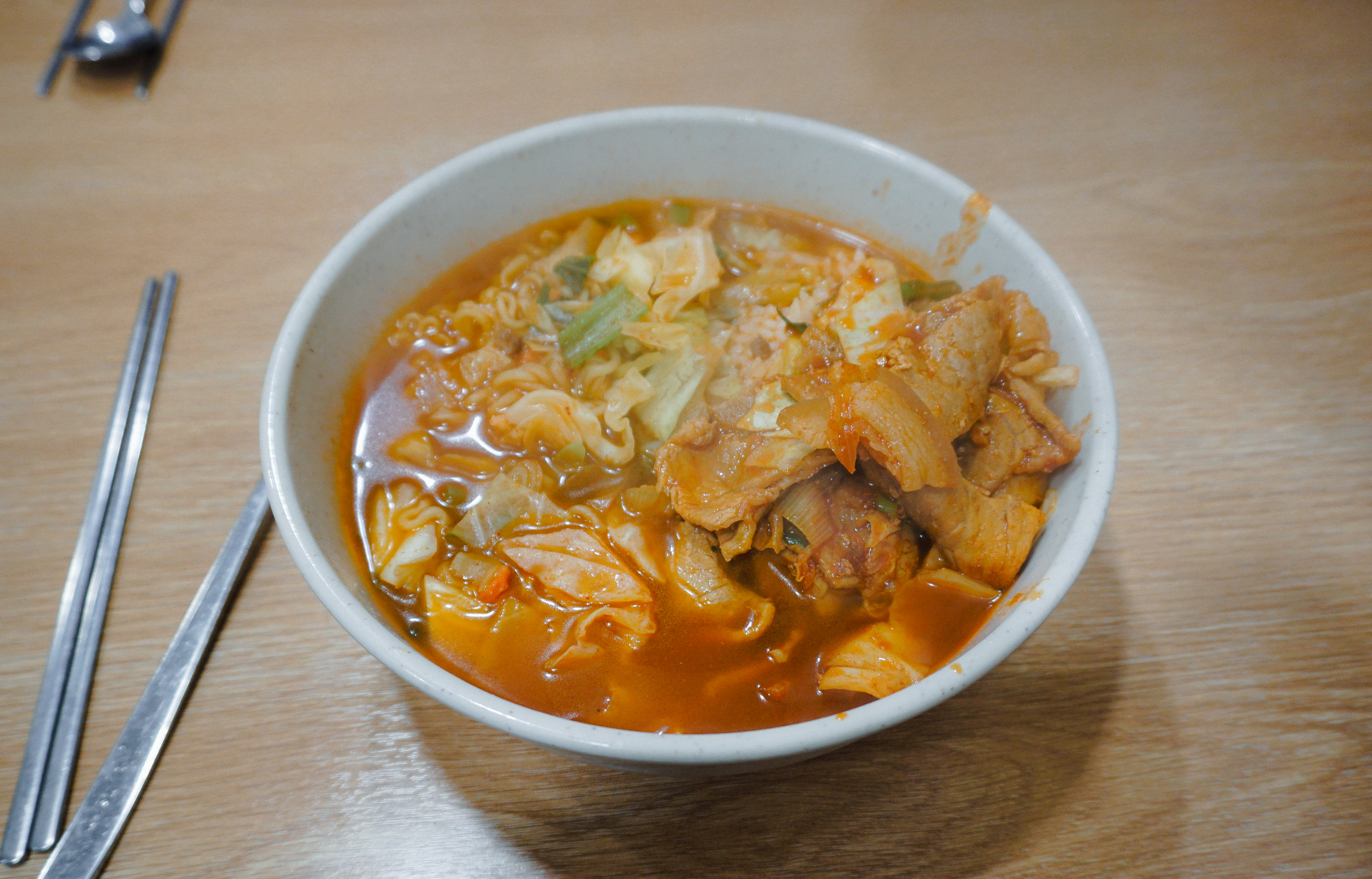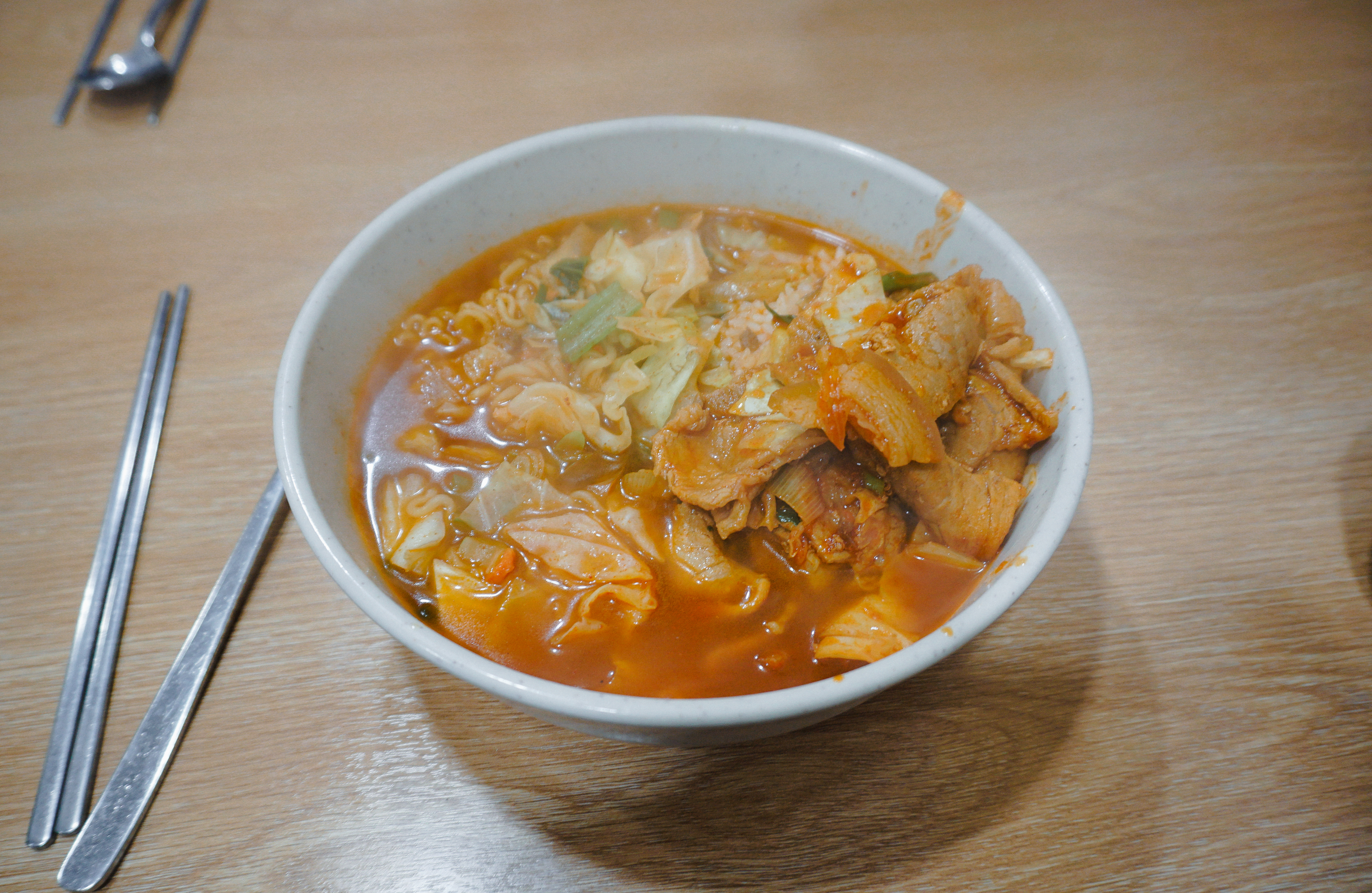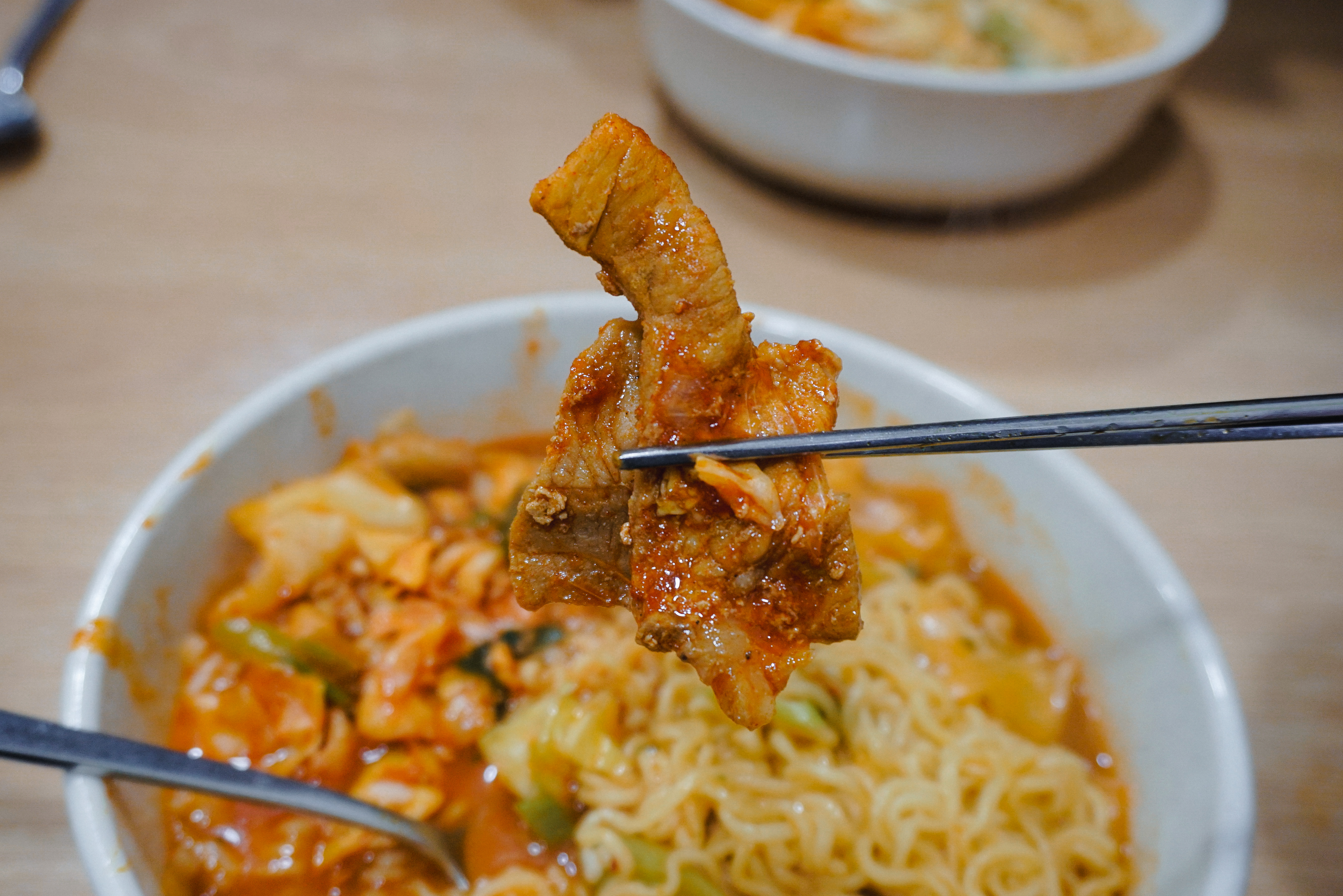 제육라면은 양배추와 함께 볶아낸 제육볶음과 라면 그리고 밥이 들어간 메뉴였습니다. 라면이나 밥은 아주머니께서 재량껏 양조절을 해주셨고, 생각보다 양을 많이 챙겨주셔서 배부르게 먹을 수 있었습니다.