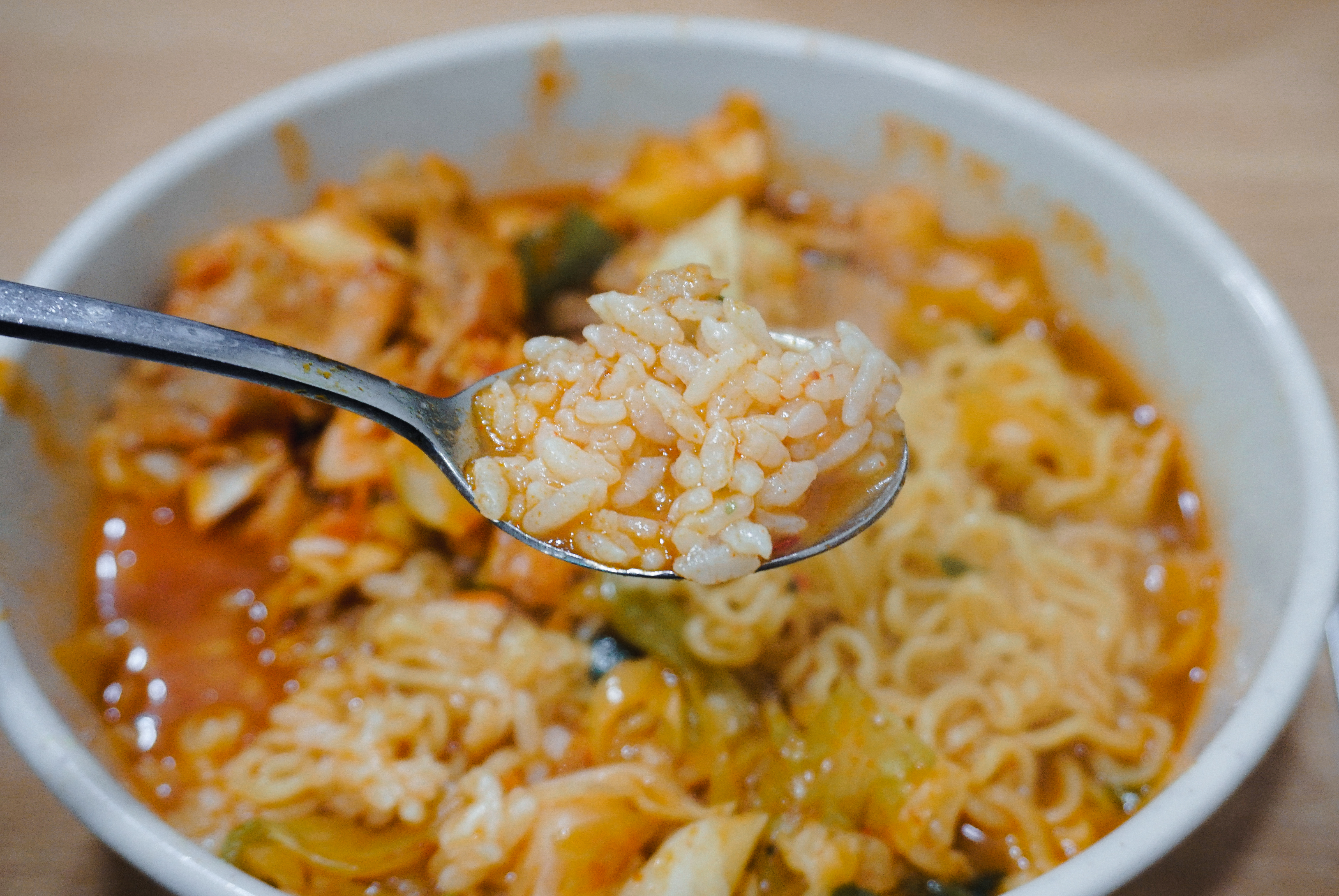 맛나분식 제육라면의 제육볶음은 살짝 식감이 퍽퍽했는데, 개인적으로 맛이 칼칼해서 입맛에 더 잘 맞았고, 라면의 꼬들한 식감을 선호하시는 분은 라면부터 건져서 드시는 것을 추천드립니다. 밥은 조금 퍼지게 해서 먹는 것도 나쁘지 않았습니다.