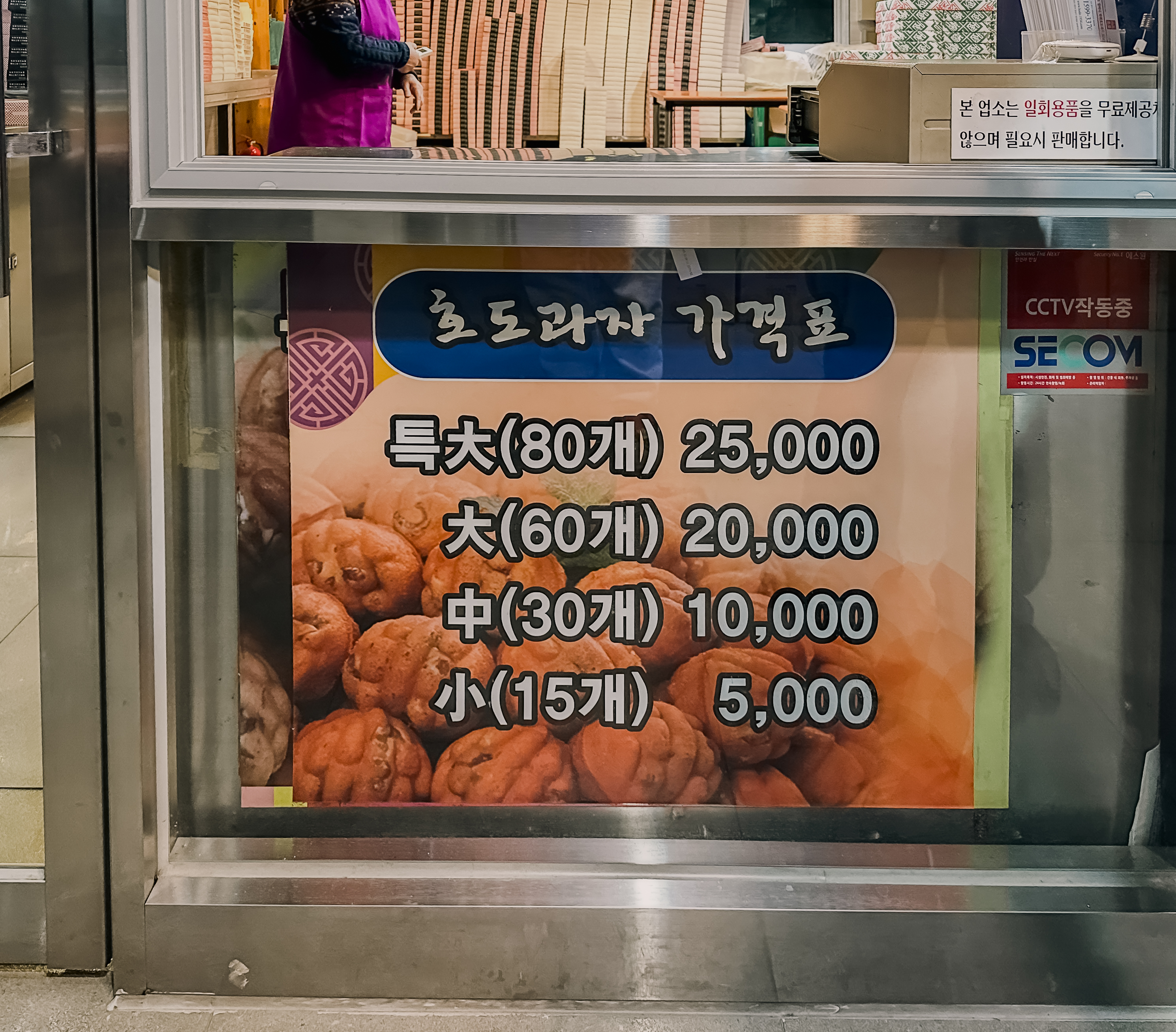 천안 학화 호두과자 본점에서 구입한 호두과자의 가격표는 15, 30, 60, 80 개로 각각 5,000, 10,000, 20,000, 25,000 원 이었습니다. 주문한 메뉴는 호두과자 15개가 들어있는 5,000원짜리 메뉴였습니다.