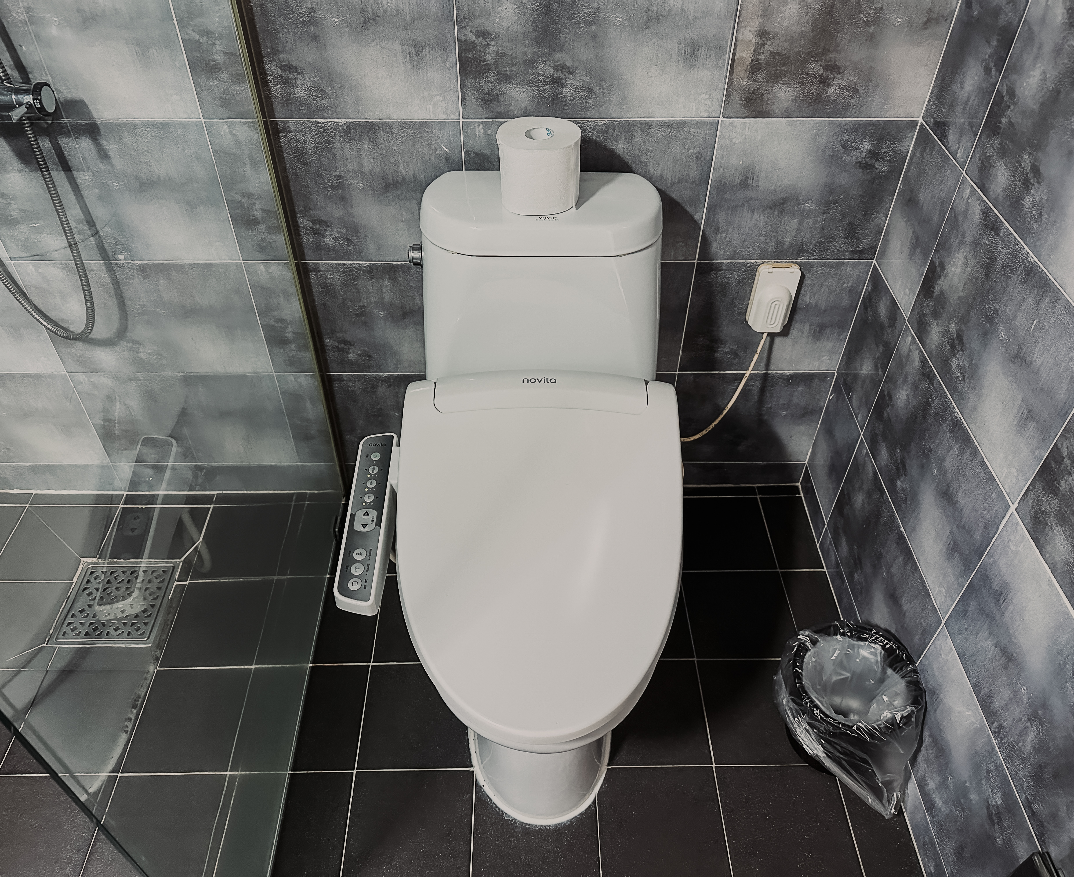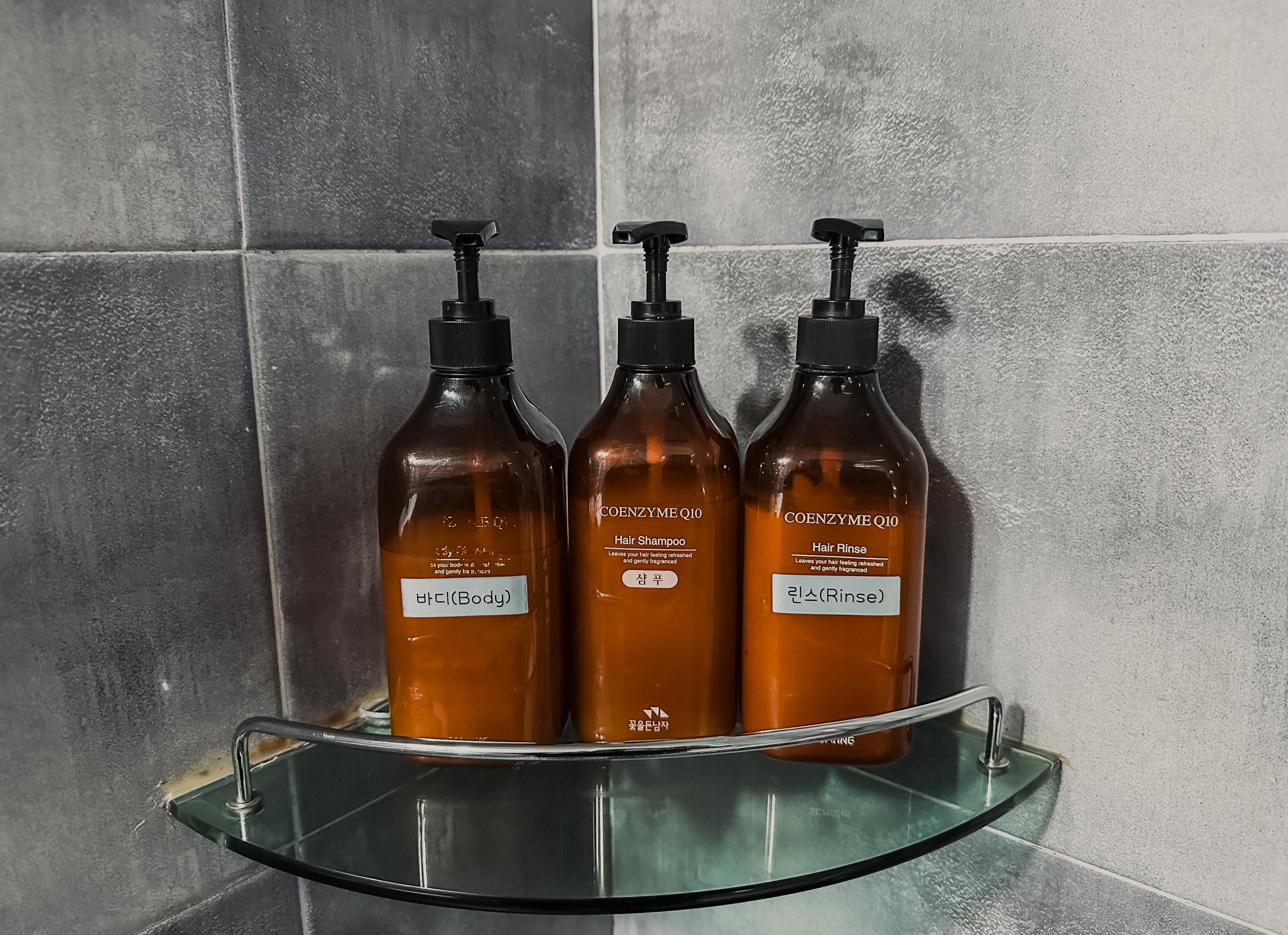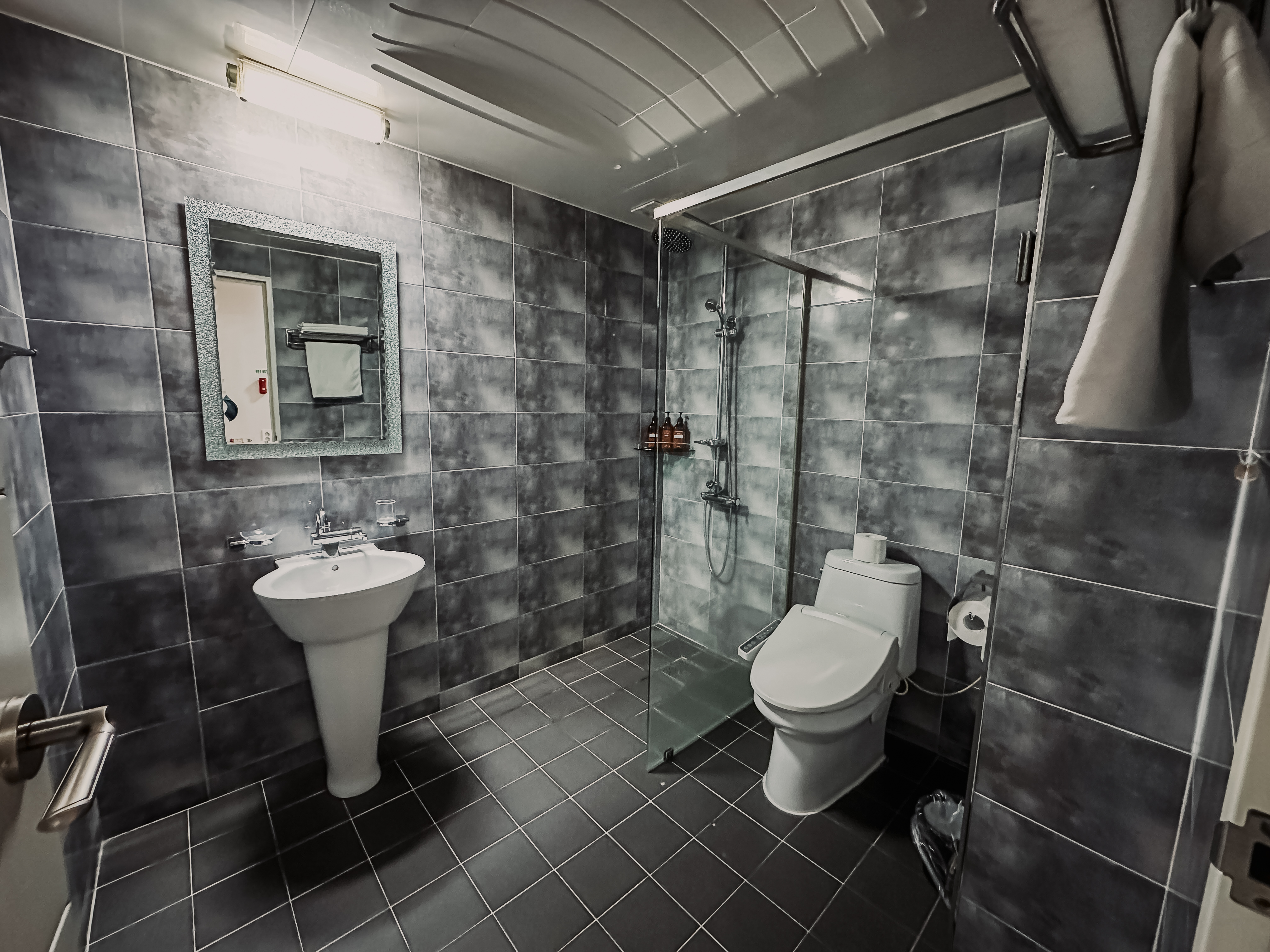 대산호텔의 욕실도 객실과 마찬가지로 광활한 크기를 자랑했습니다. 욕실에는 샤워부스와 세면대, 비데가 설치된 변기가 있었습니다. 인테리어도 전체적으로 깔끔하고 잘 관리되어 있어서 좋았습니다.