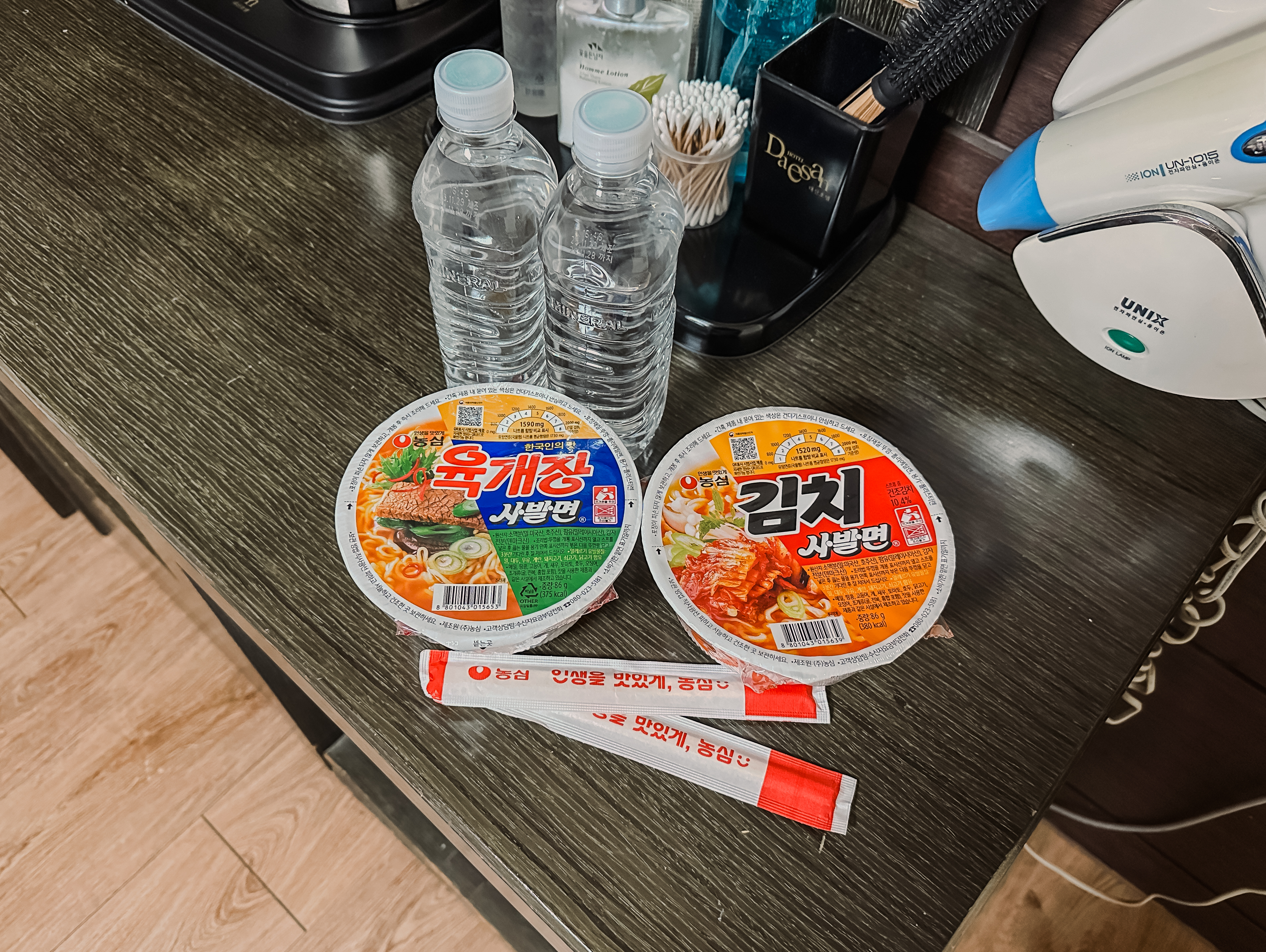침실에는 일반적인 숙소와 마찬가지로 간단한 검색용 PC와 커피포트, 테이블, 냉장고 등이 있었고, 저희는 1층에서 가져온 컵라면을 먹었습니다. 이제 욕실도 함께 확인하시죠.