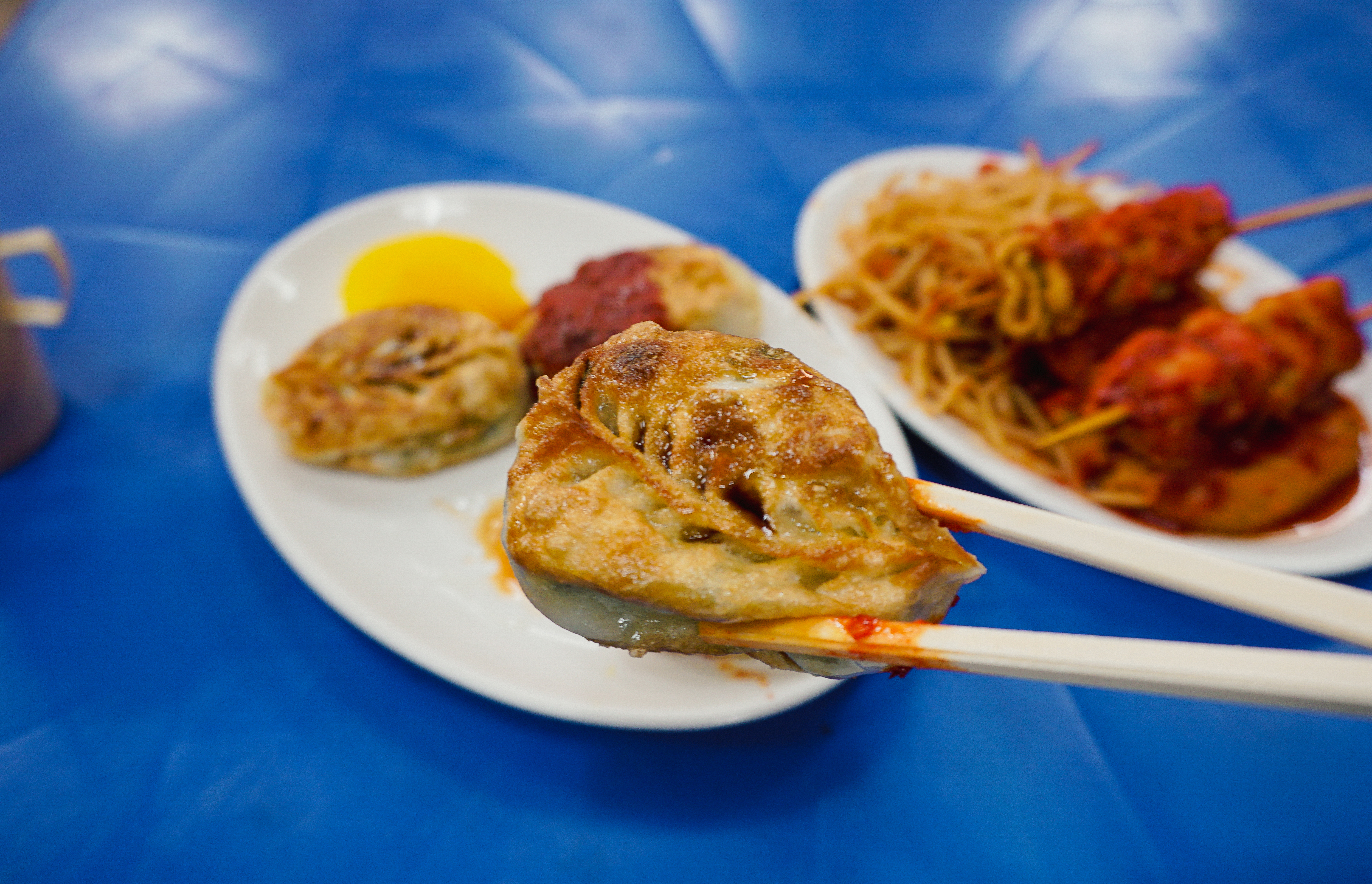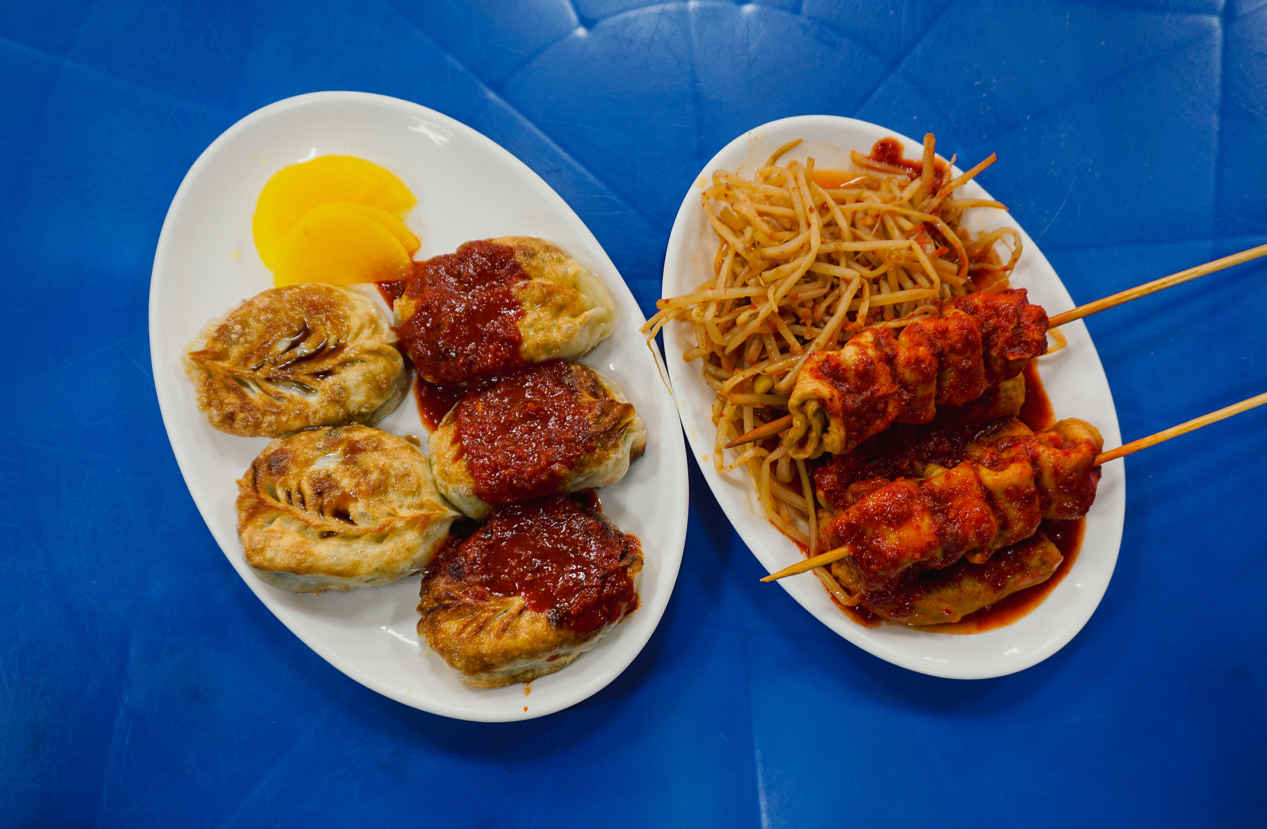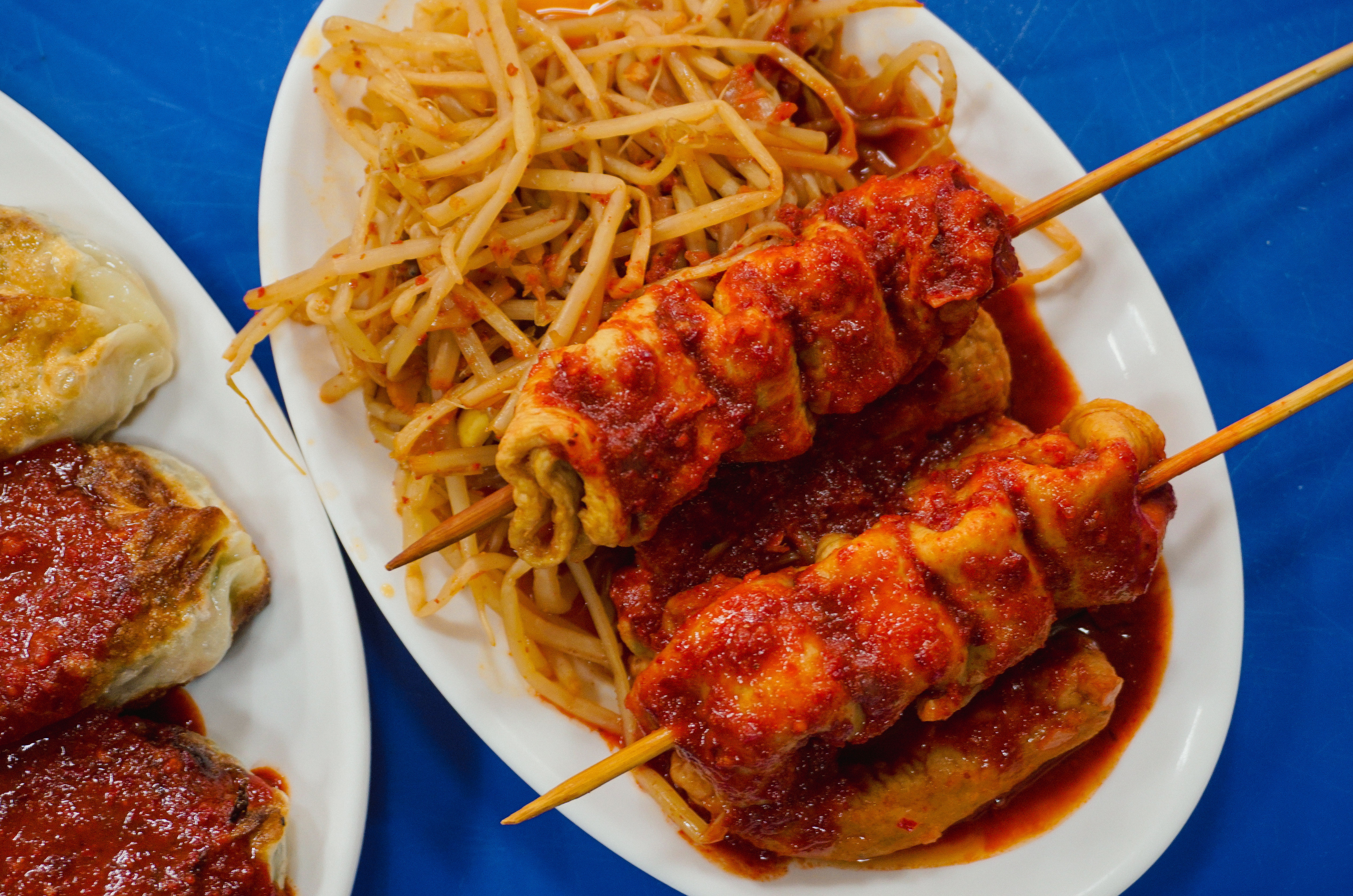 제가 주문한 메뉴는 군만두와 양념오뎅이었는데, 군만두는 양념을 절반정도 묻혀서 주시더라고요. 맛은 두부조림(?) 같은 양념이 느껴지더라고요. 그밖에 양념오뎅으로 불리는 어묵은 콩나물과 같이 곁들여 먹는다는 것이 신기했는데, 생각보다 먹을만하더라고요.