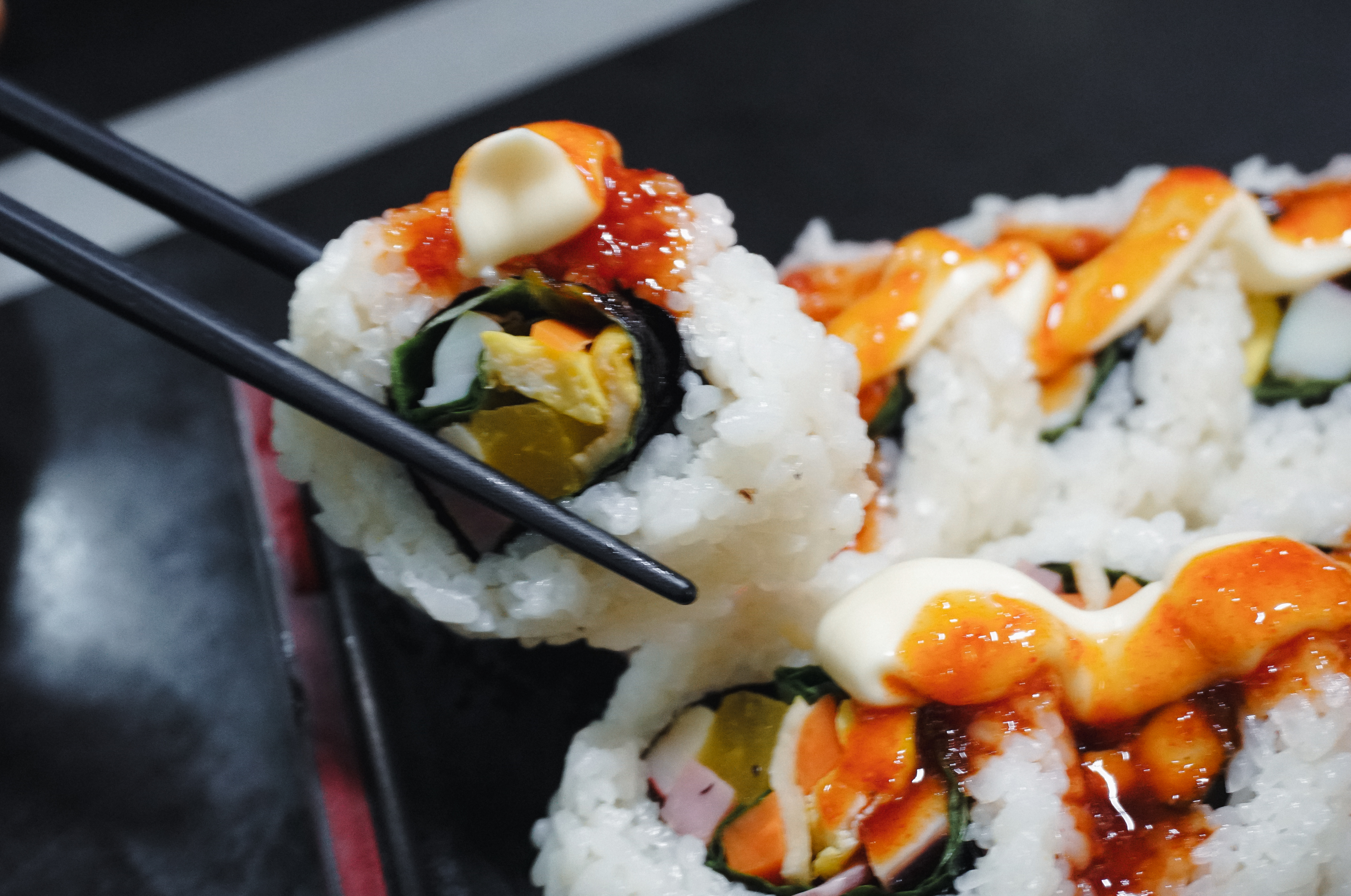 곧이어 주문한 김밥이 나왔습니다. 피클김밥과 오징어김밥 모두 김이 겉으로 나오는 형태가 아닌, 밥이 밖으로 나오는 형태의 김밥이었습니다. 각각의 특징을 소개해드리자면, 피클김밥은 달걀, 맛살, 단무지, 당근, 햄, 어묵, 깻잎 그리고 피클이 들어있었고, 오징어김밥은 달걀, 어묵, 햄, 당근, 깻잎, 오징어가 들어있었고, 소스로 초고추장과 마요네즈가 얹어 있었습니다.
