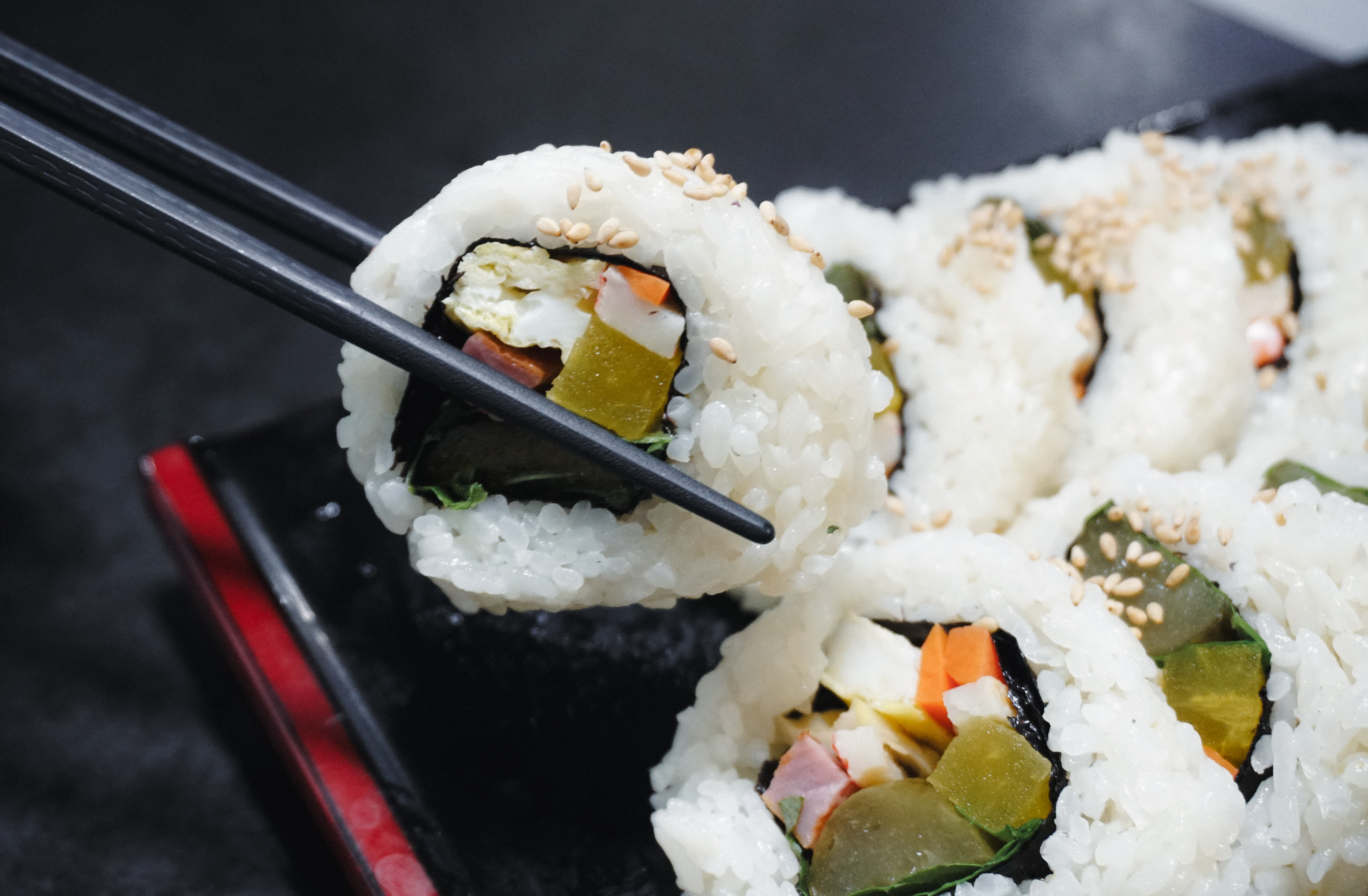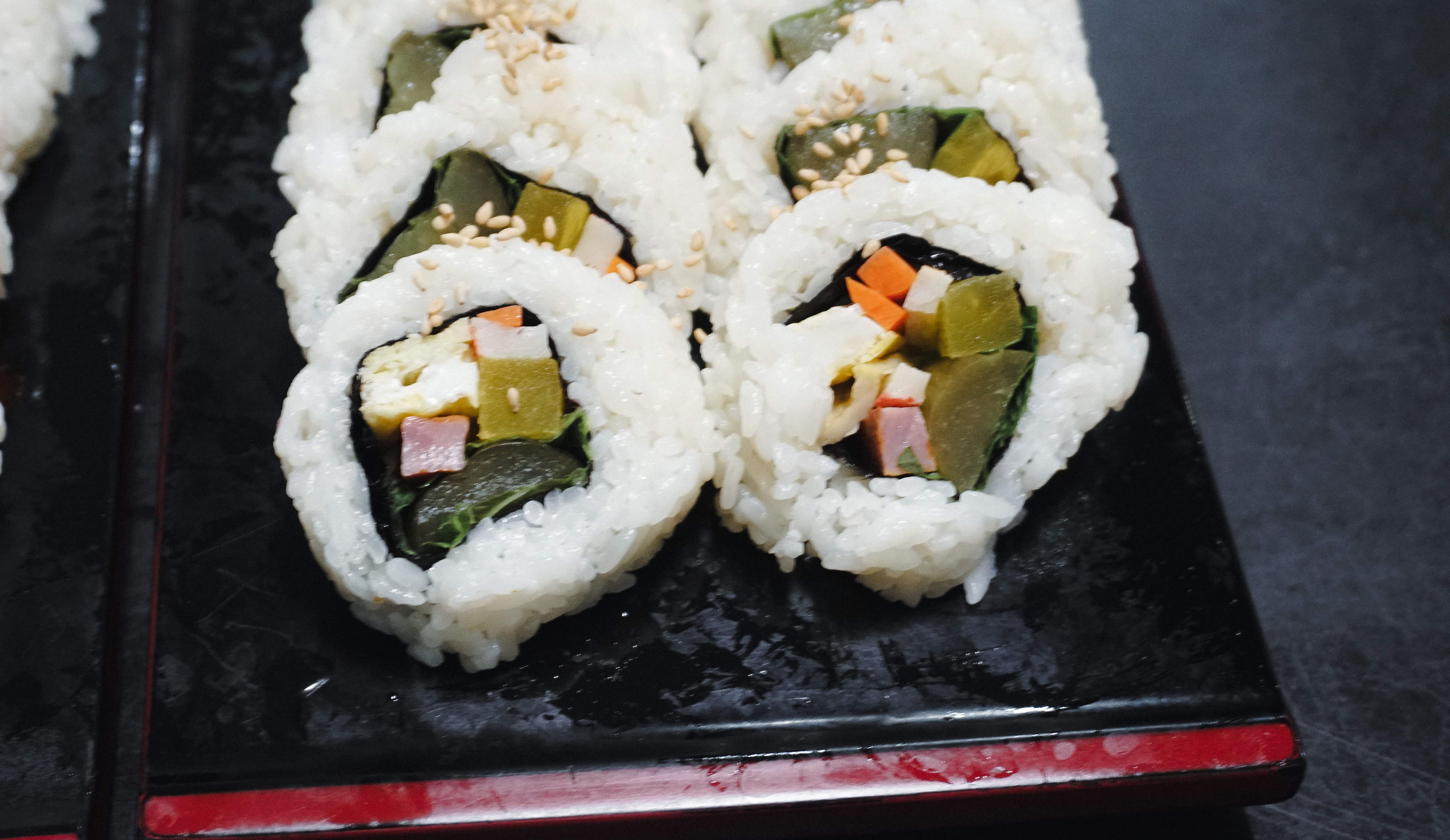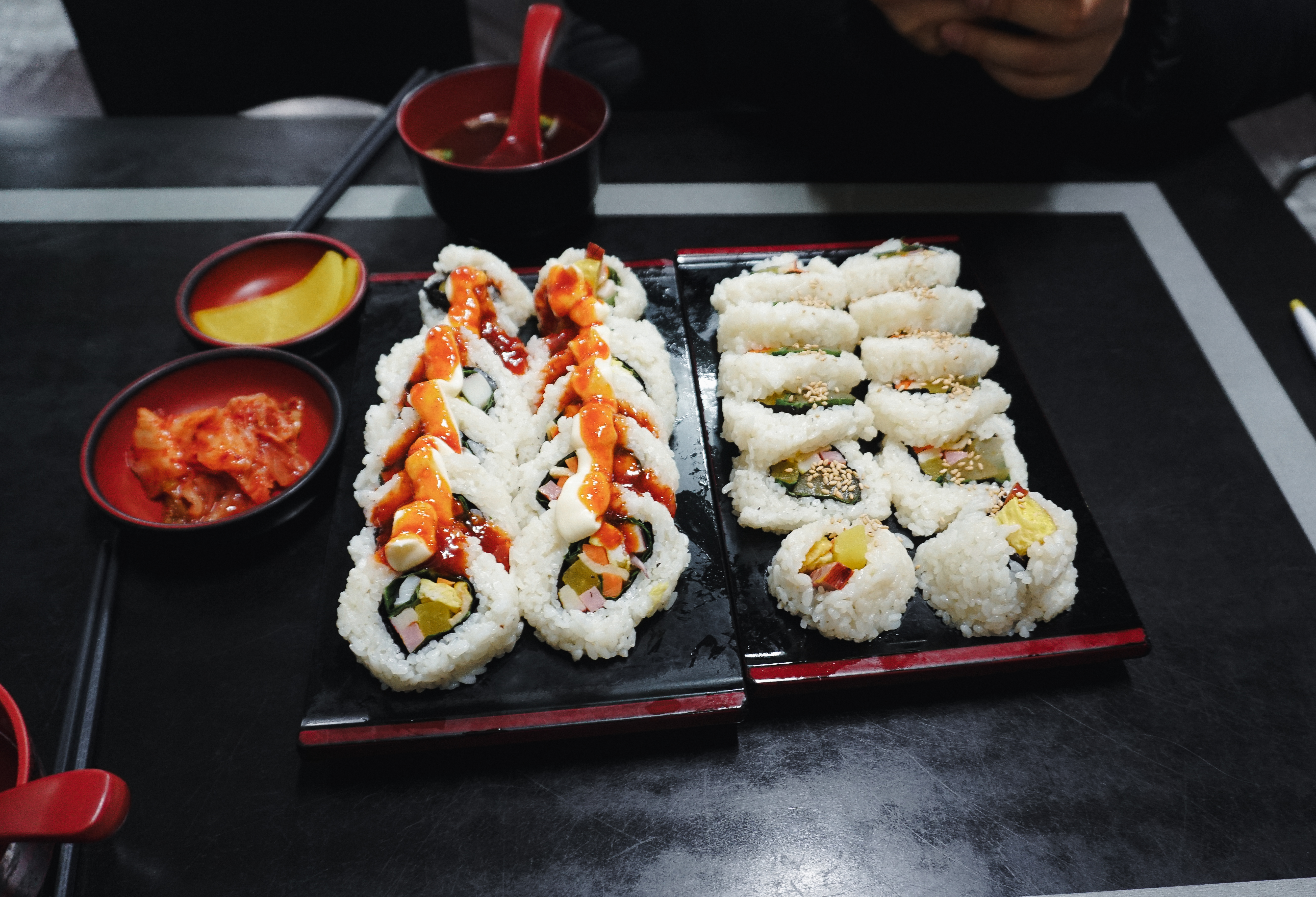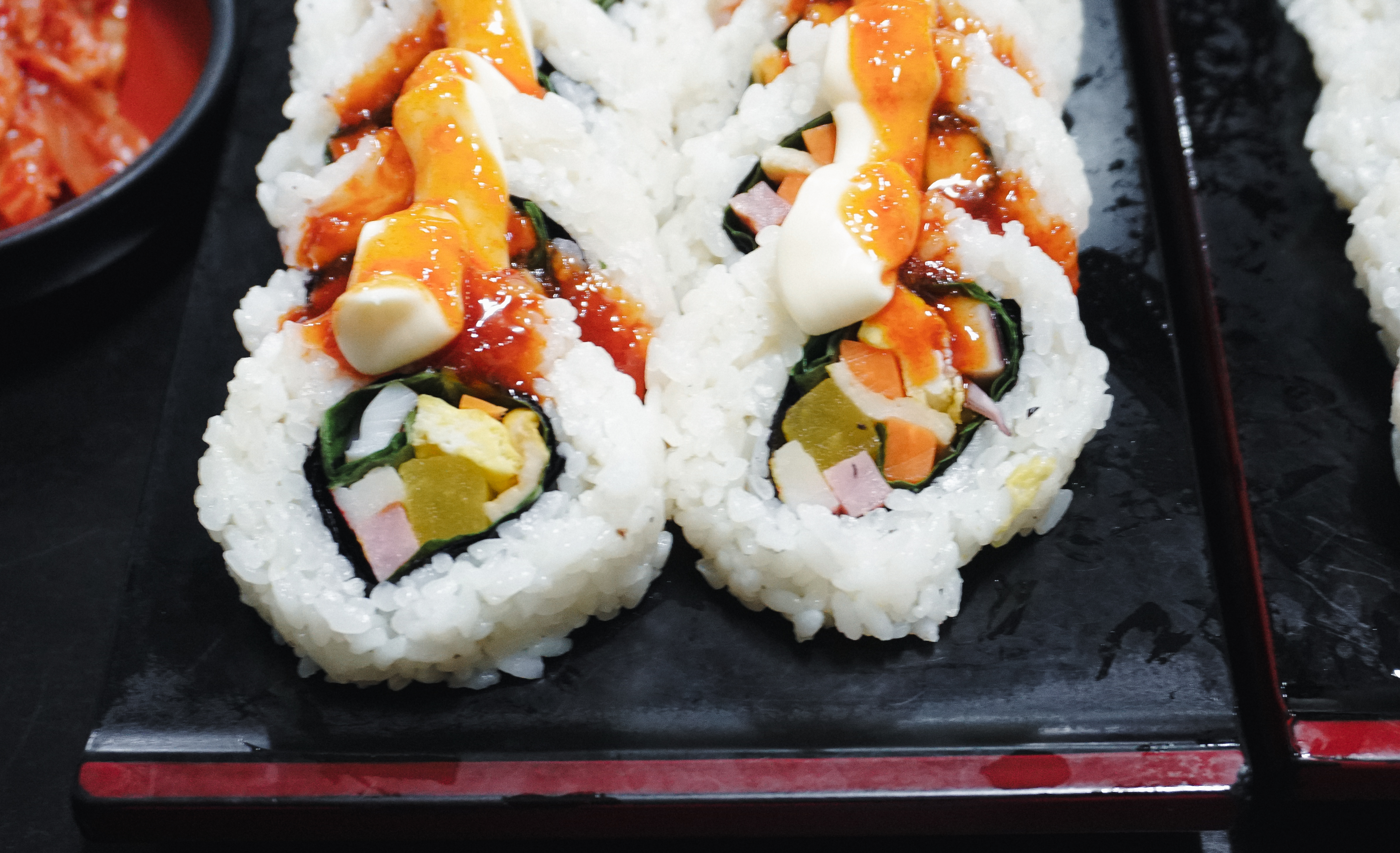 곧이어 주문한 김밥이 나왔습니다. 피클김밥과 오징어김밥 모두 김이 겉으로 나오는 형태가 아닌, 밥이 밖으로 나오는 형태의 김밥이었습니다. 각각의 특징을 소개해드리자면, 피클김밥은 달걀, 맛살, 단무지, 당근, 햄, 어묵, 깻잎 그리고 피클이 들어있었고, 오징어김밥은 달걀, 어묵, 햄, 당근, 깻잎, 오징어가 들어있었고, 소스로 초고추장과 마요네즈가 얹어 있었습니다.